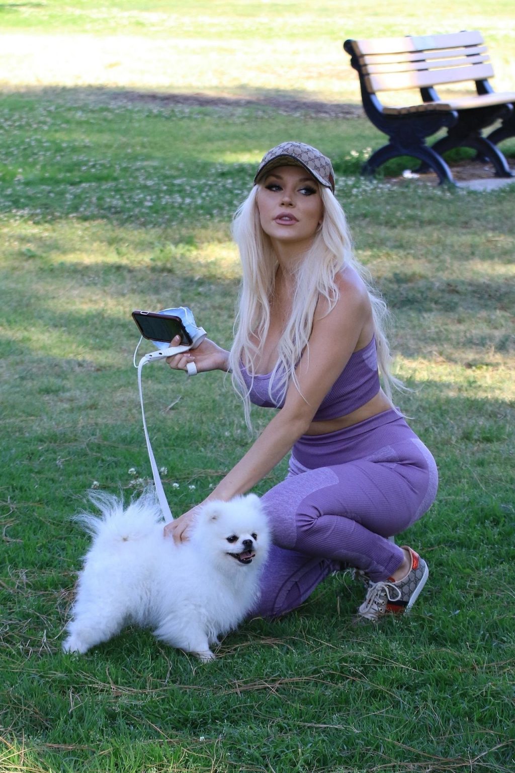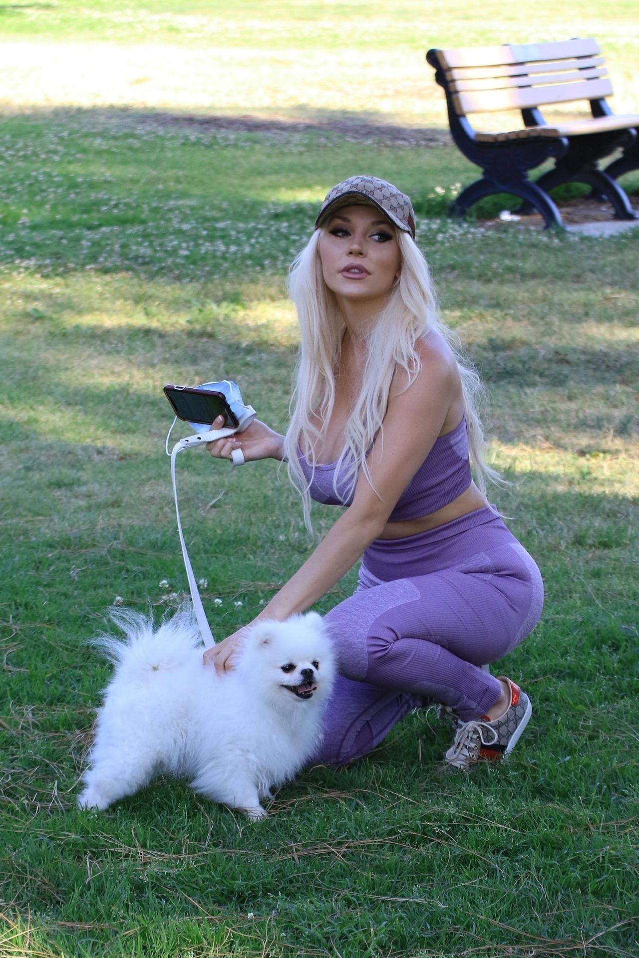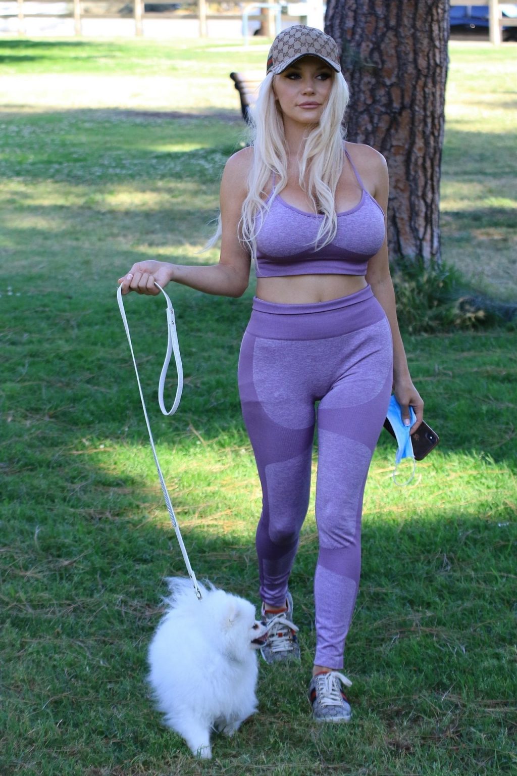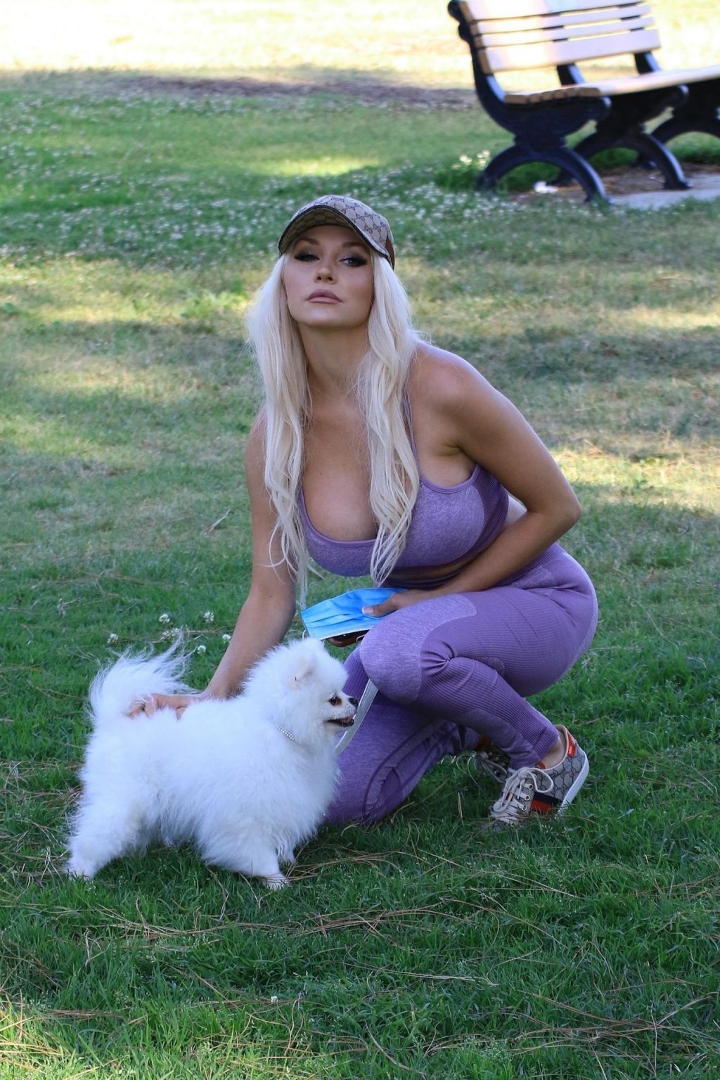 A sexy loira Courtney Stodden passeia com seu cachorro em Moorpark, em Studio City, 28/05/2020. A modelo/cantora exibe seu decote profundo, vestindo um conjunto roxo de academia de duas peças.