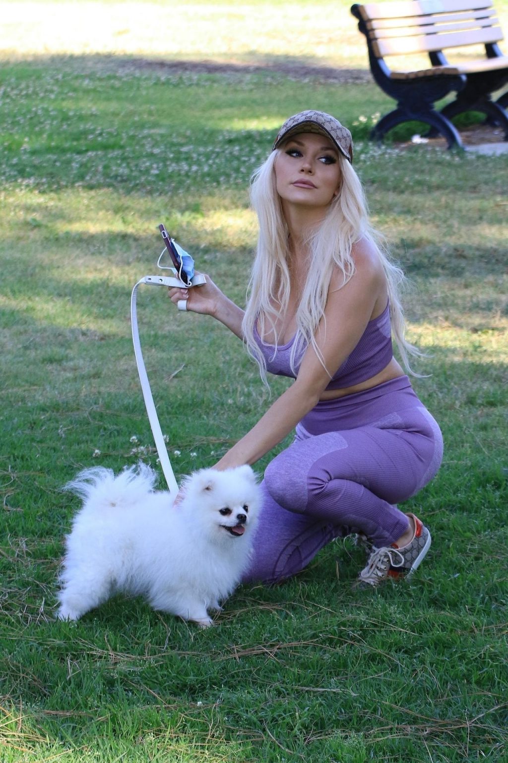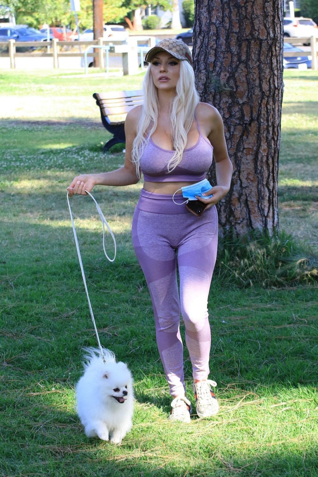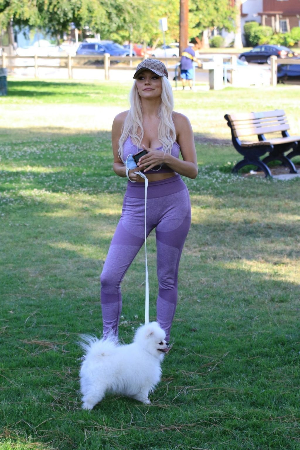 A sexy loira Courtney Stodden passeia com seu cachorro em Moorpark, em Studio City, 28/05/2020. A modelo/cantora exibe seu decote profundo, vestindo um conjunto roxo de academia de duas peças.