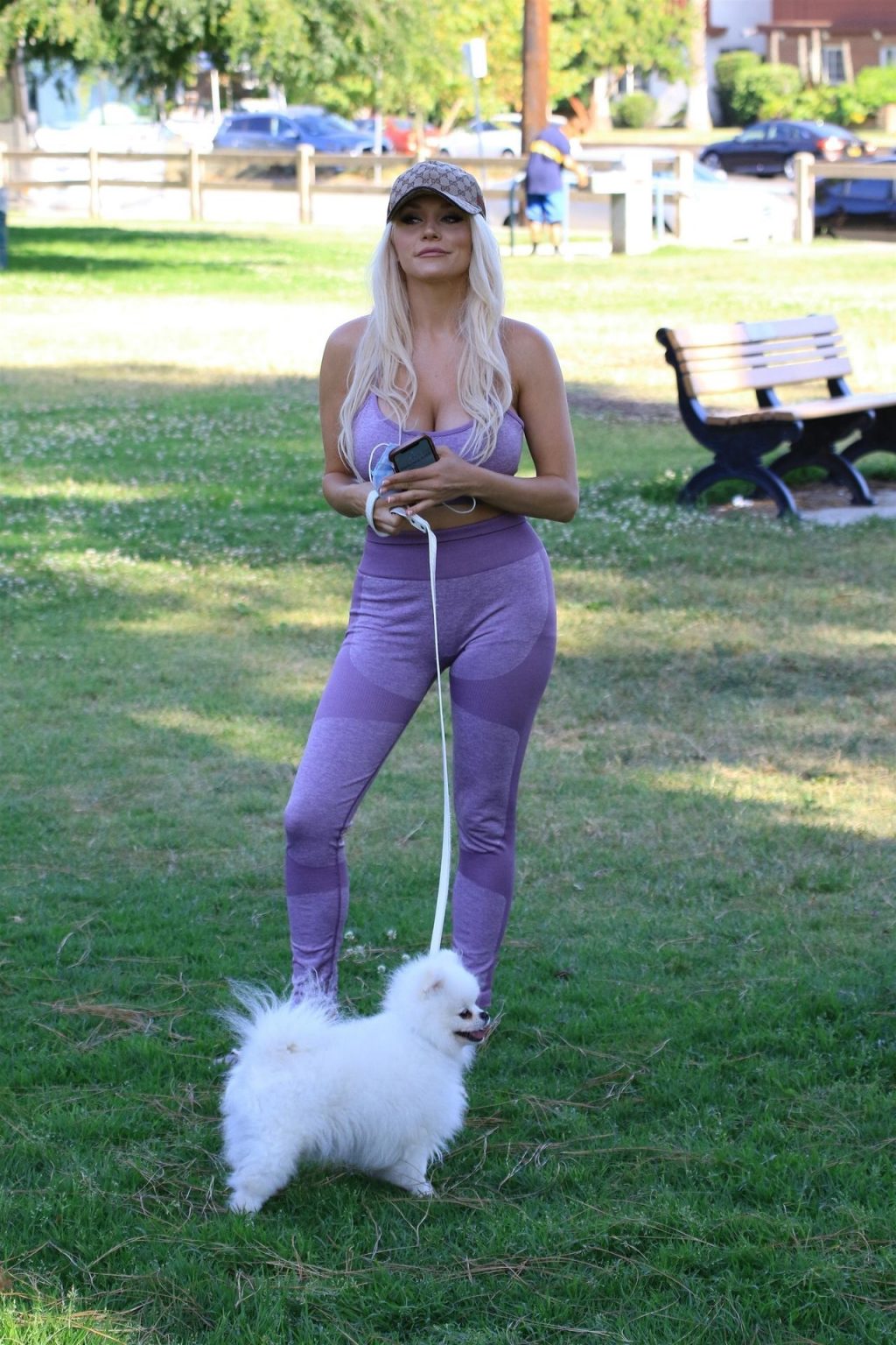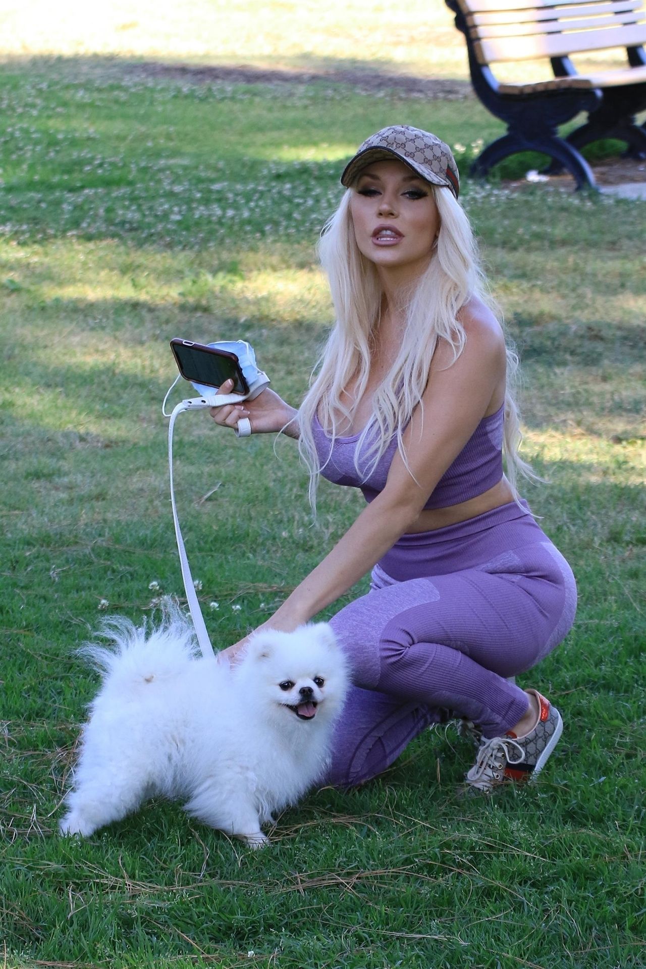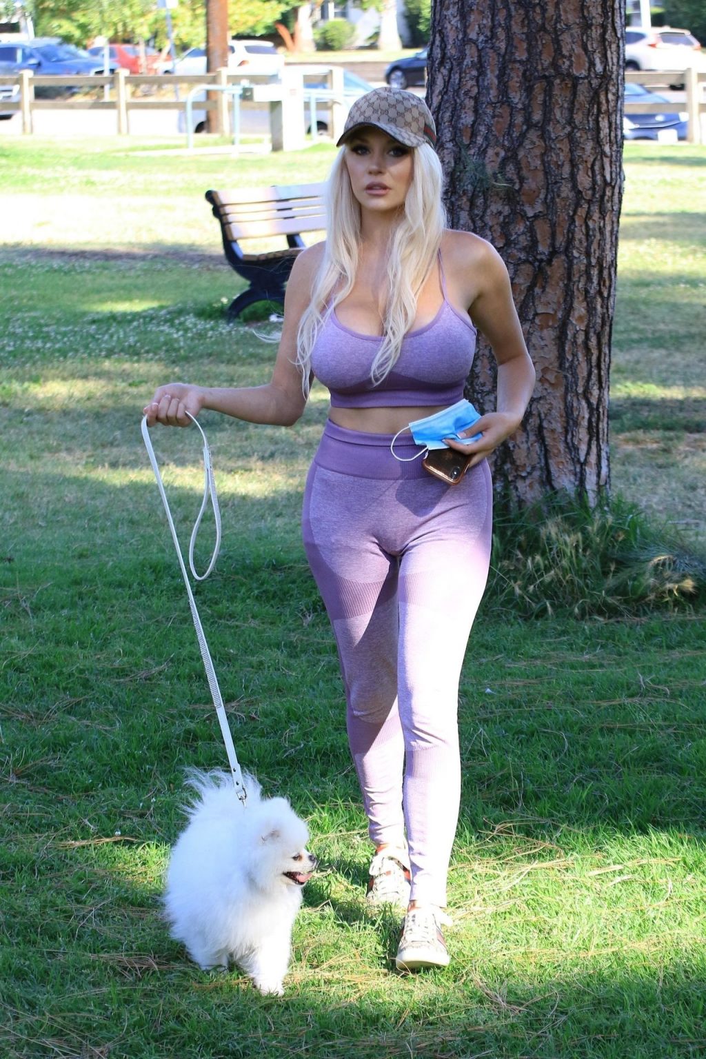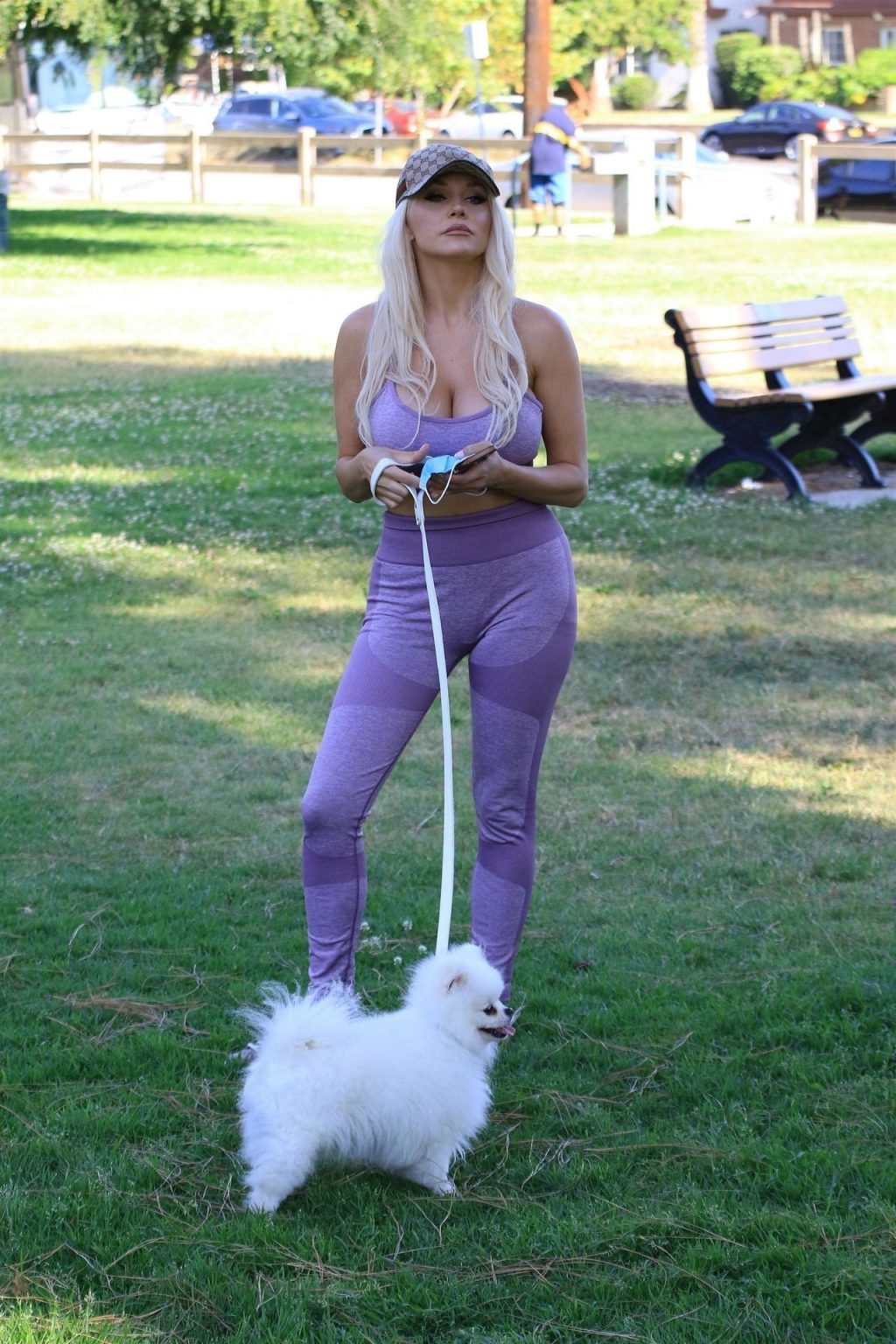 A sexy loira Courtney Stodden passeia com seu cachorro em Moorpark, em Studio City, 28/05/2020. A modelo/cantora exibe seu decote profundo, vestindo um conjunto roxo de academia de duas peças.