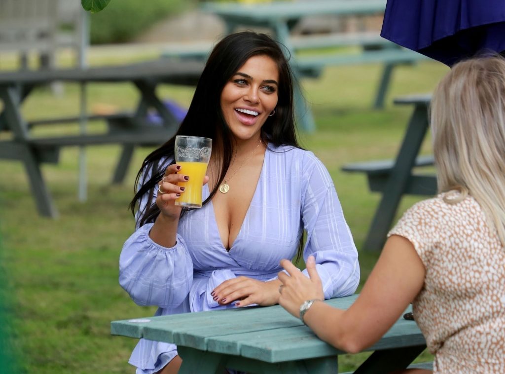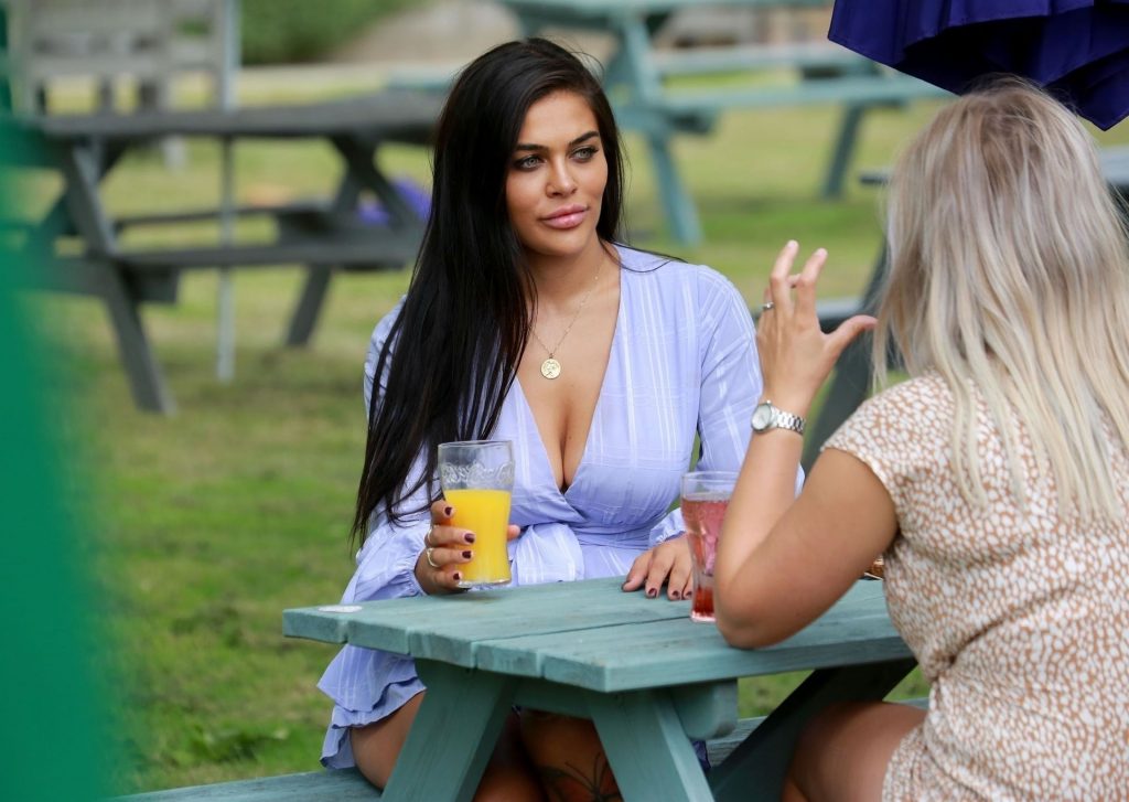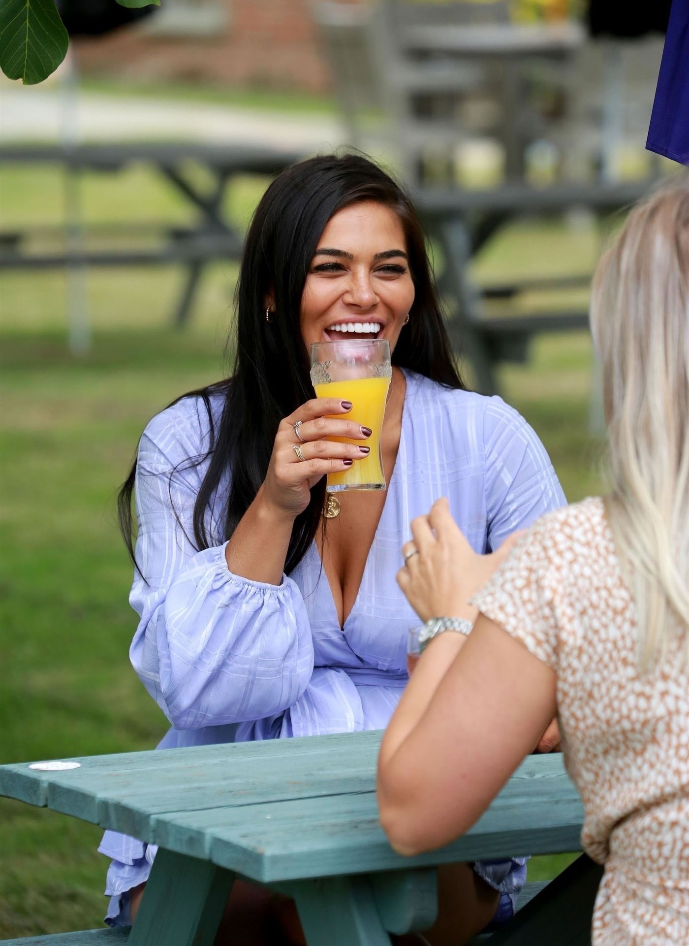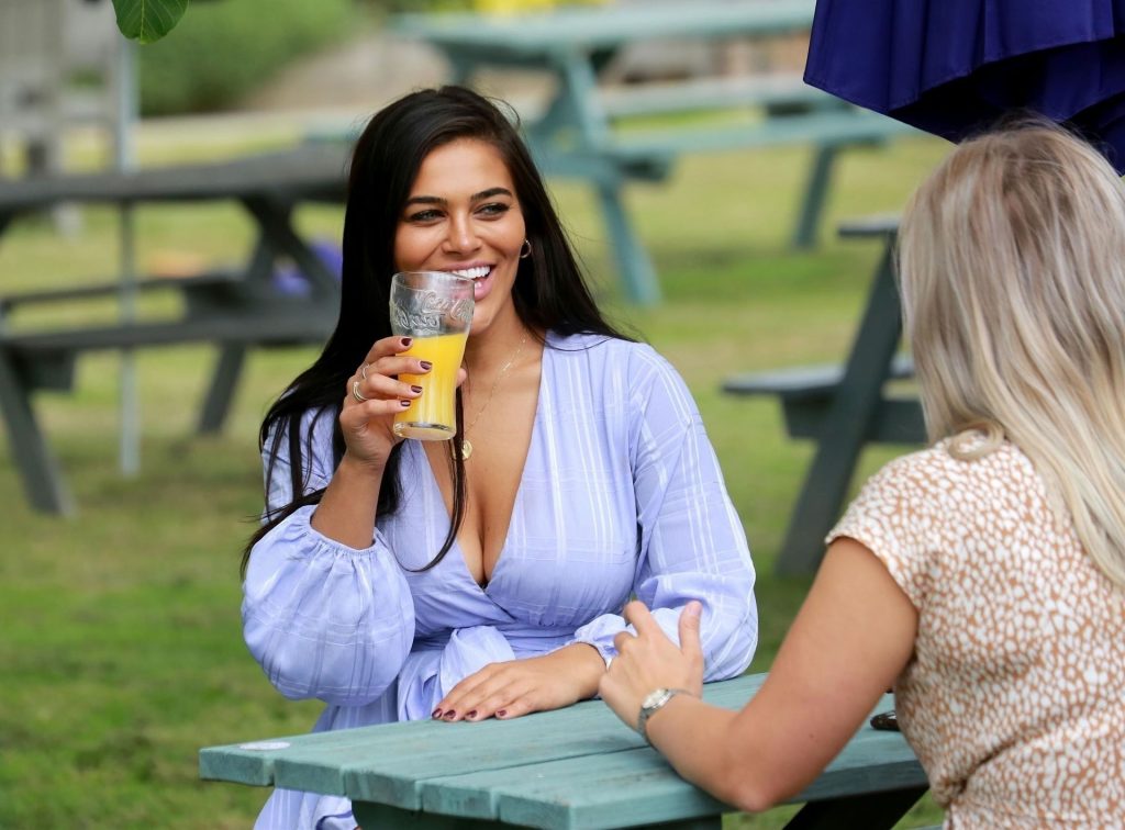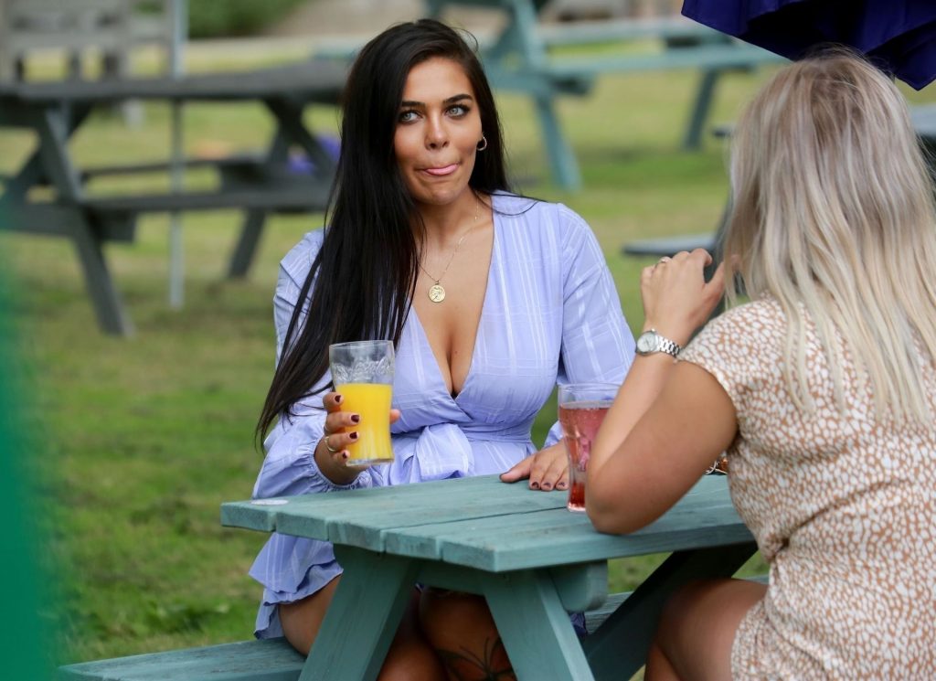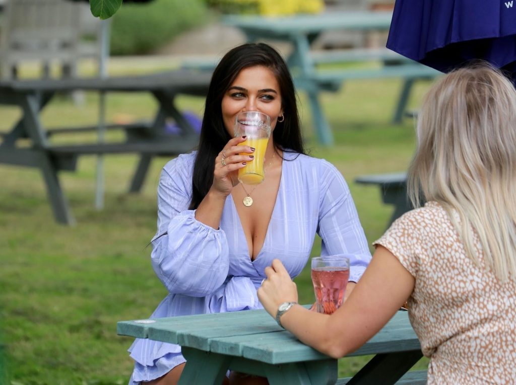 A estrela do reality show da Netflix ‘Too Hot to Handle’, Lydia Clyma, aproveita o clima quente do Reino Unido com uma bebida refrescante e uma boa conversa com uma amiga no jardim de cerveja de um pub perto de sua casa em Portsmouth, 17/07/2020.