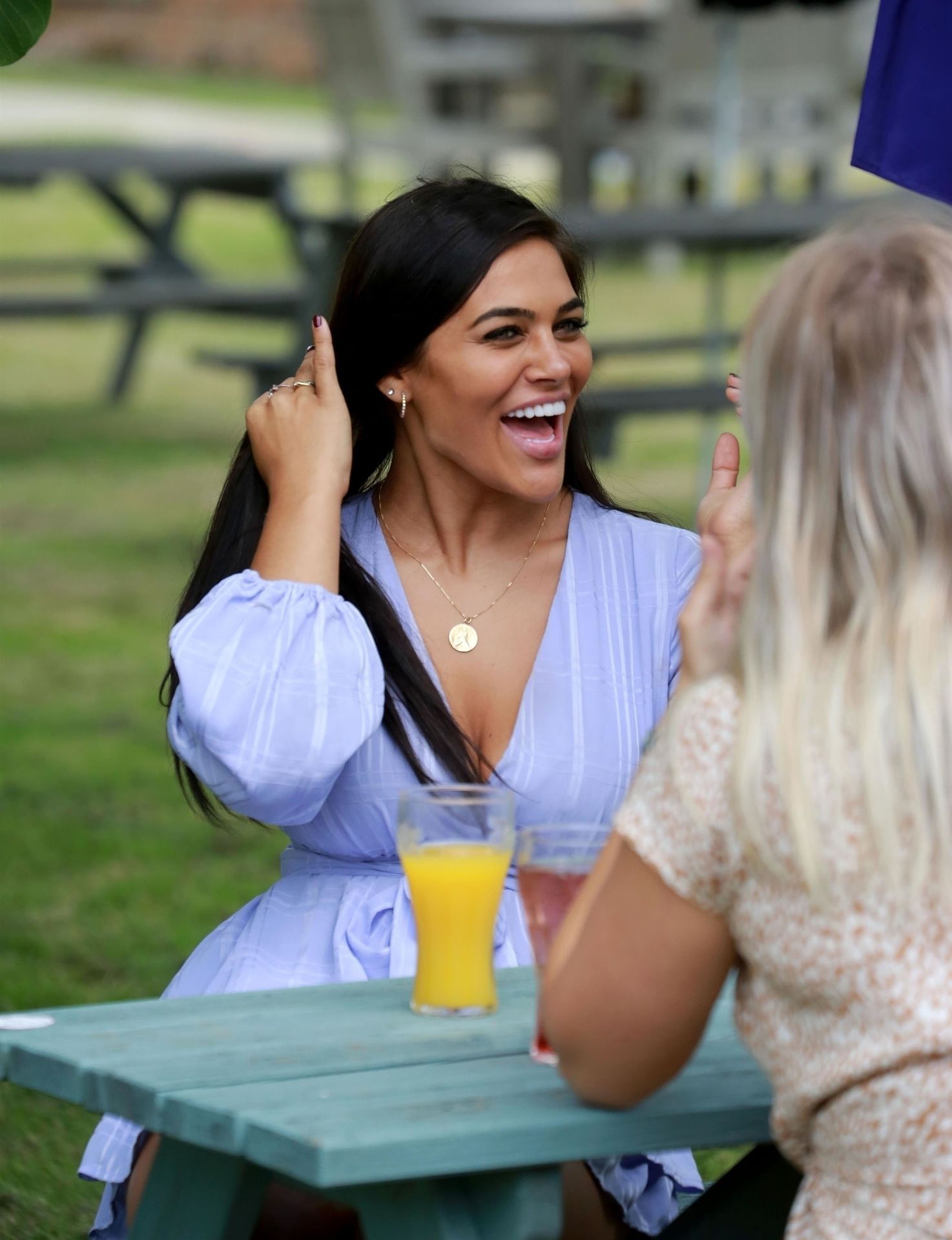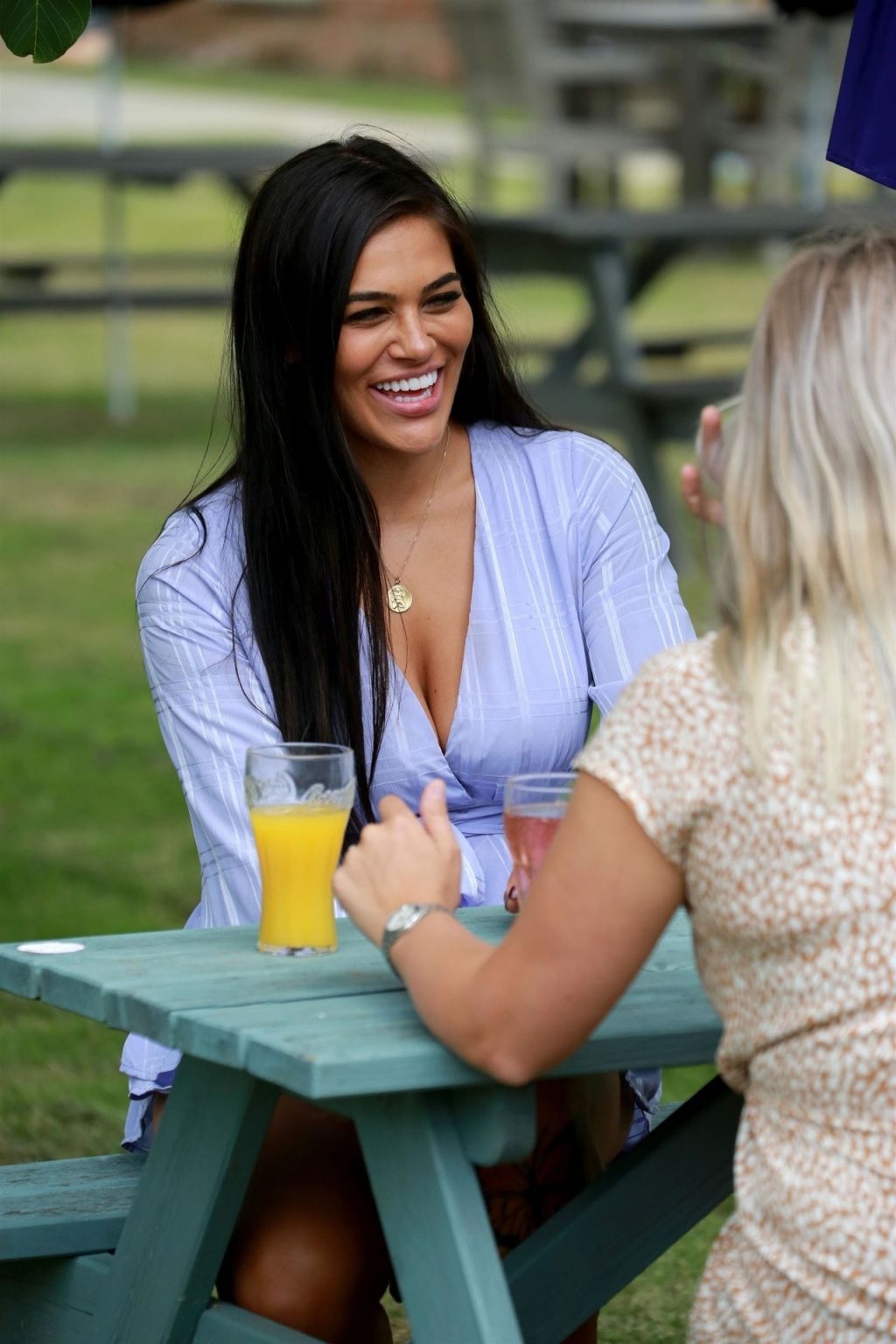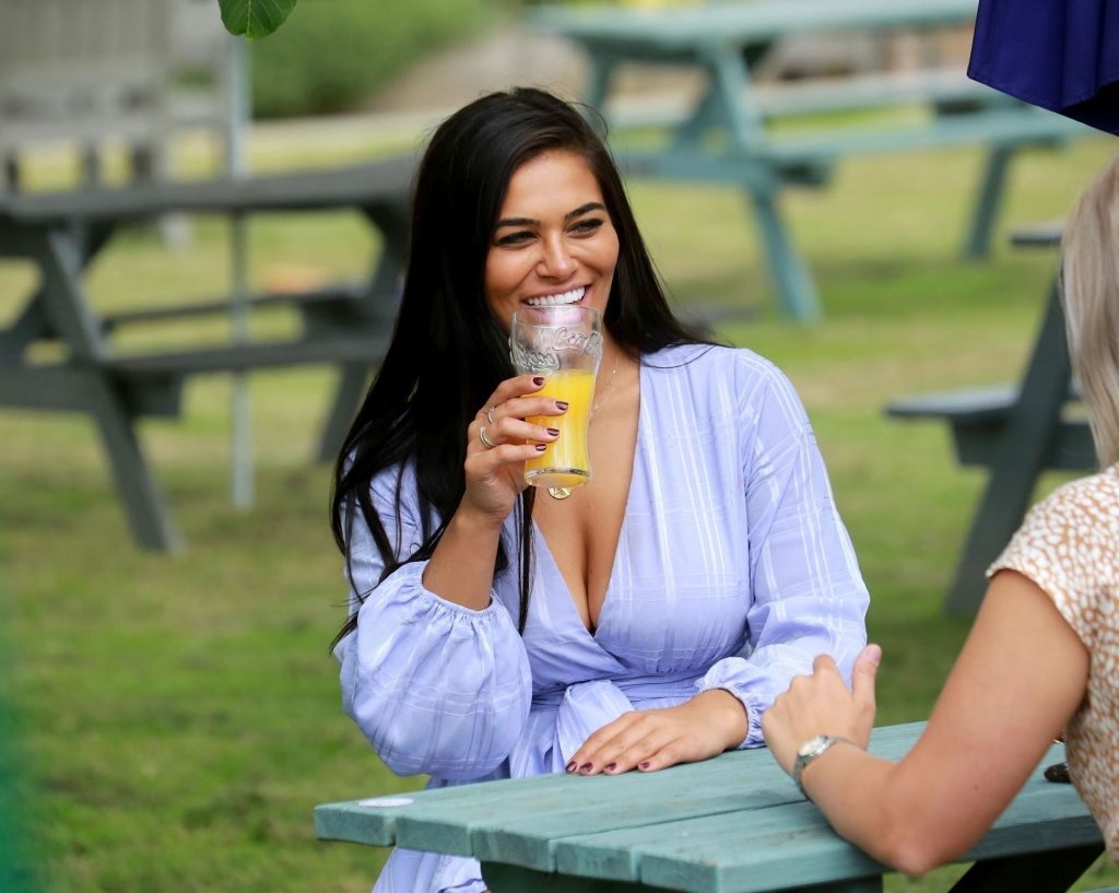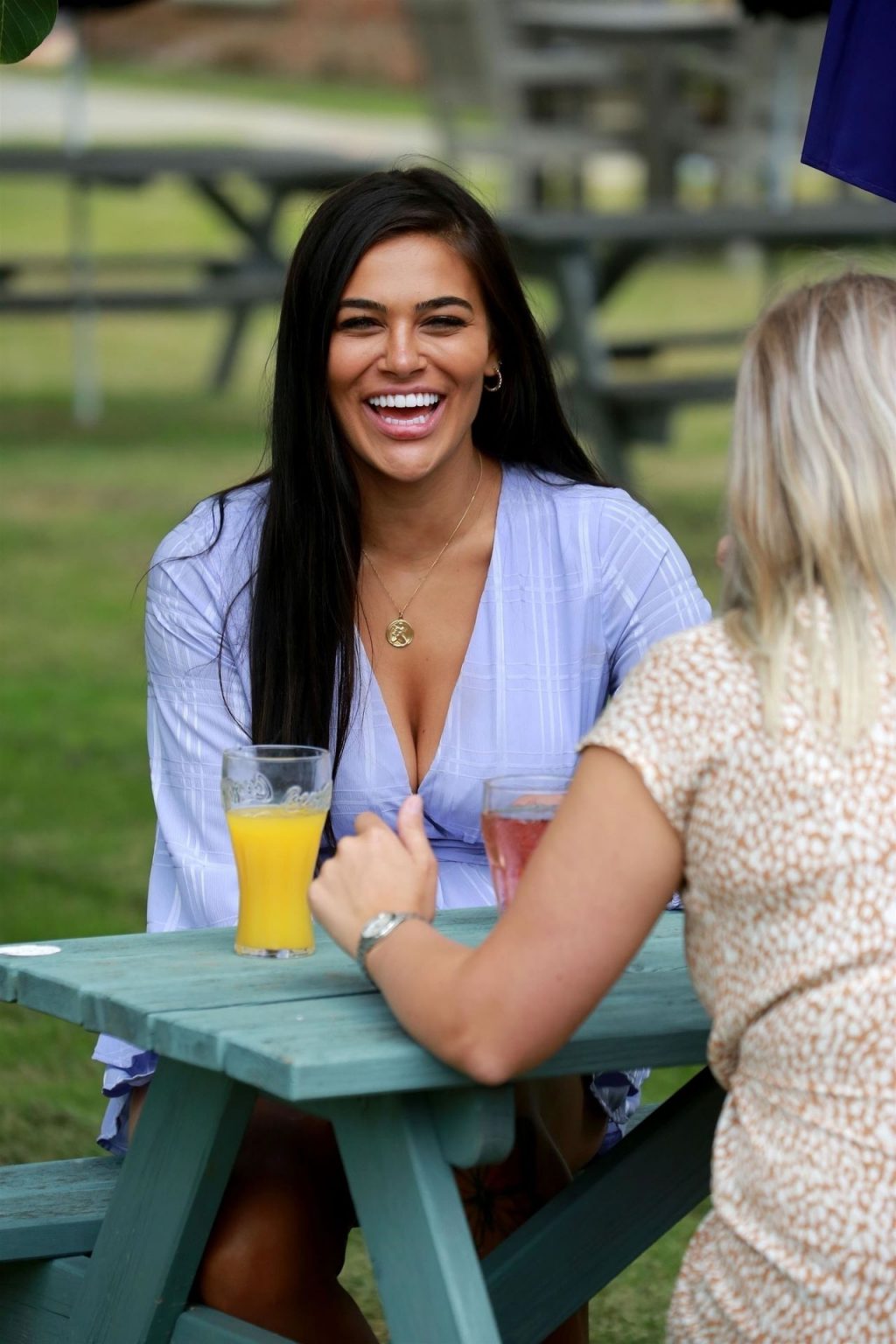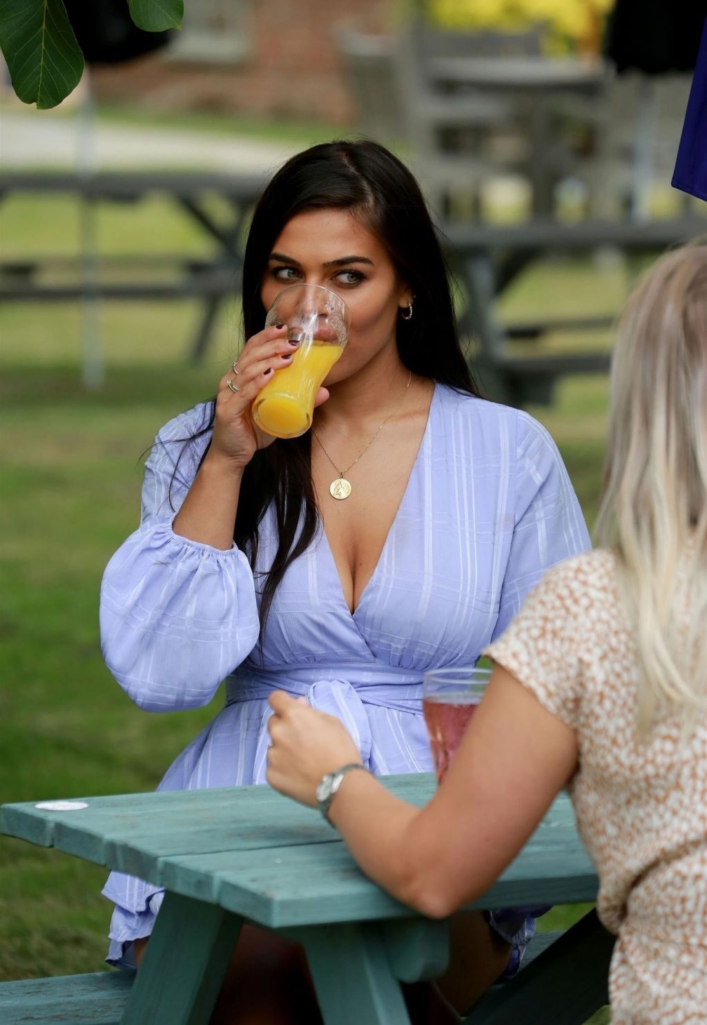 A estrela do reality show da Netflix ‘Too Hot to Handle’, Lydia Clyma, aproveita o clima quente do Reino Unido com uma bebida refrescante e uma boa conversa com uma amiga no jardim de cerveja de um pub perto de sua casa em Portsmouth, 17/07/2020.