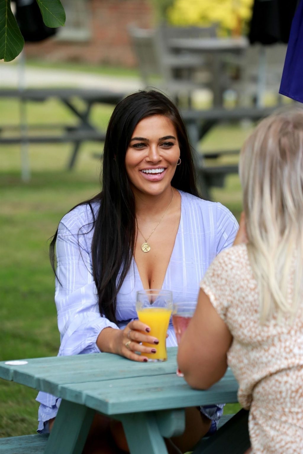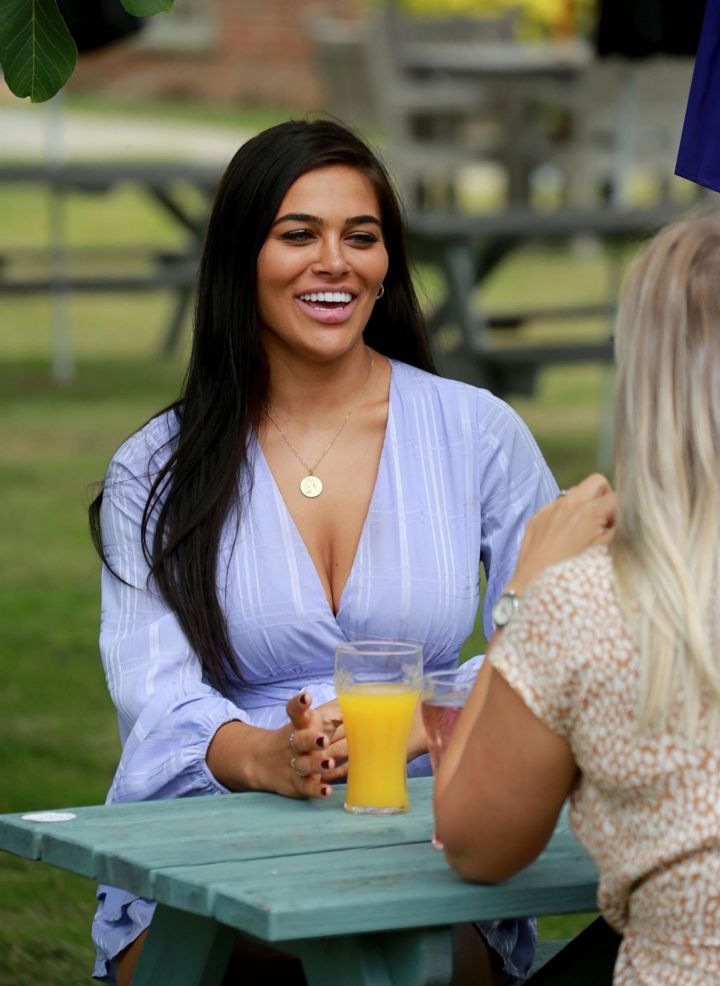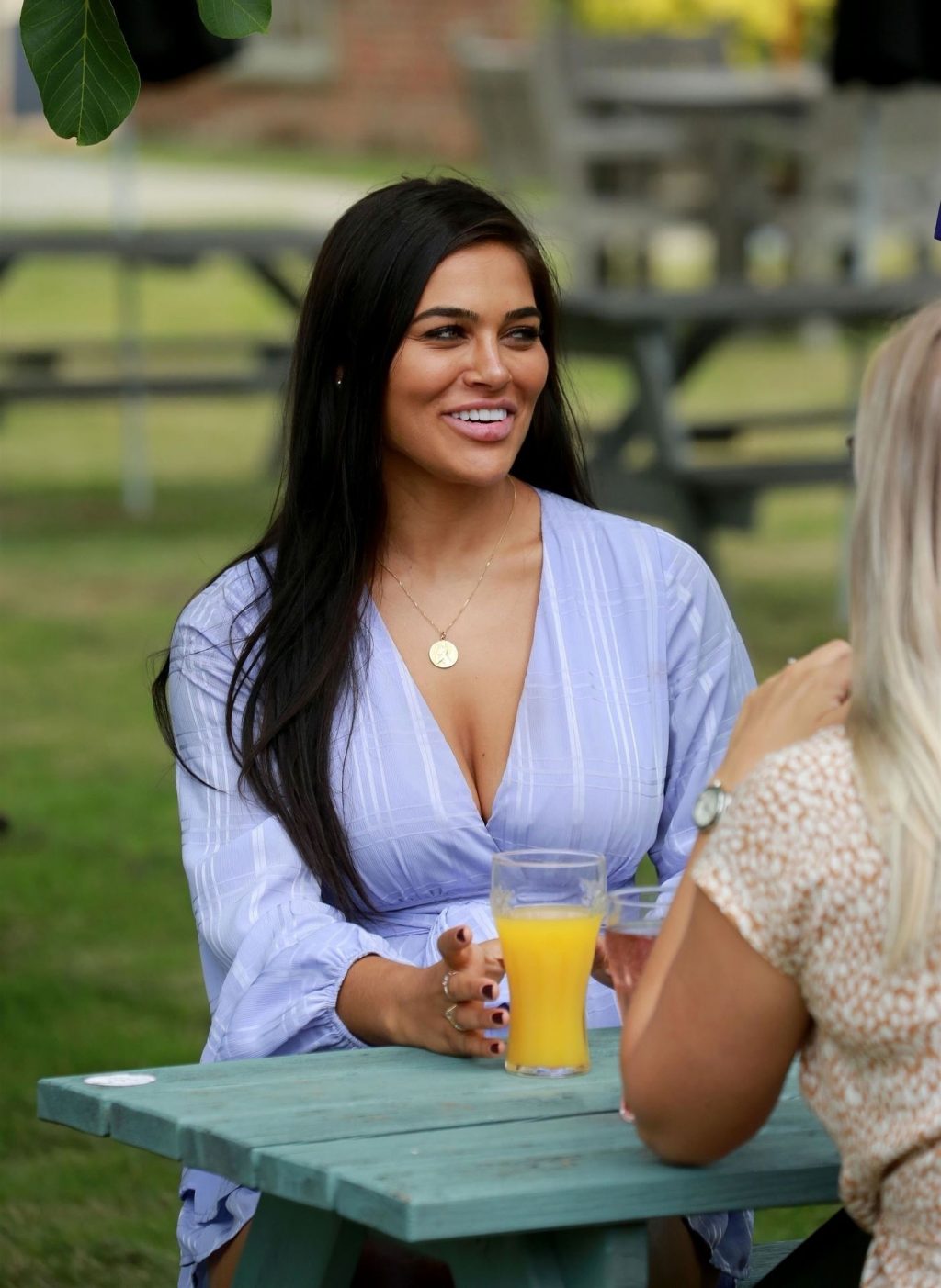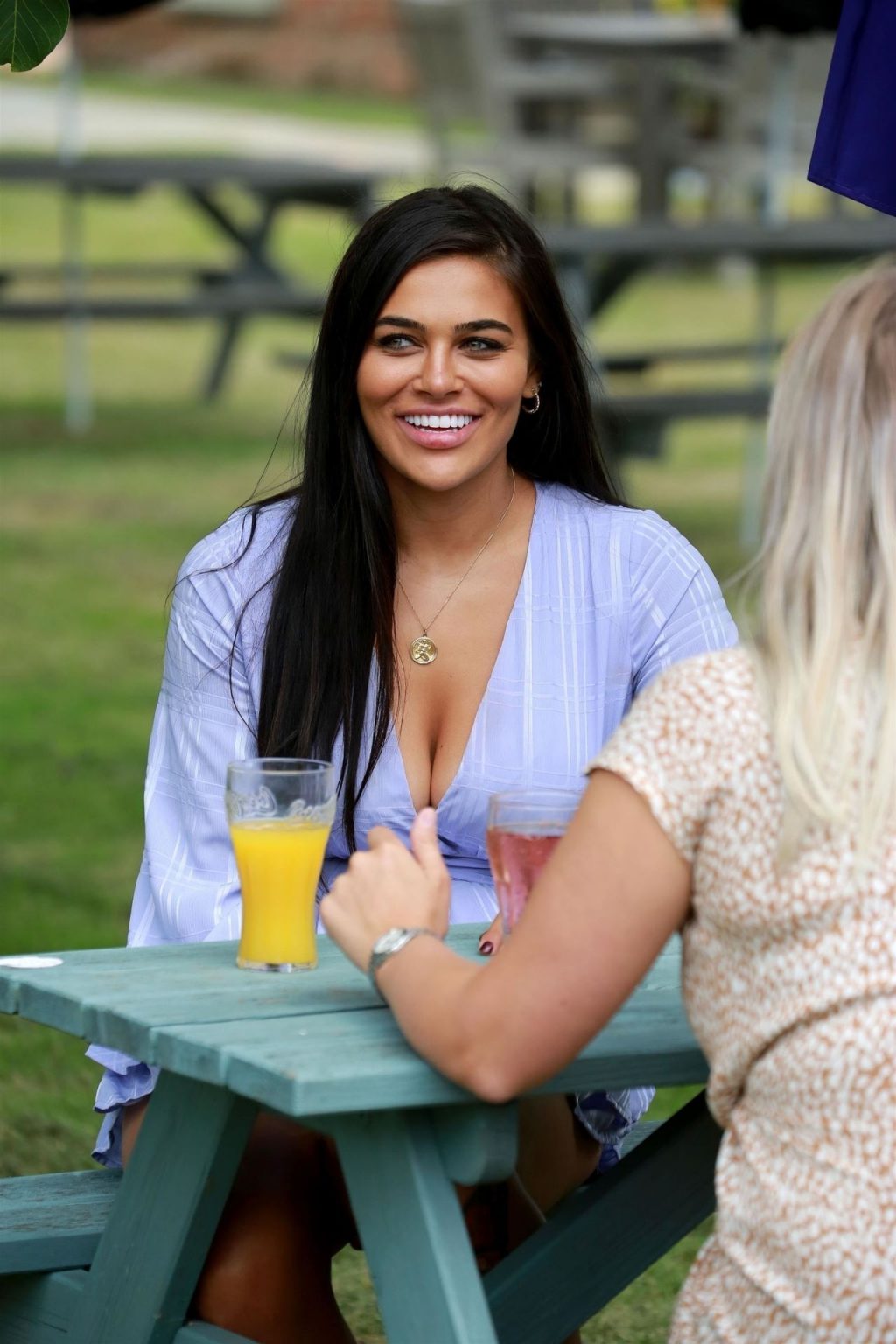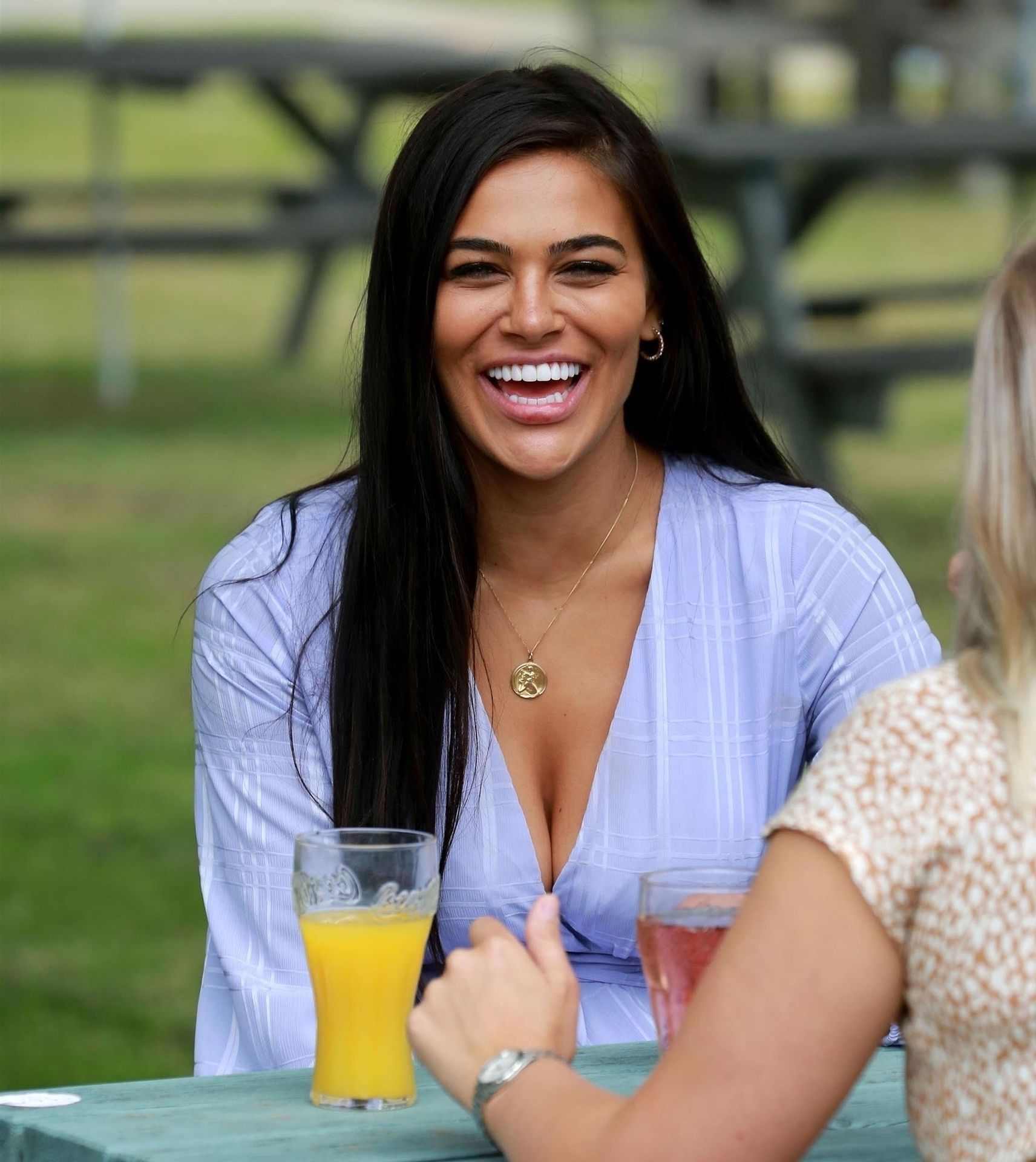 A estrela do reality show da Netflix ‘Too Hot to Handle’, Lydia Clyma, aproveita o clima quente do Reino Unido com uma bebida refrescante e uma boa conversa com uma amiga no jardim de cerveja de um pub perto de sua casa em Portsmouth, 17/07/2020.