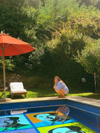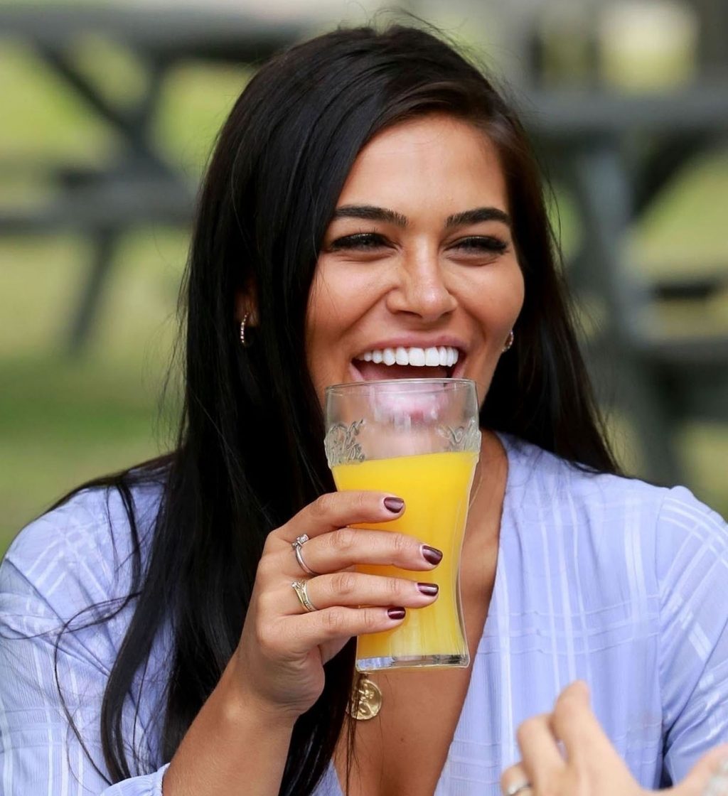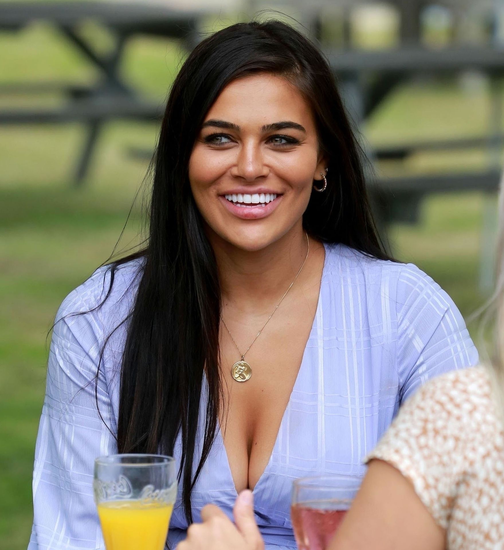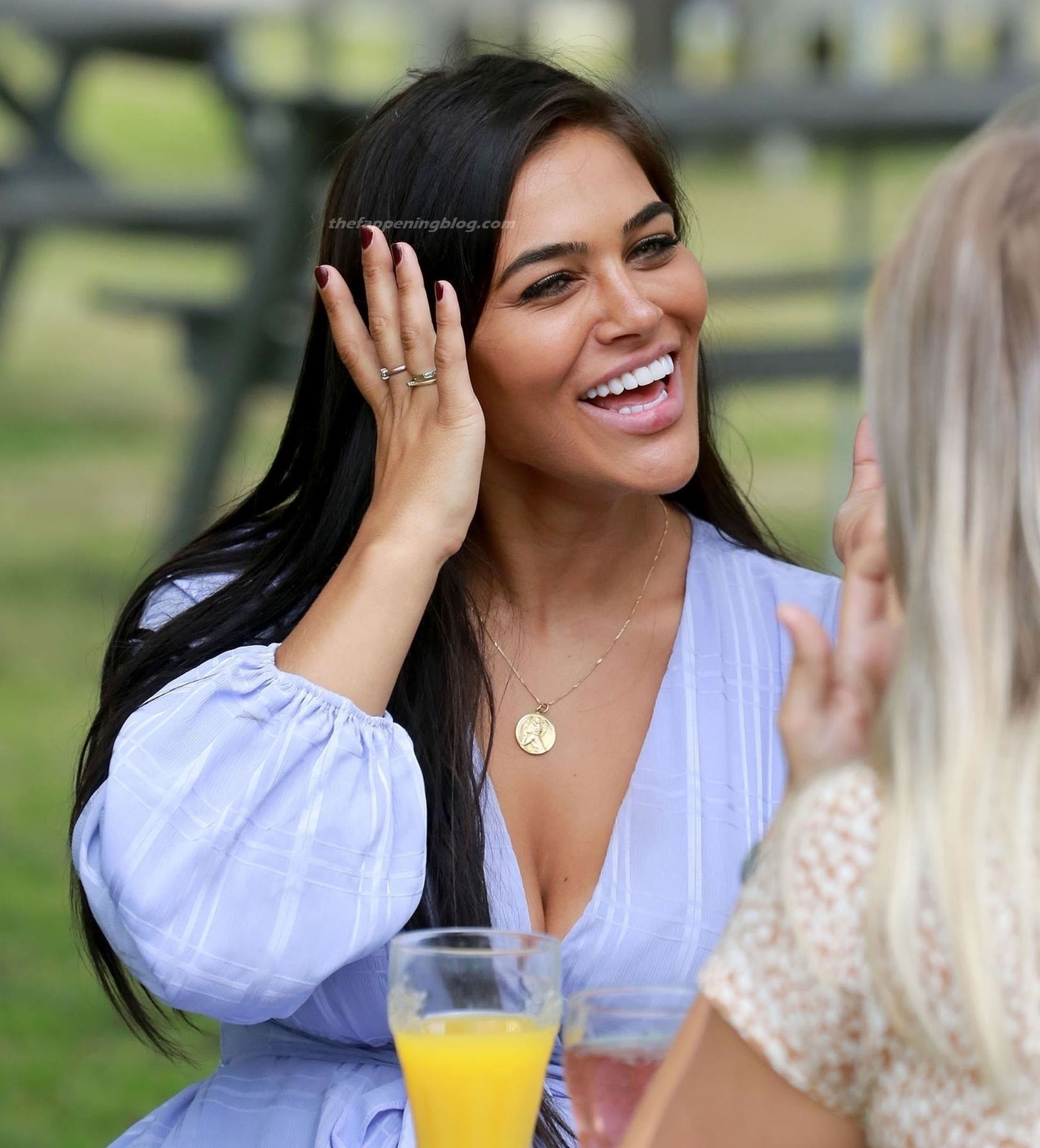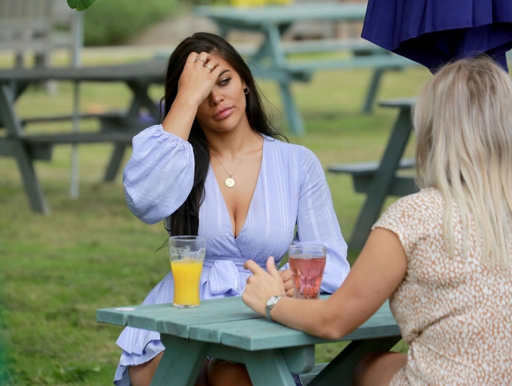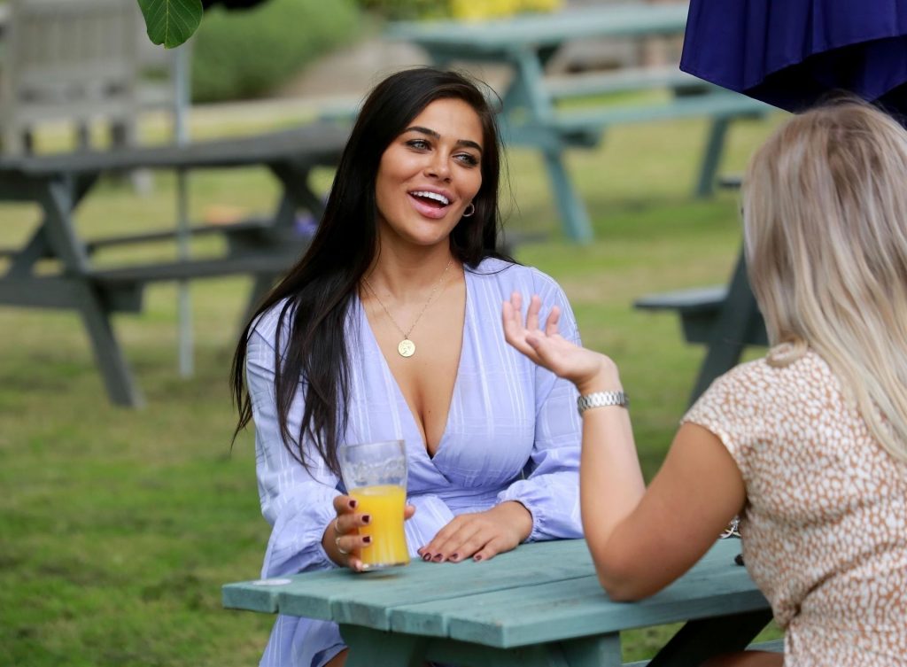 A estrela do reality show da Netflix ‘Too Hot to Handle’, Lydia Clyma, aproveita o clima quente do Reino Unido com uma bebida refrescante e uma boa conversa com uma amiga no jardim de cerveja de um pub perto de sua casa em Portsmouth, 17/07/2020.