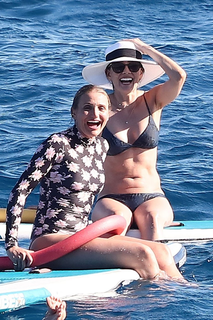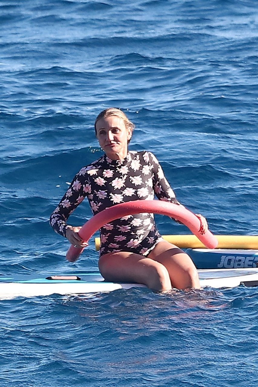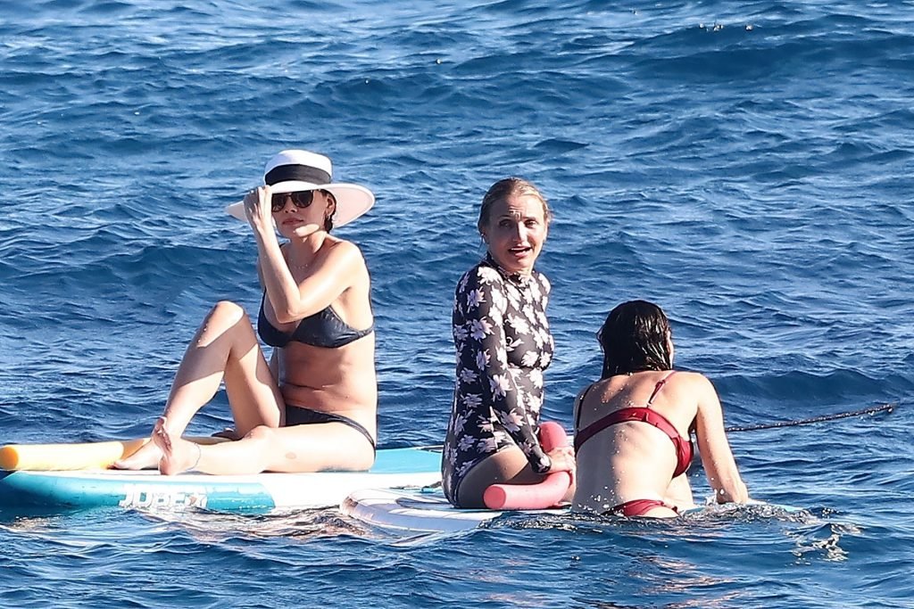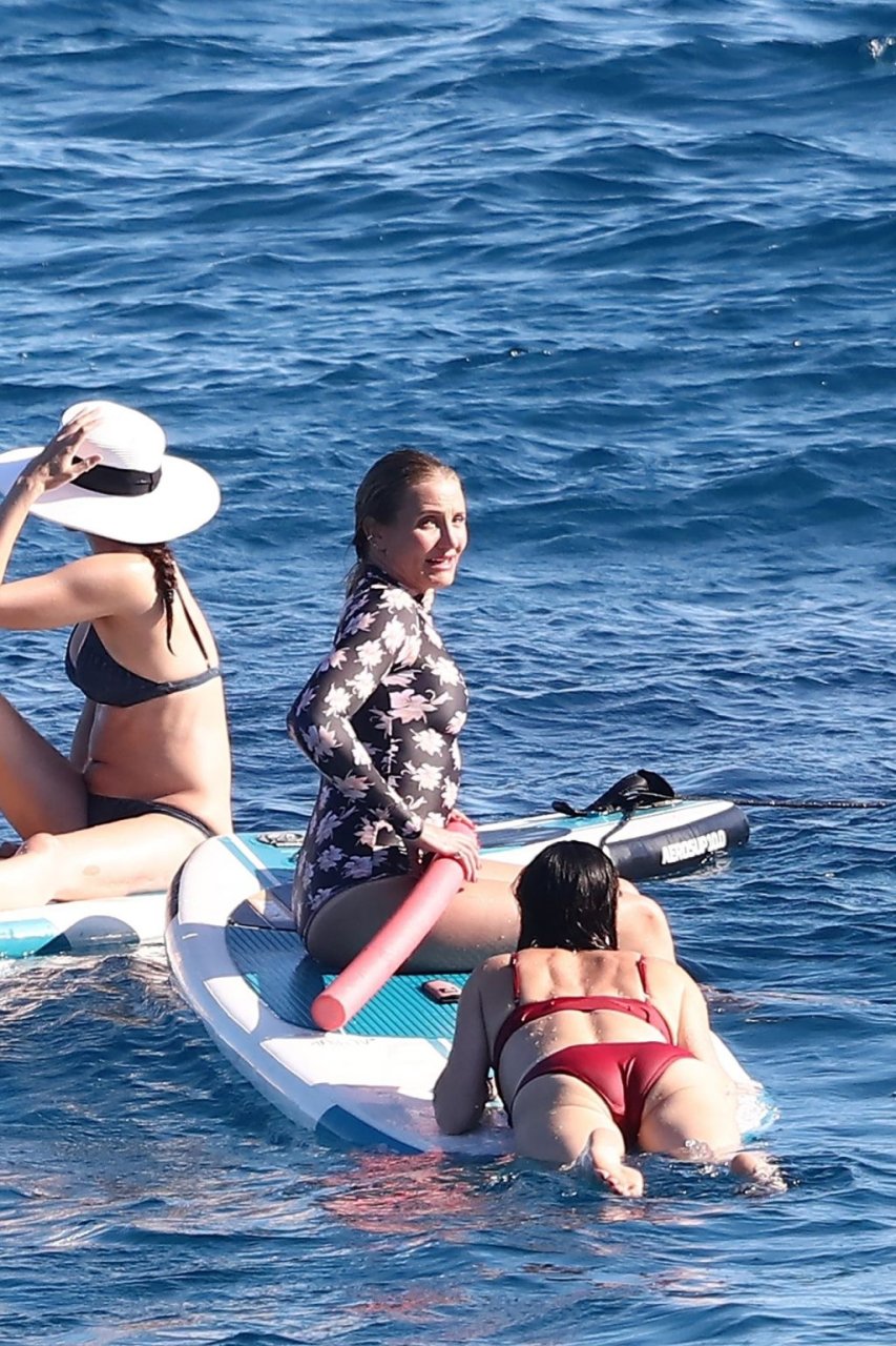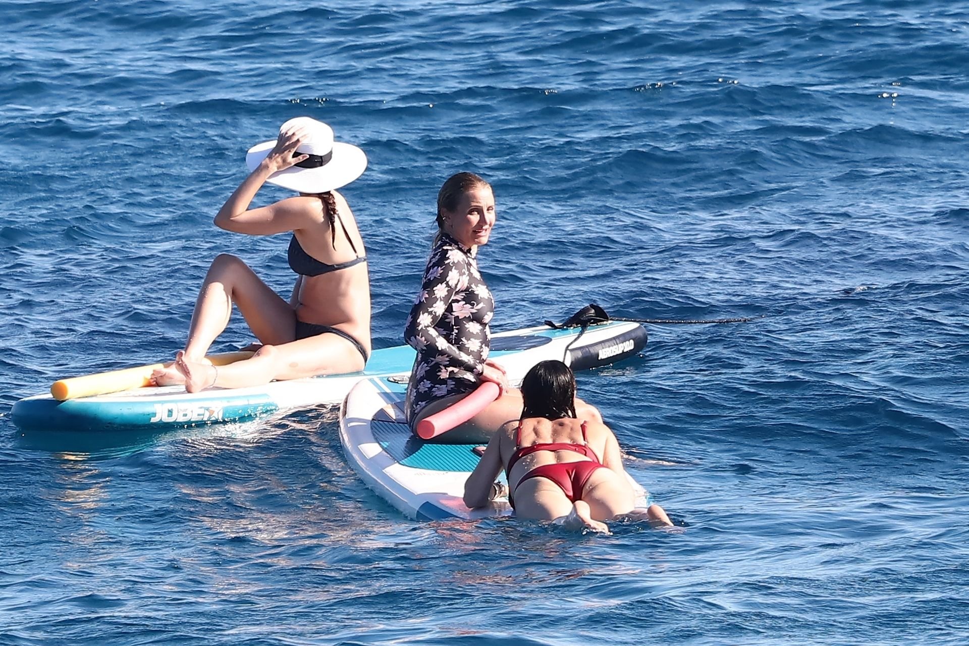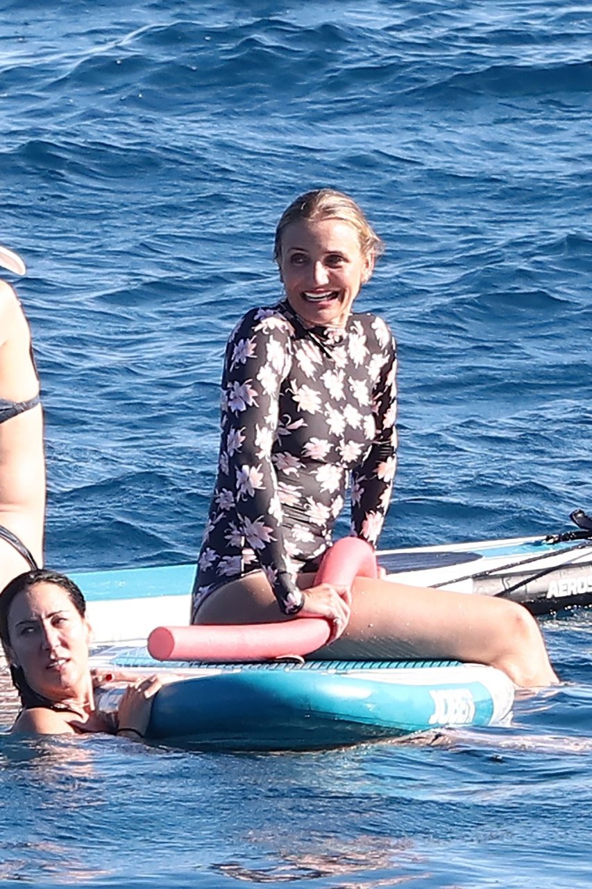Cameron, que completa 47 anos este mês, não conseguiu conter a alegria ao ser vista andando em uma prancha motorizada com Benji pelo mar e rindo com amigos em pranchas de surfe durante o passeio.
