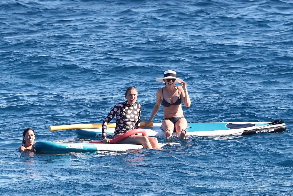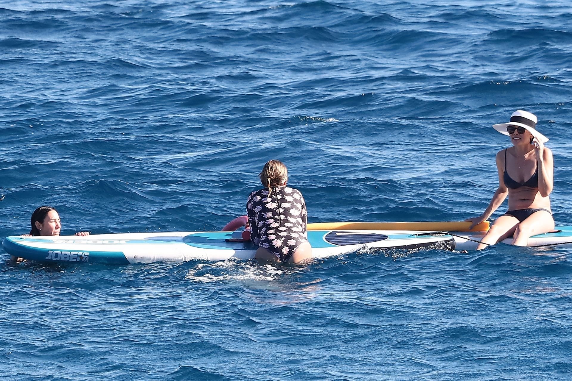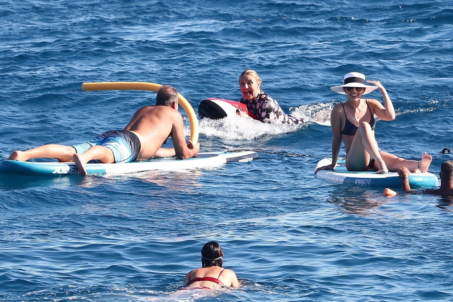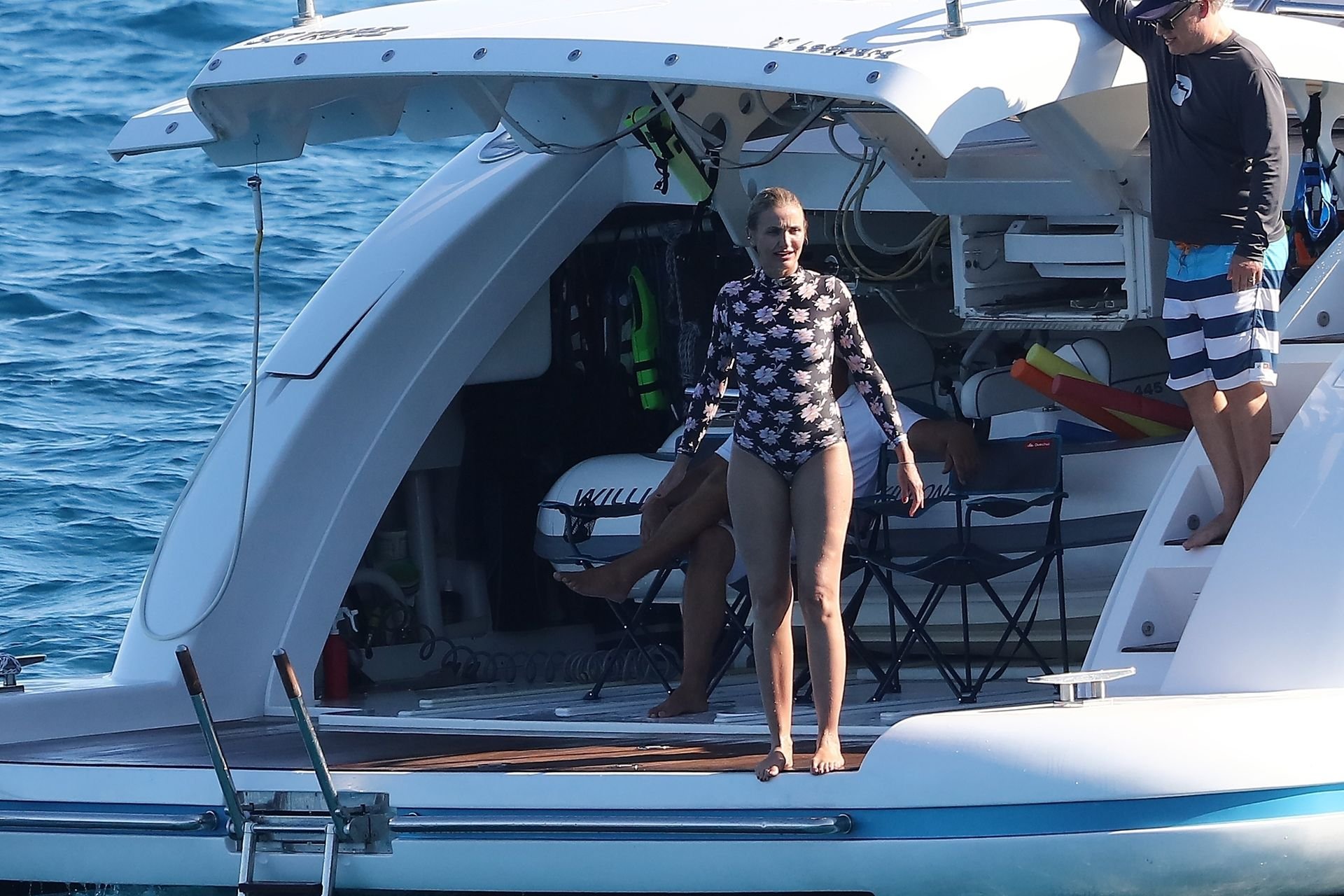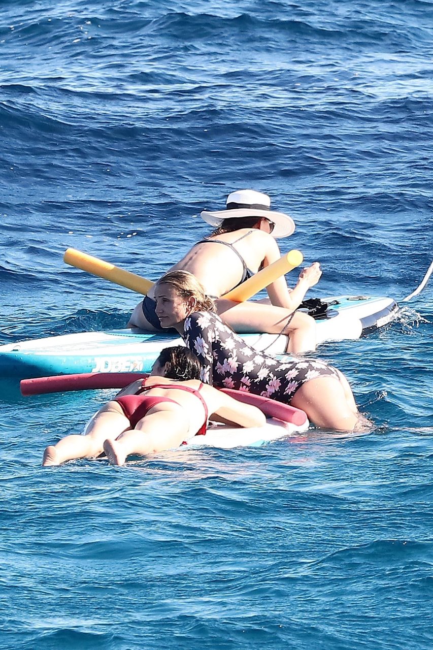 Cameron, que completa 47 anos este mês, não conseguiu conter a alegria ao ser vista andando em uma prancha motorizada com Benji pelo mar e rindo com amigos em pranchas de surfe durante o passeio.