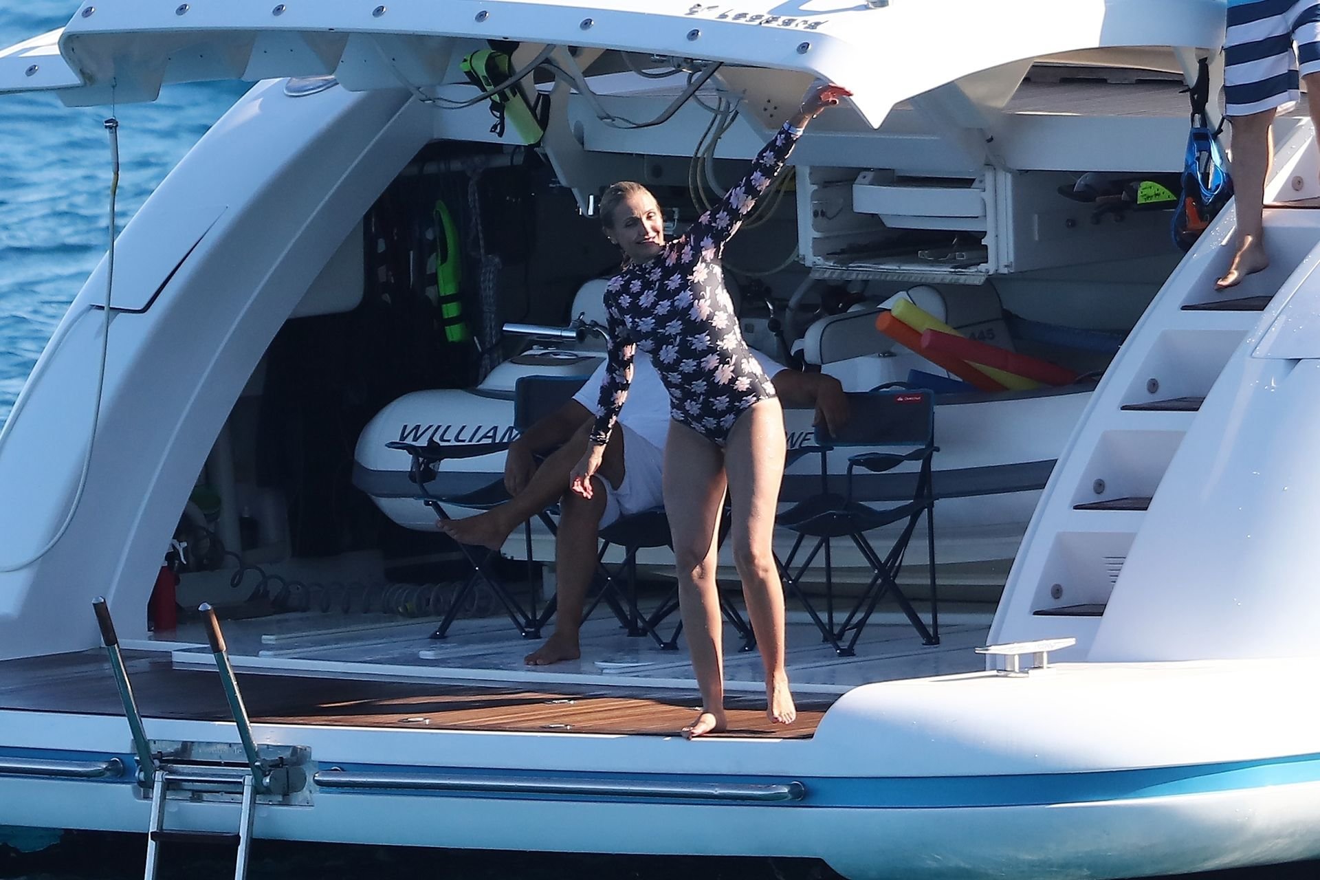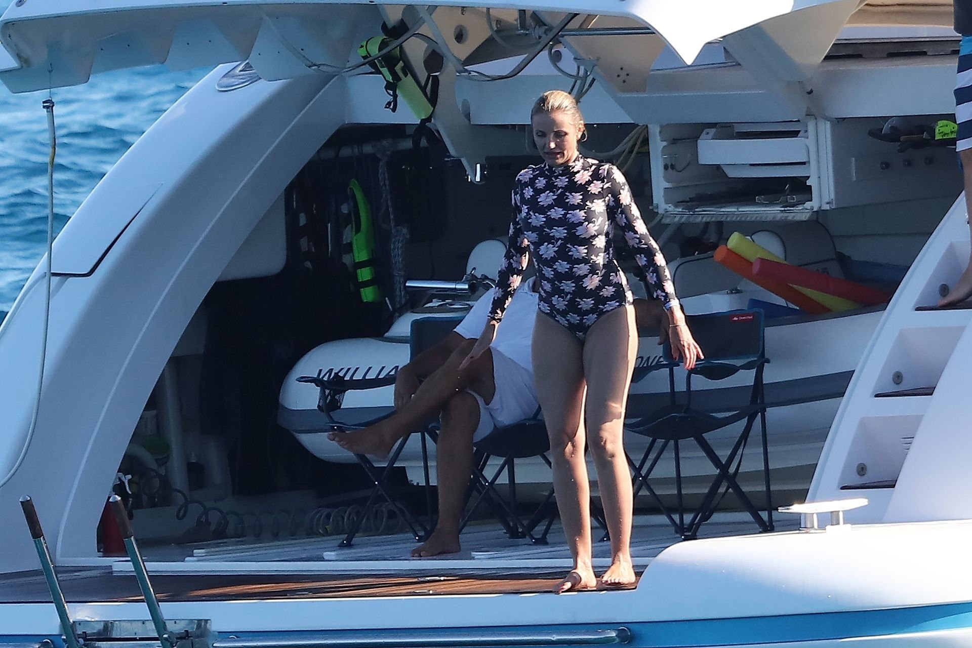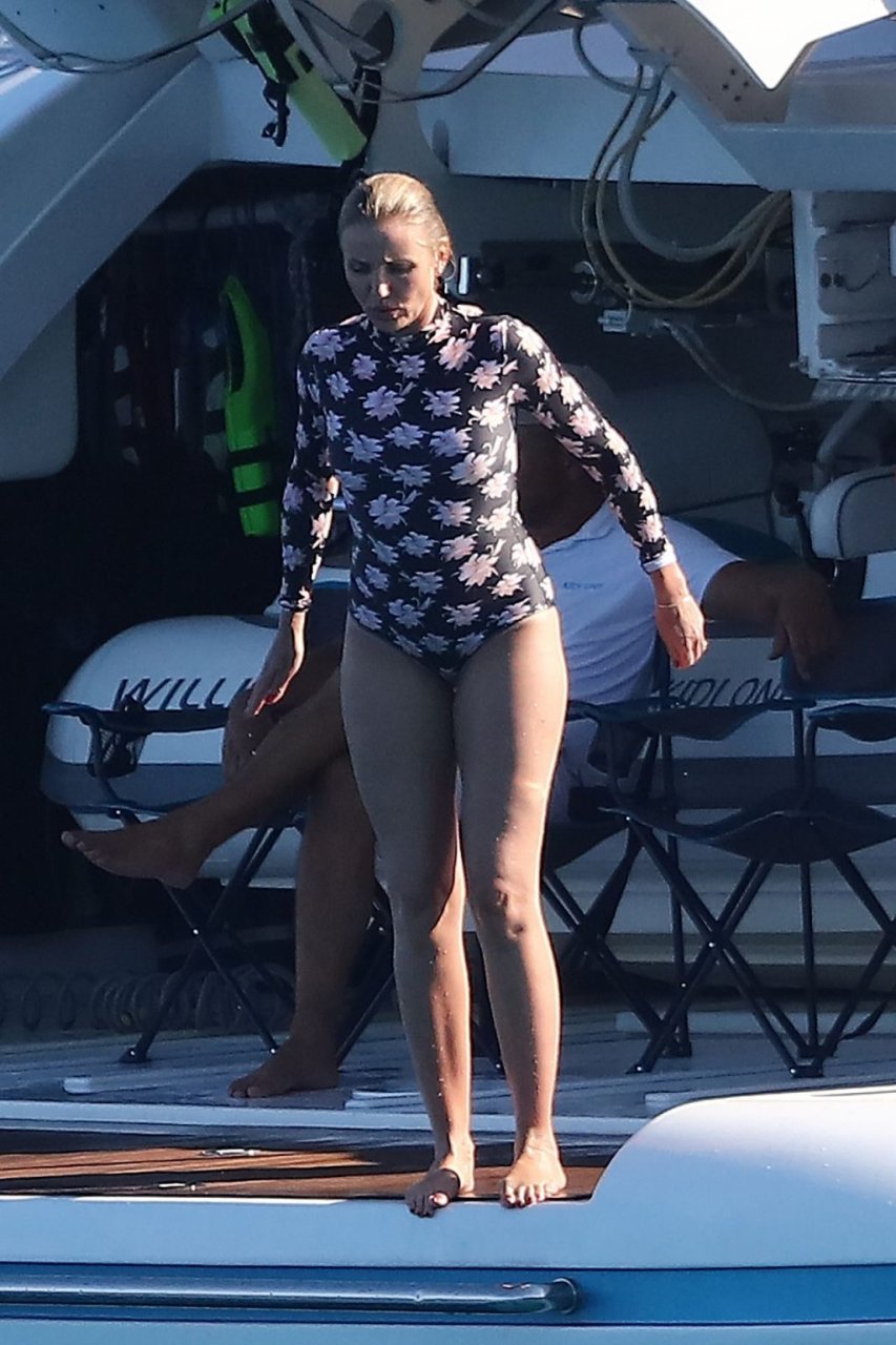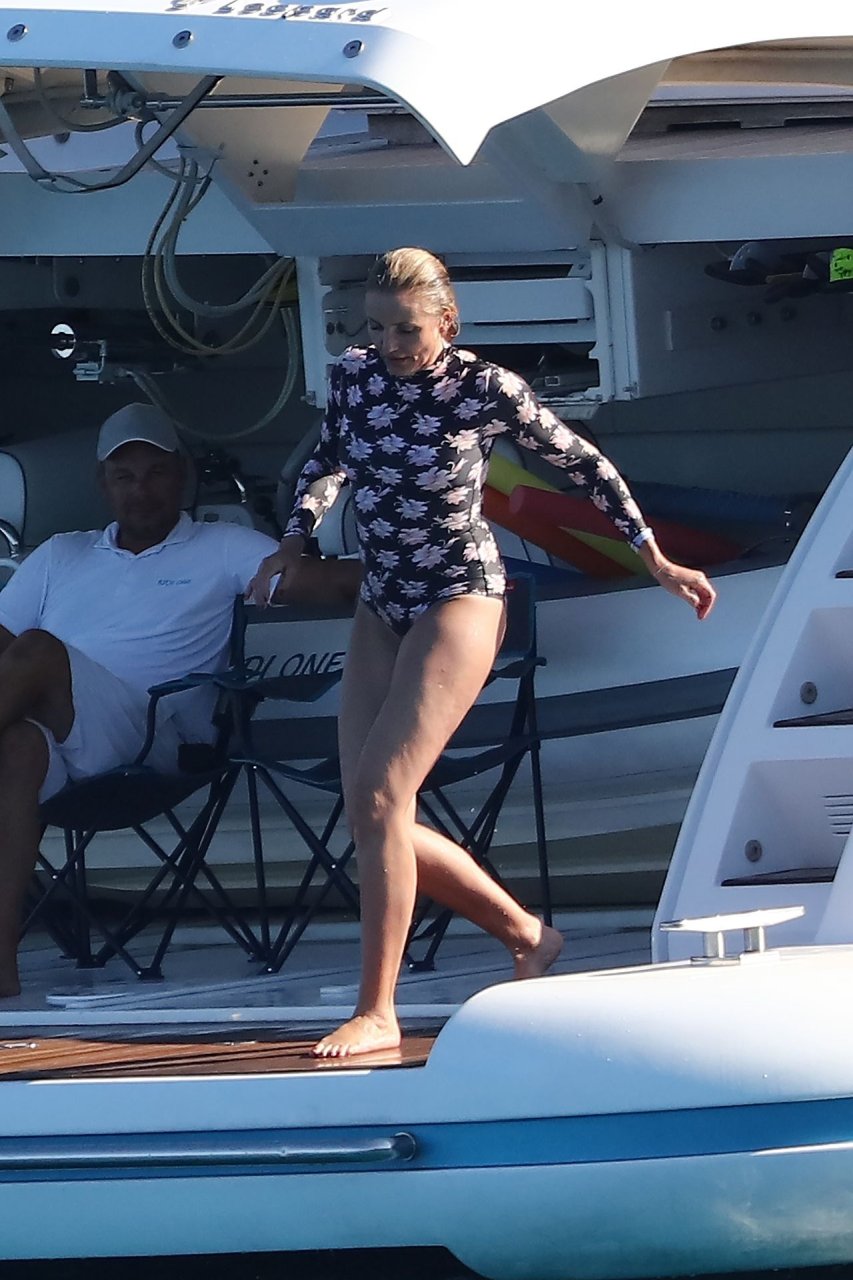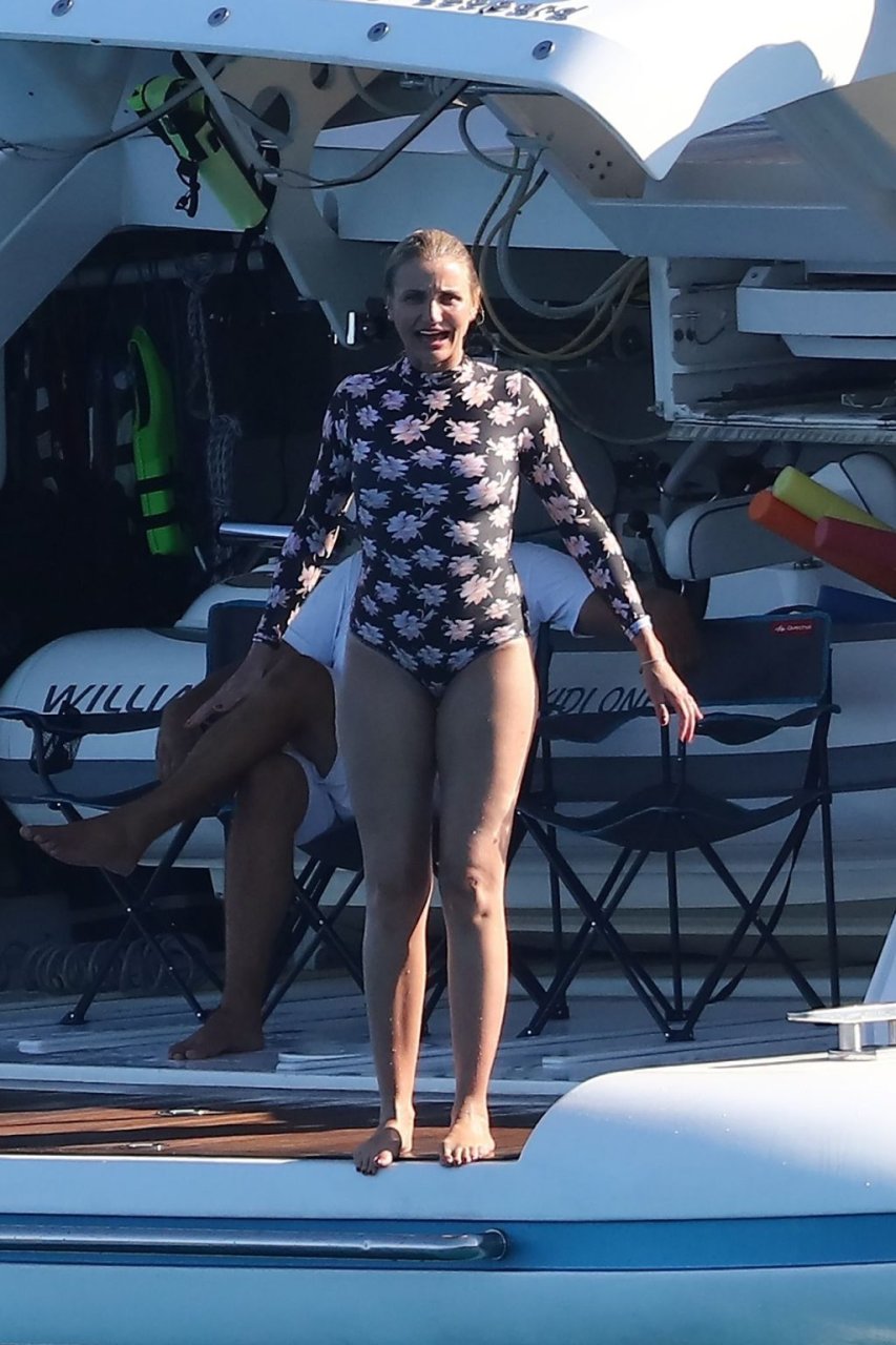 Cameron Diaz e o marido Benji Madden estão aproveitando ao máximo suas férias em Saint Tropez, 08/08/2019. A estrela de Charlie’s Angels foi vista mergulhando no Mediterrâneo com um maiô floral que mostrava seu corpo fantástico.