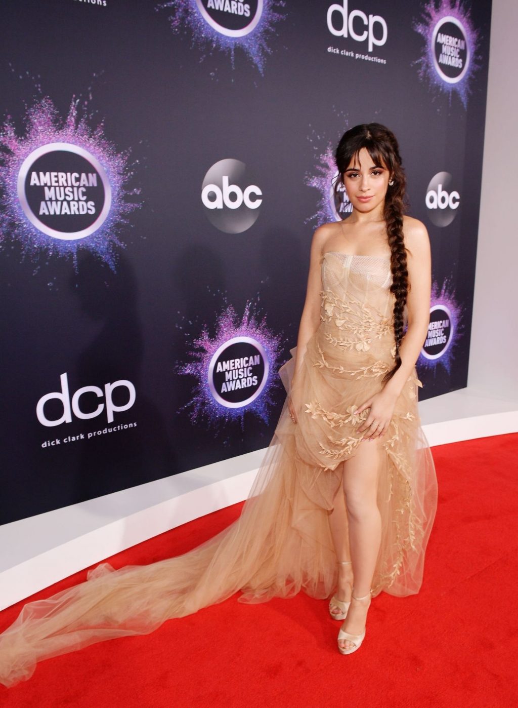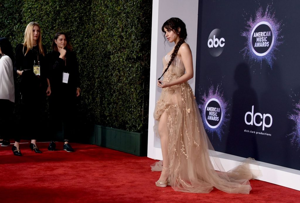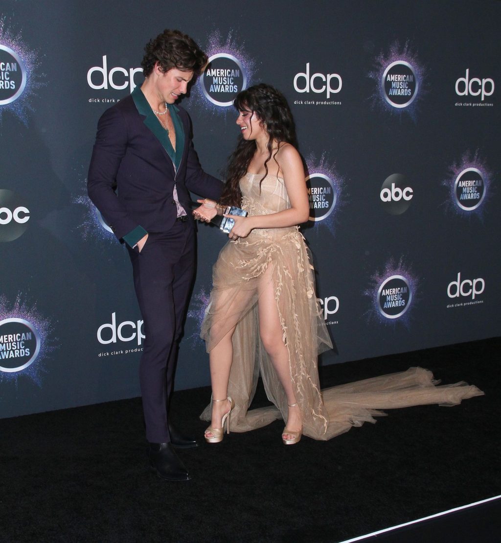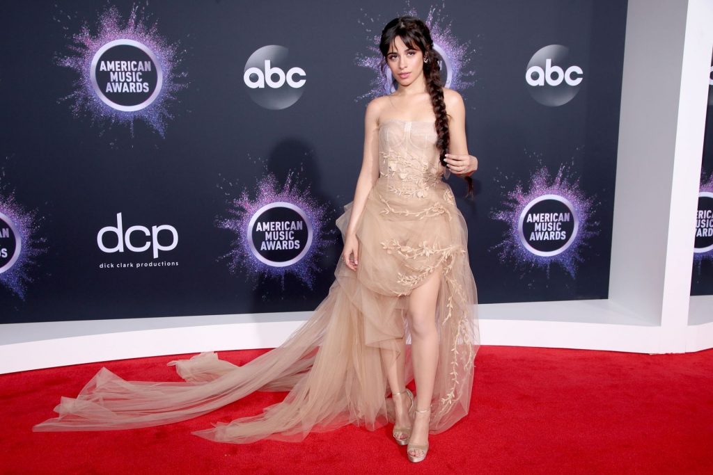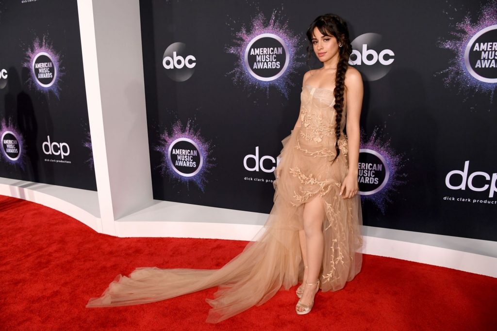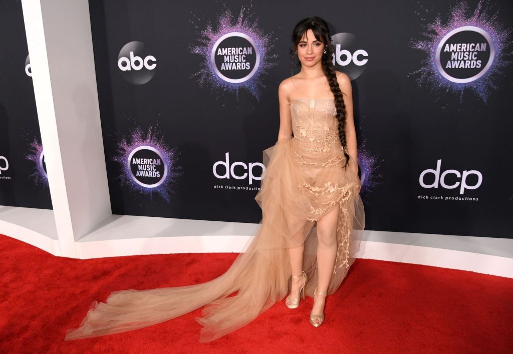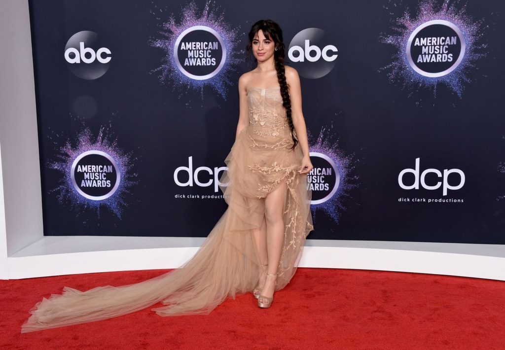 Camila Cabello chega para o American Music Awards 2019 no Microsoft Theater em Los Angeles, 24/11/2019. A cantora escolheu um vestido na cor nude para o evento, mostrando suas pernas sexy no tapete vermelho enquanto era fotografada sozinha e com Shawn Mendes.