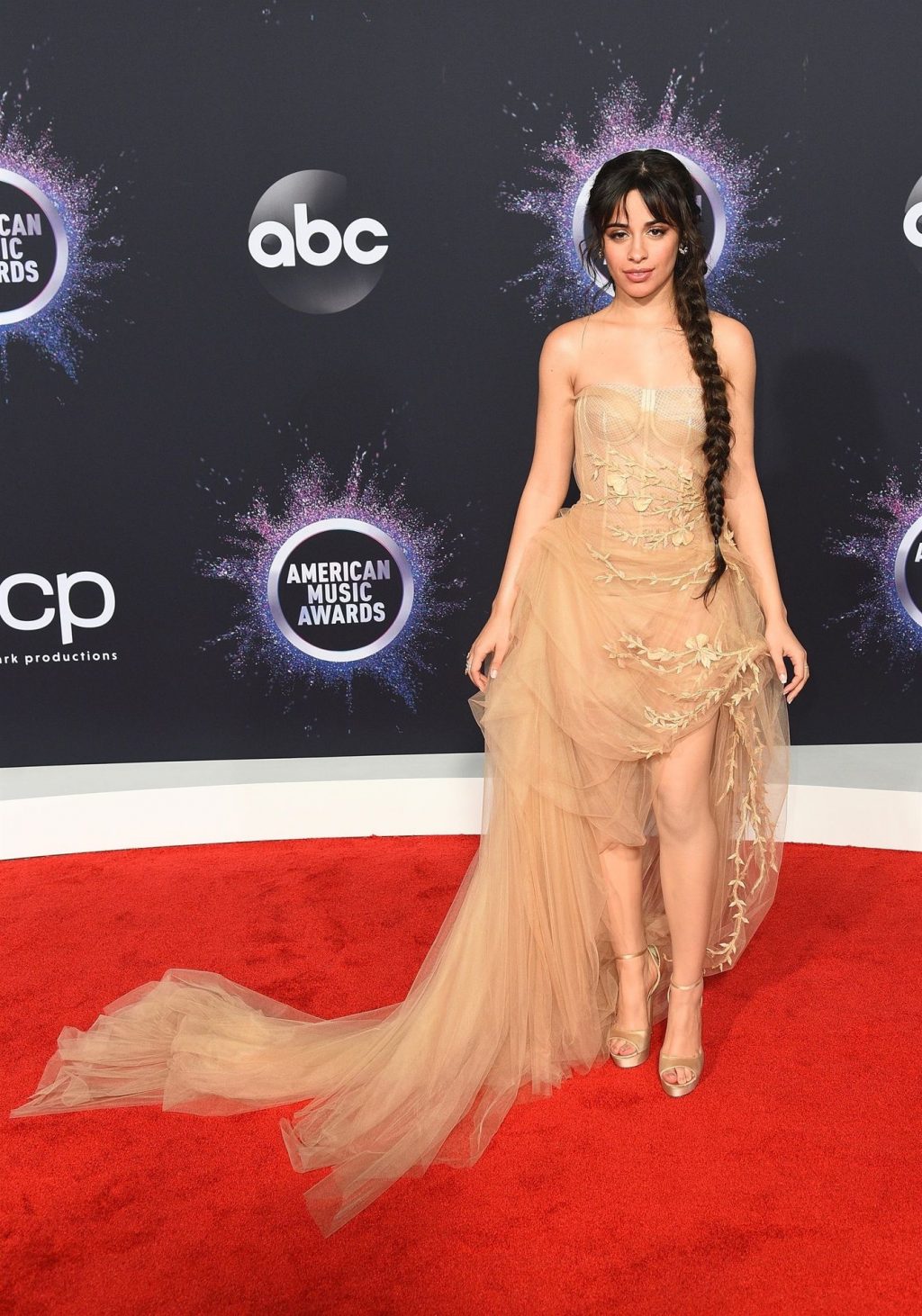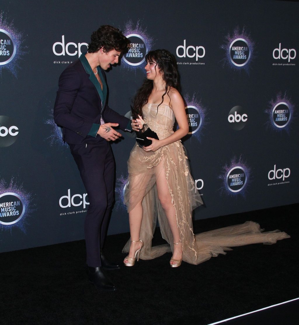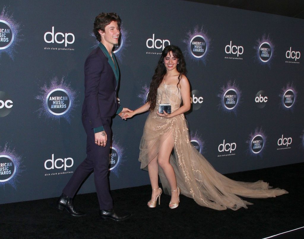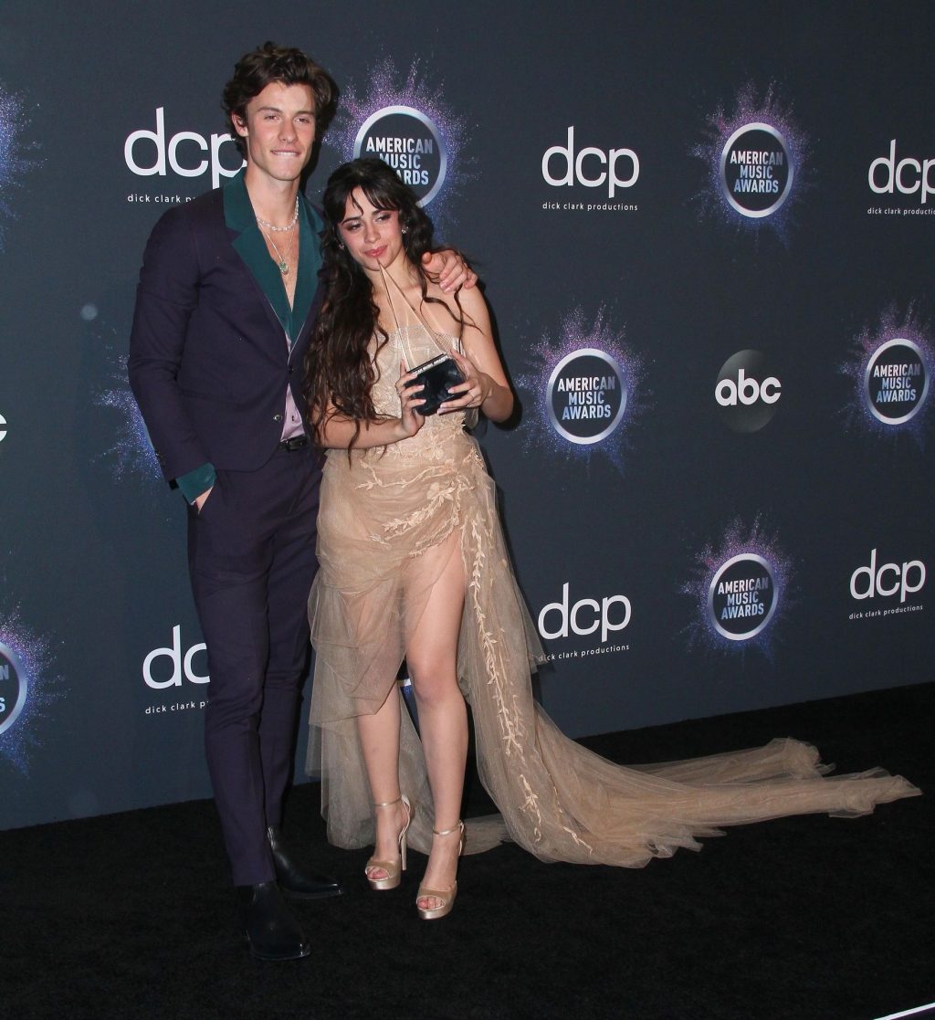 Camila Cabello chega para o American Music Awards 2019 no Microsoft Theater em Los Angeles, 24/11/2019. A cantora escolheu um vestido na cor nude para o evento, mostrando suas pernas sexy no tapete vermelho enquanto era fotografada sozinha e com Shawn Mendes.