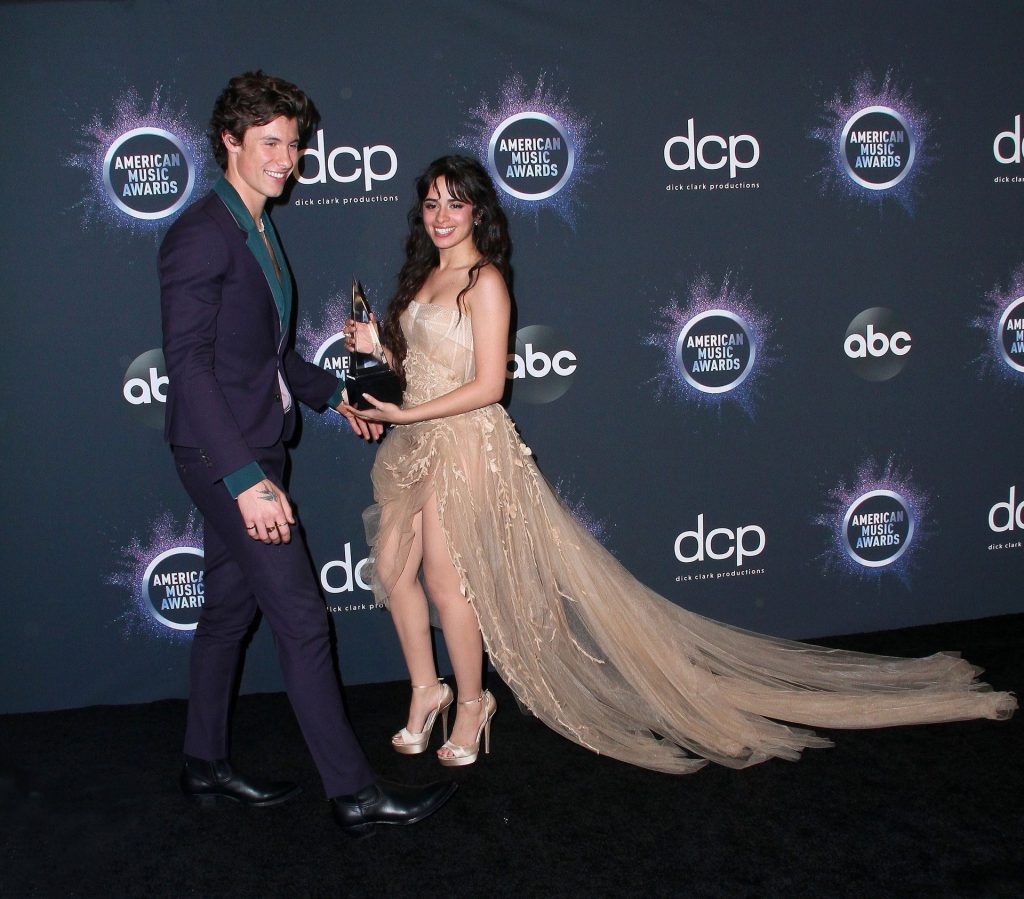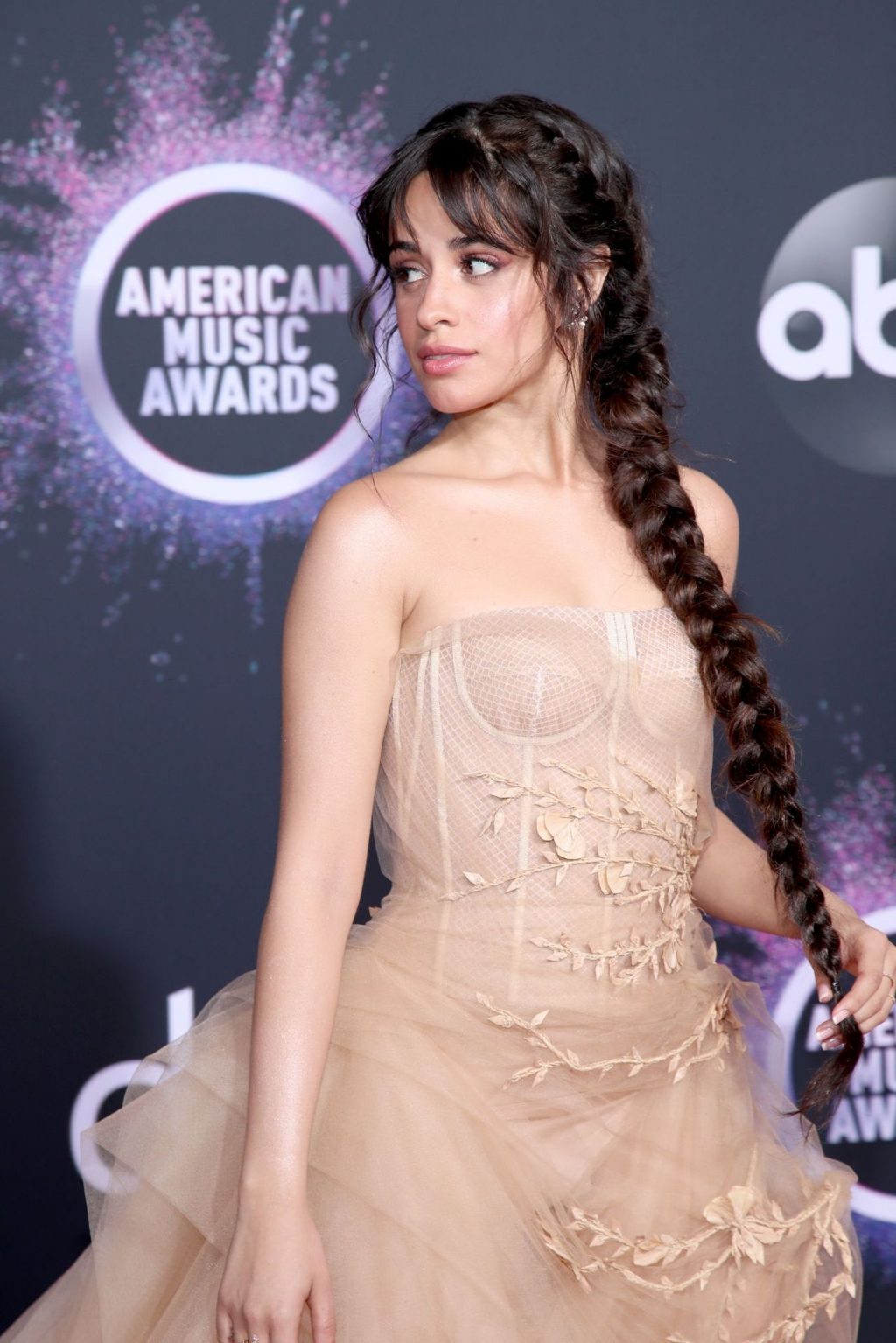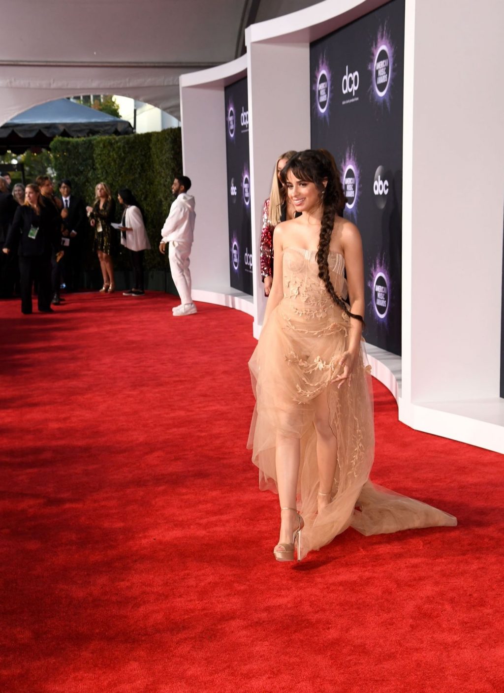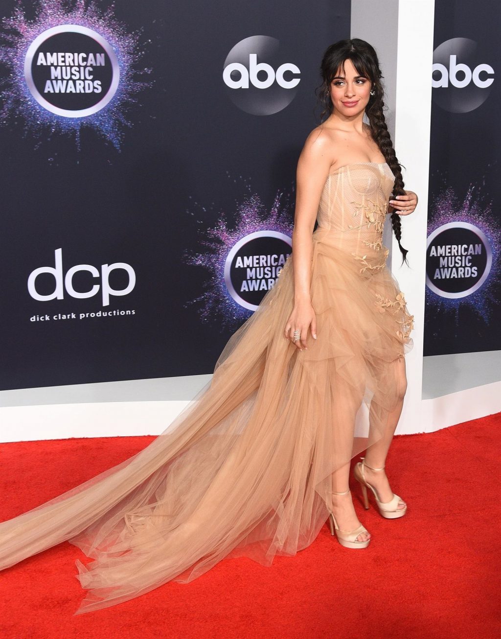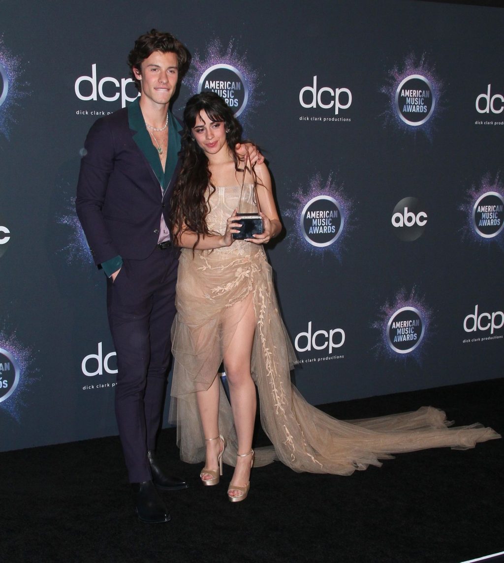 Camila Cabello chega para o American Music Awards 2019 no Microsoft Theater em Los Angeles, 24/11/2019. A cantora escolheu um vestido na cor nude para o evento, mostrando suas pernas sexy no tapete vermelho enquanto era fotografada sozinha e com Shawn Mendes.