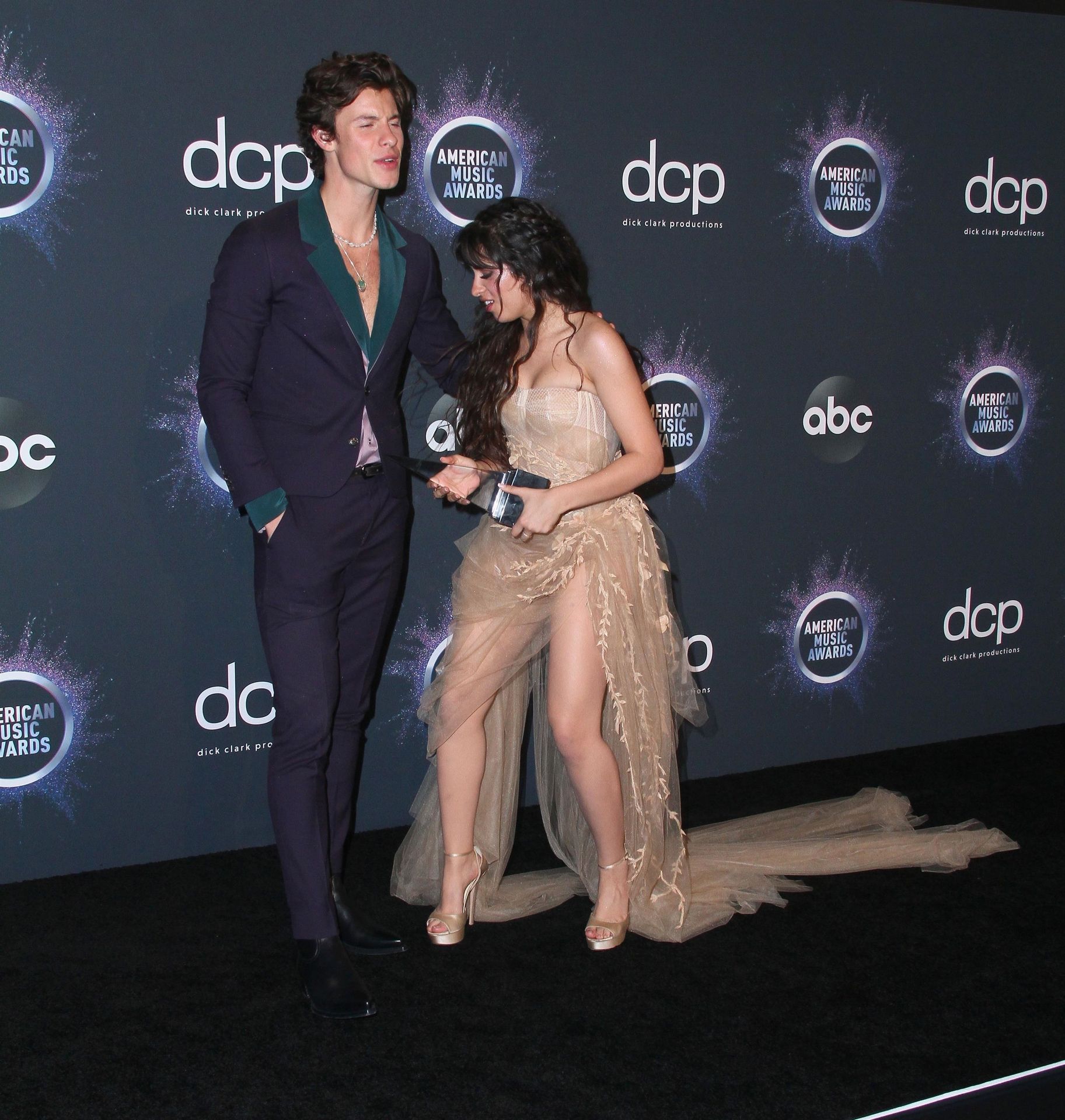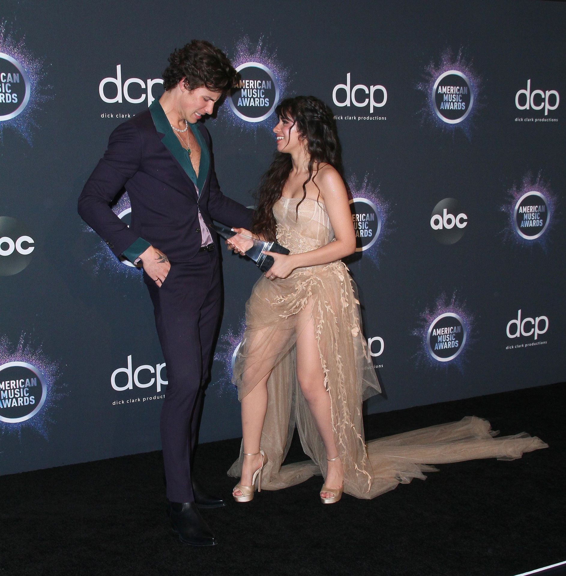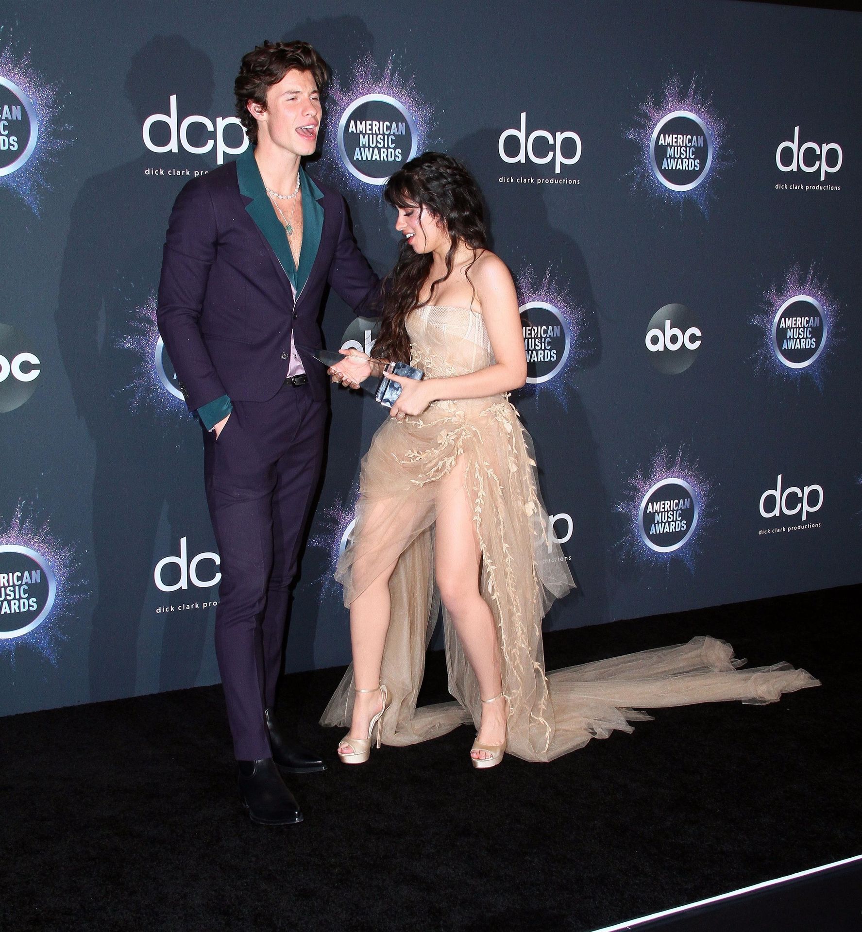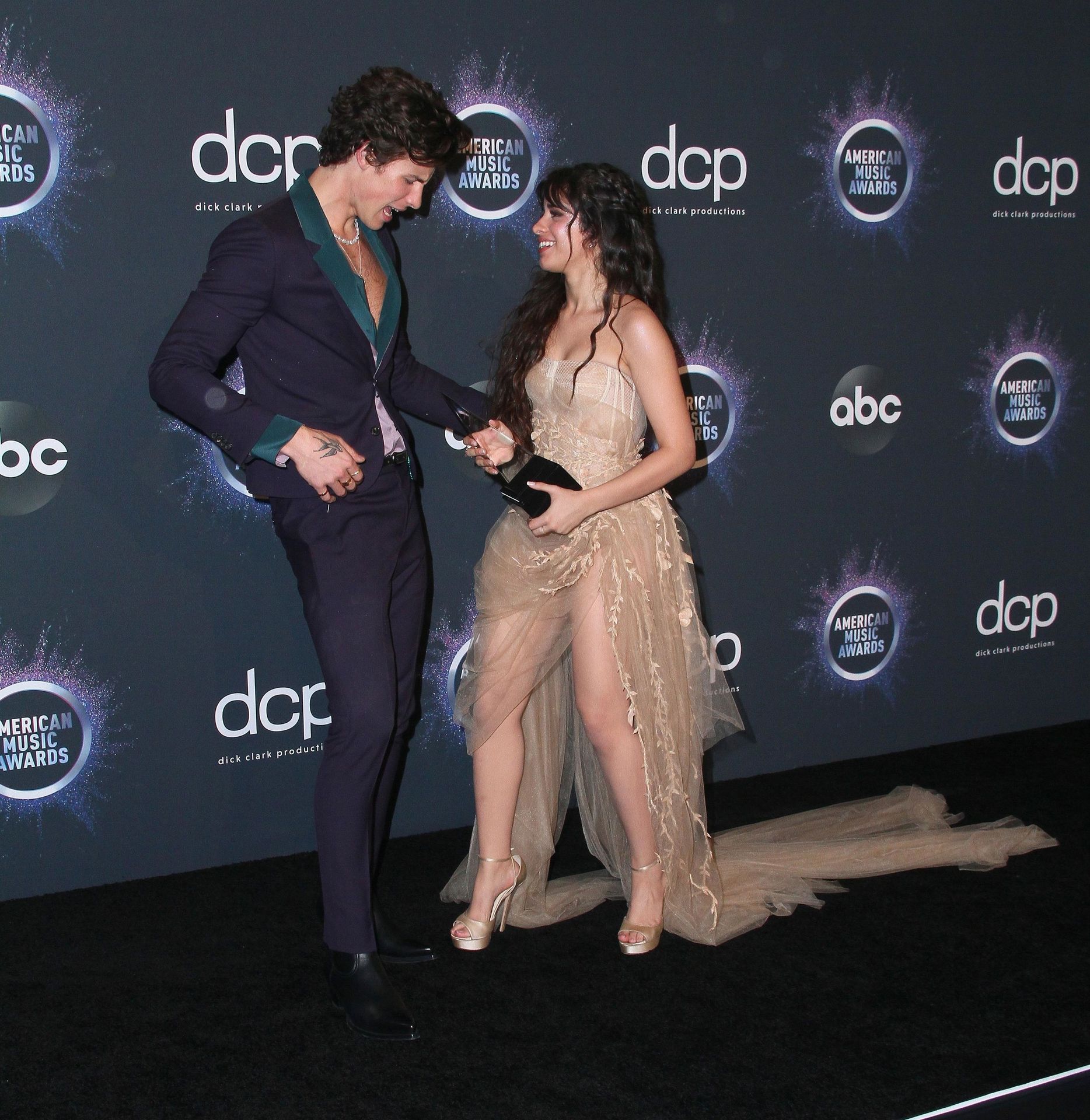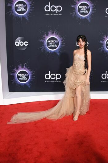 Camila Cabello chega para o American Music Awards 2019 no Microsoft Theater em Los Angeles, 24/11/2019. A cantora escolheu um vestido na cor nude para o evento, mostrando suas pernas sexy no tapete vermelho enquanto era fotografada sozinha e com Shawn Mendes.