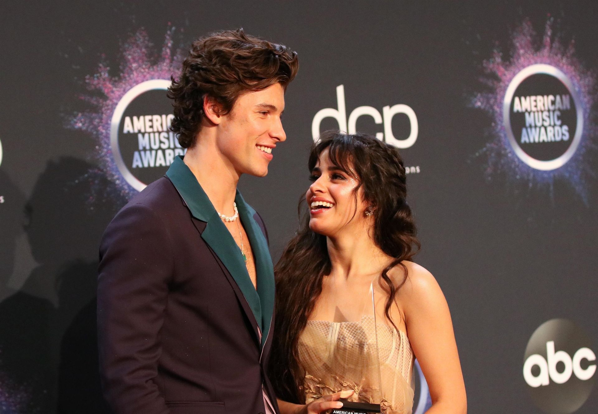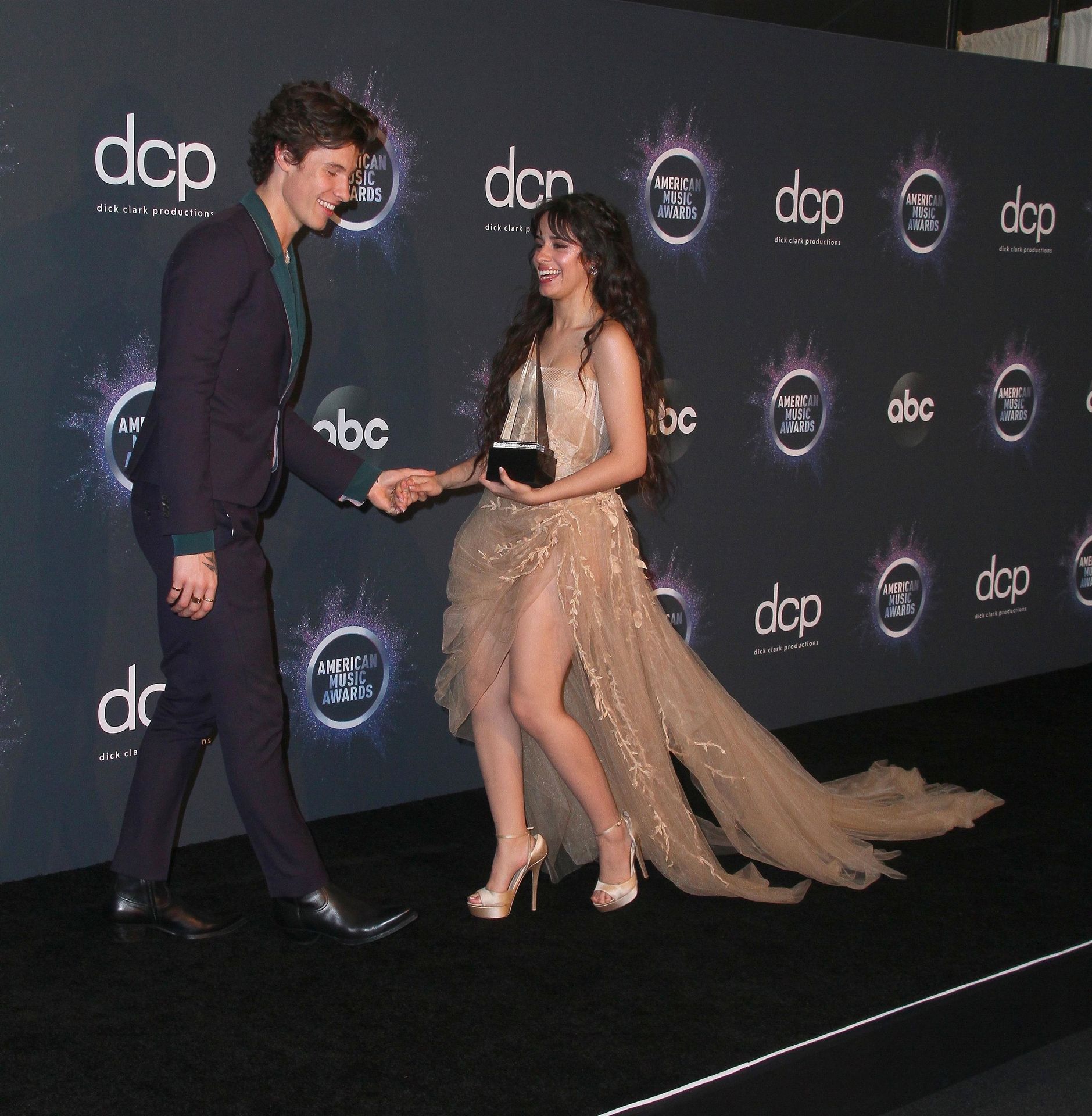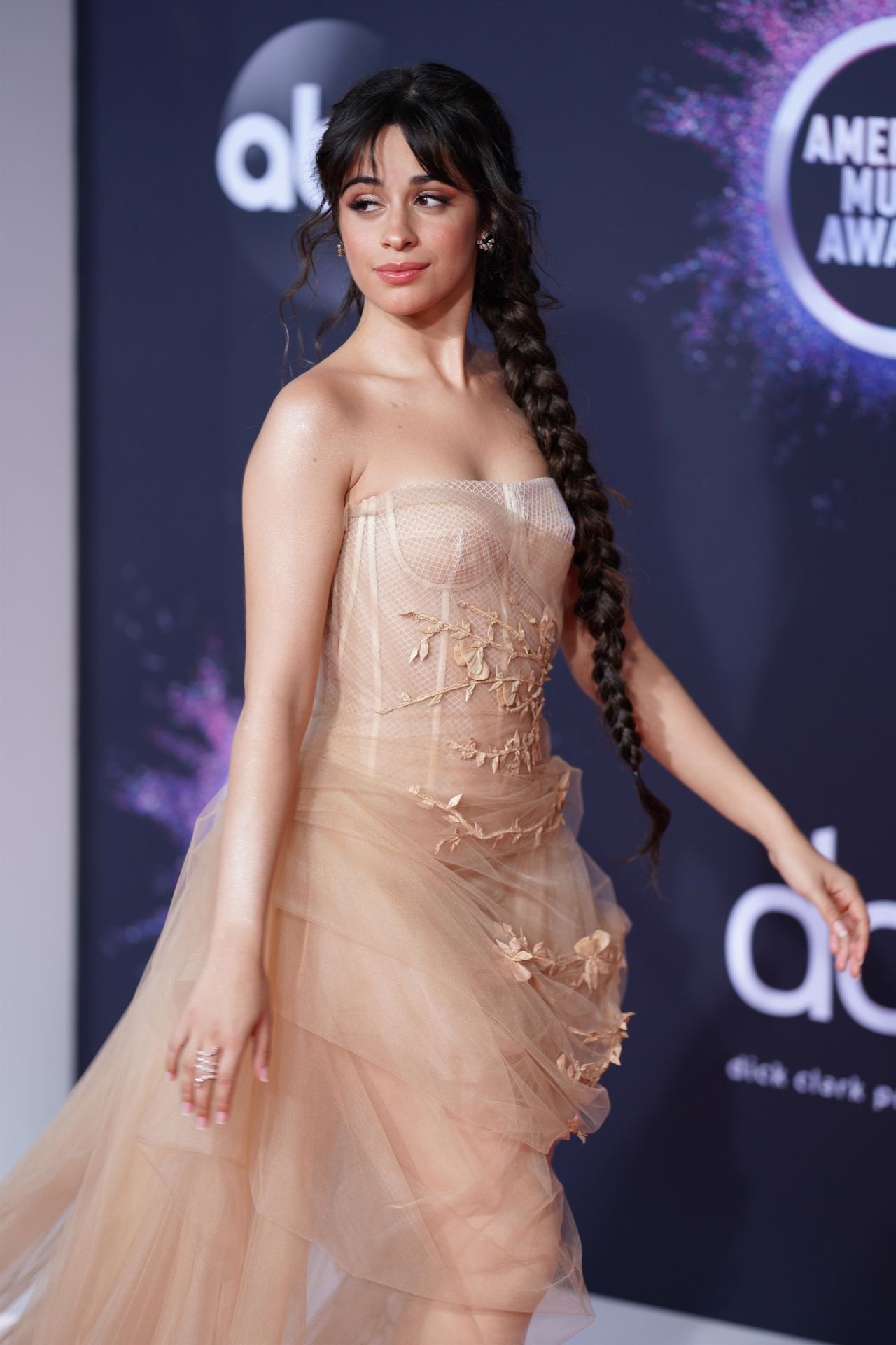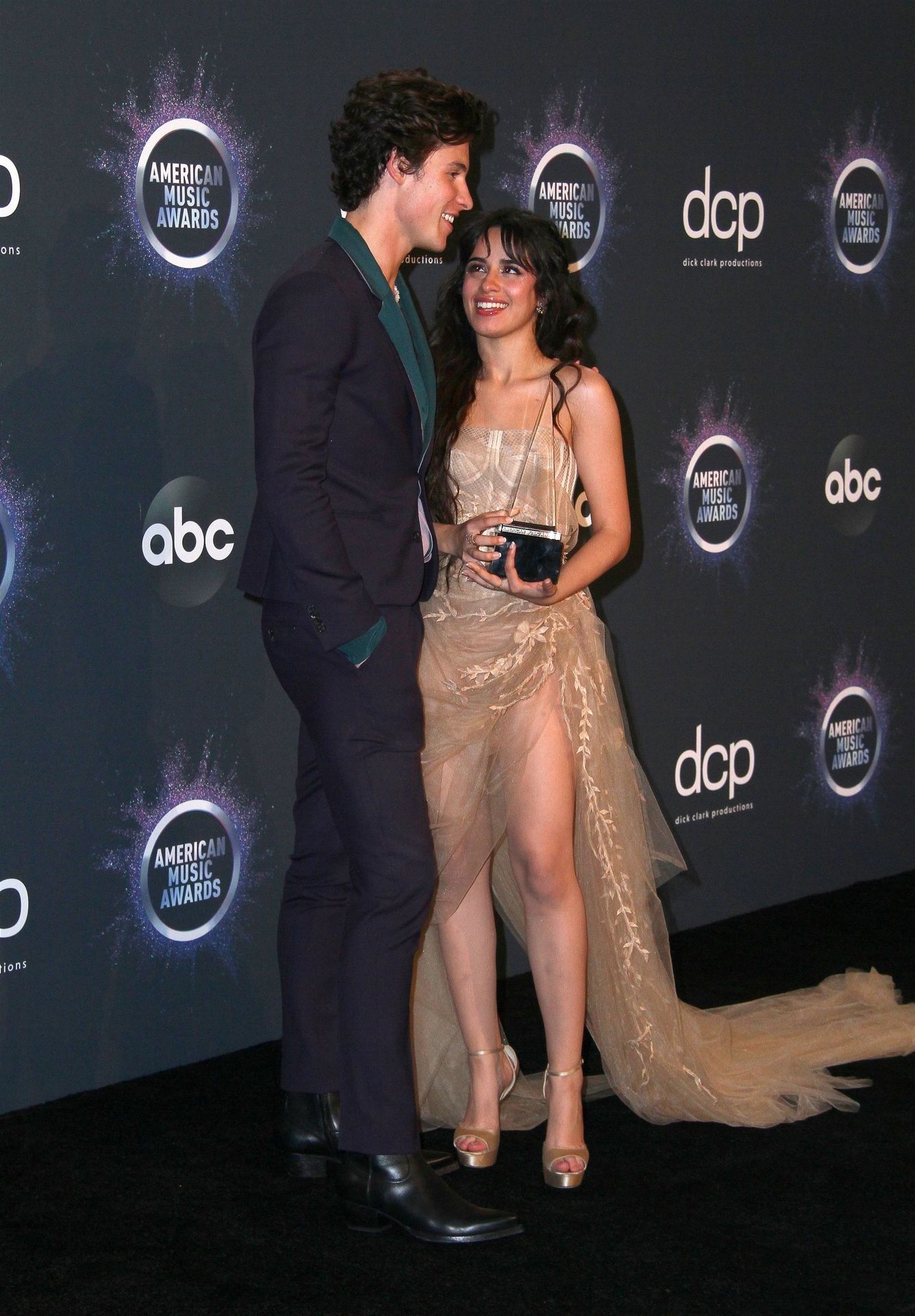 Camila Cabello chega para o American Music Awards 2019 no Microsoft Theater em Los Angeles, 24/11/2019. A cantora escolheu um vestido na cor nude para o evento, mostrando suas pernas sexy no tapete vermelho enquanto era fotografada sozinha e com Shawn Mendes.