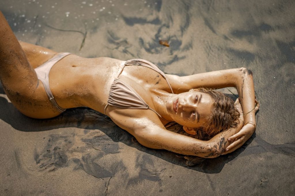 A modelo/atriz Camila (Cami) Morrone exibe seu corpo sensual e seios magníficos posando com um biquíni minúsculo na praia de Malibu para um antigo ensaio fotográfico de Kesler Tran (2016).