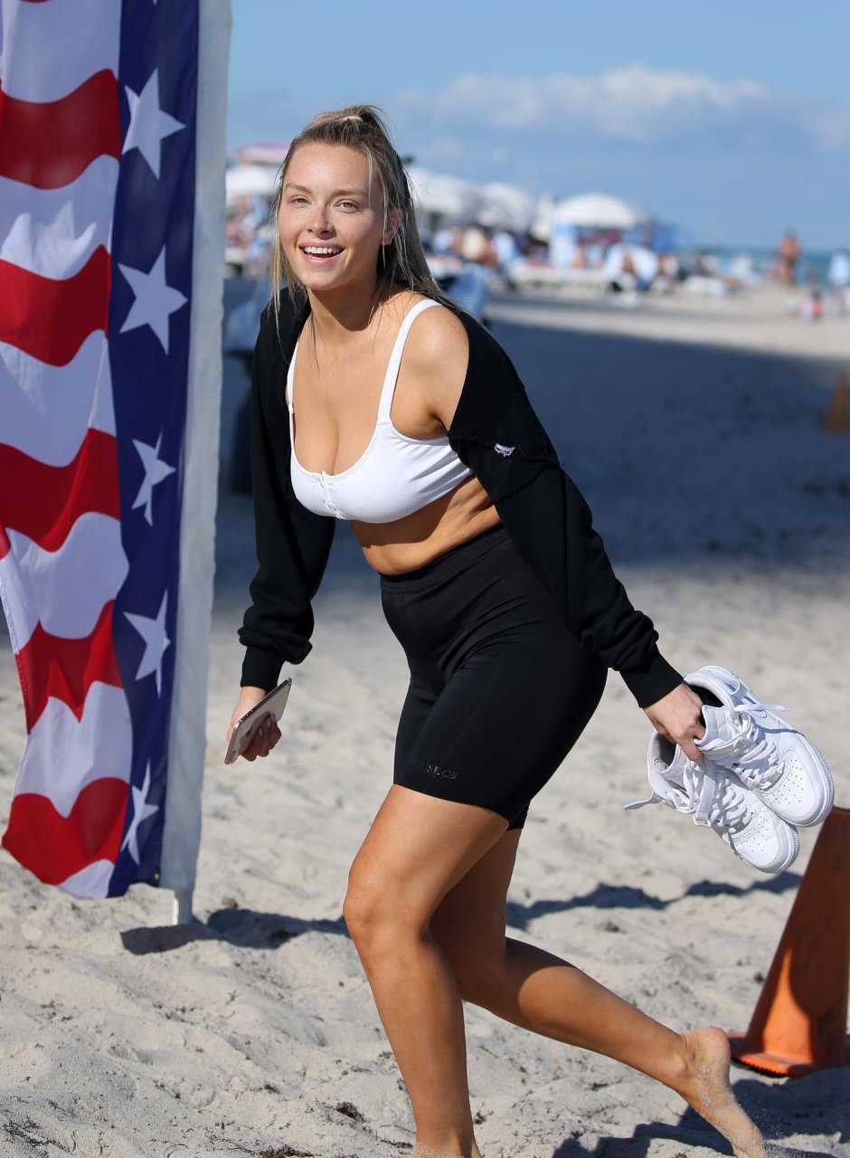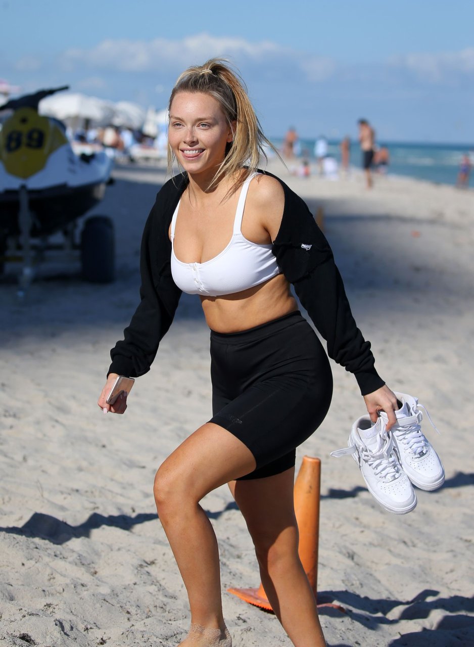 A modelo da Sports Illustrated Camille Kostek (26) usa um top de biquíni branco enquanto anda de jet ski em Miami, 01/06/2019. Seu namorado, a lenda da NFL Rob Gronkowski, não foi visto em lugar algum.
