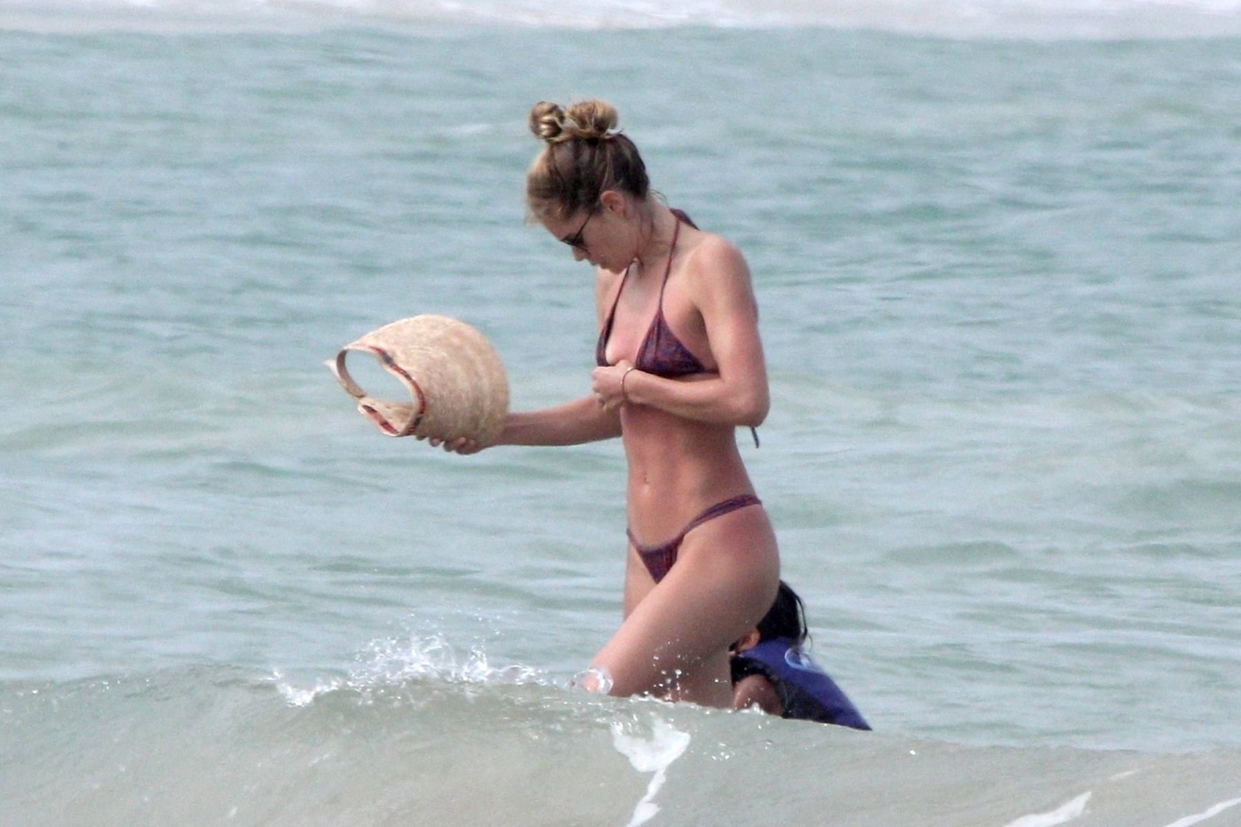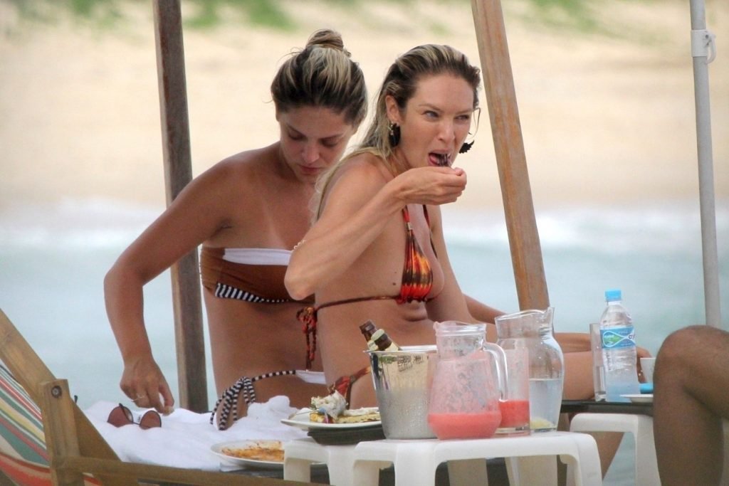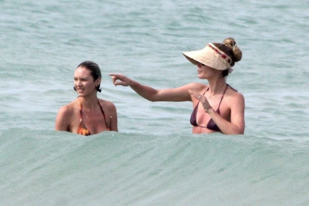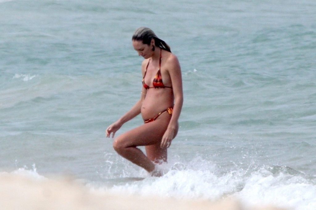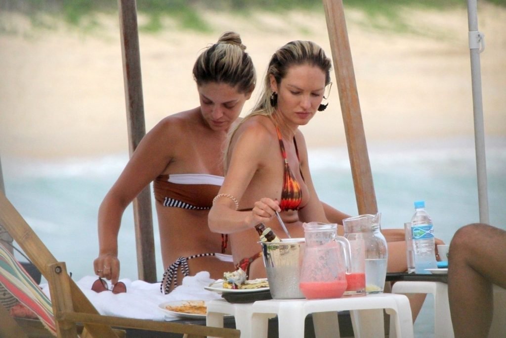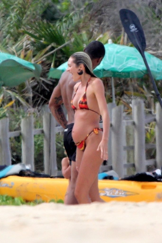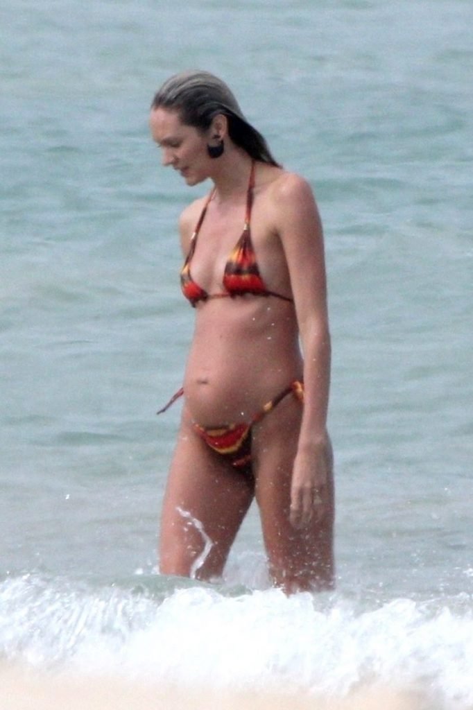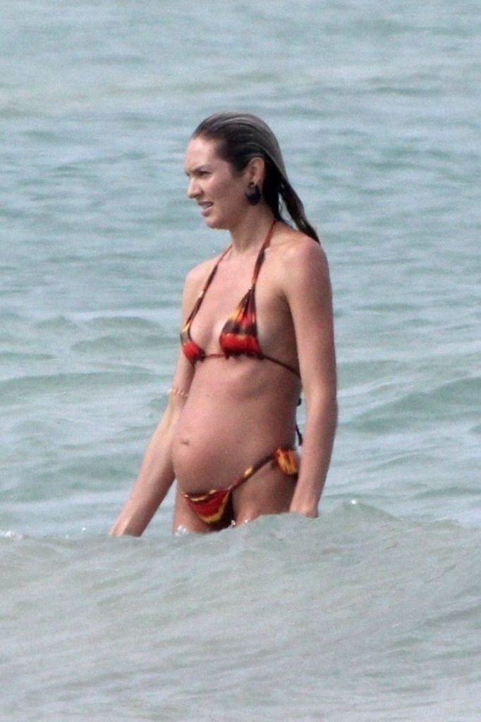 Grávida, Candice Swanepoel deixa sua barriga aproveitar mais um dia de praia com Doutzen Kroes e sua família na praia da Bahia, 01/10/2018.