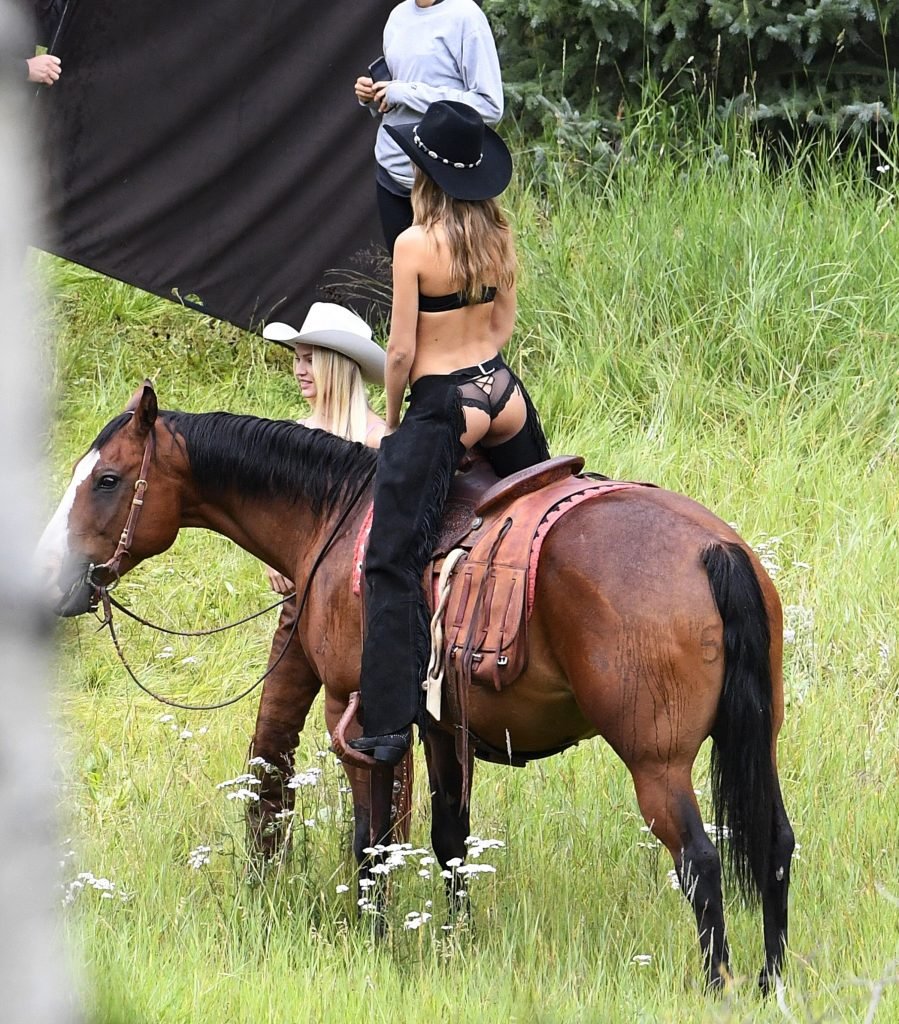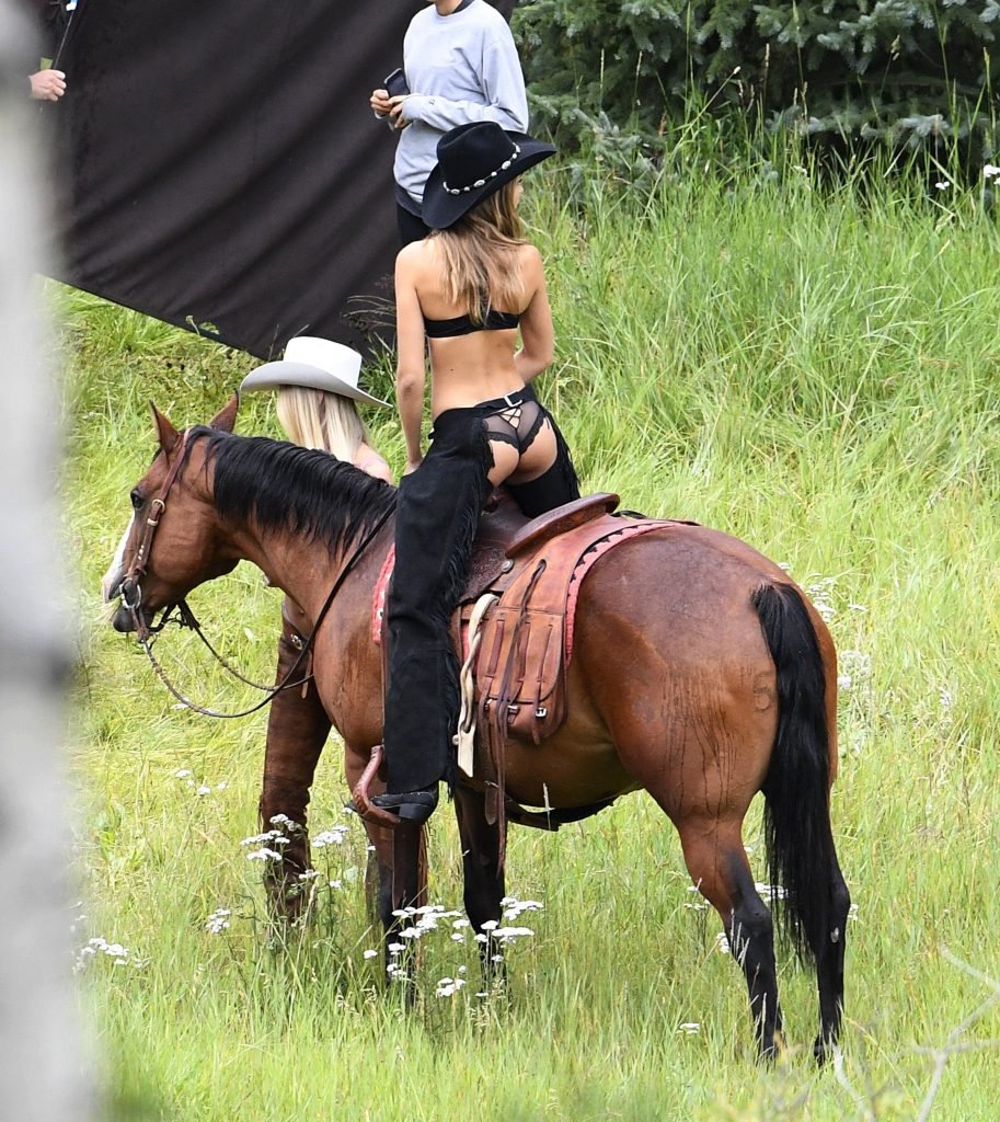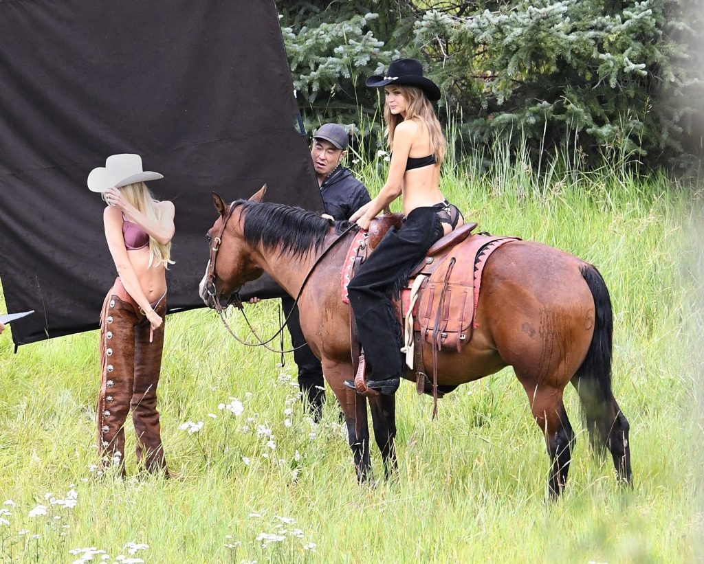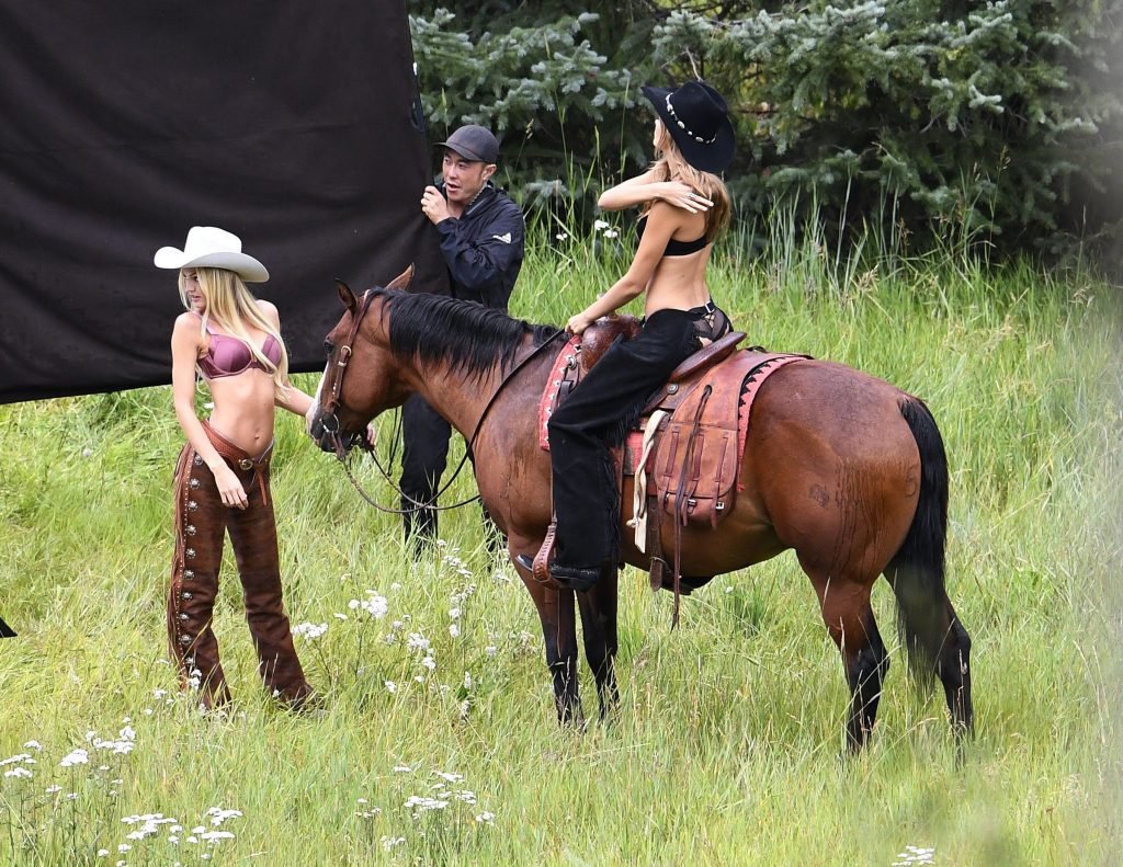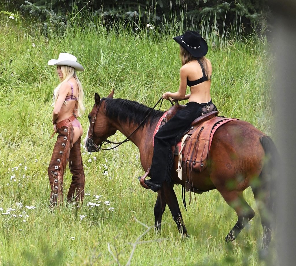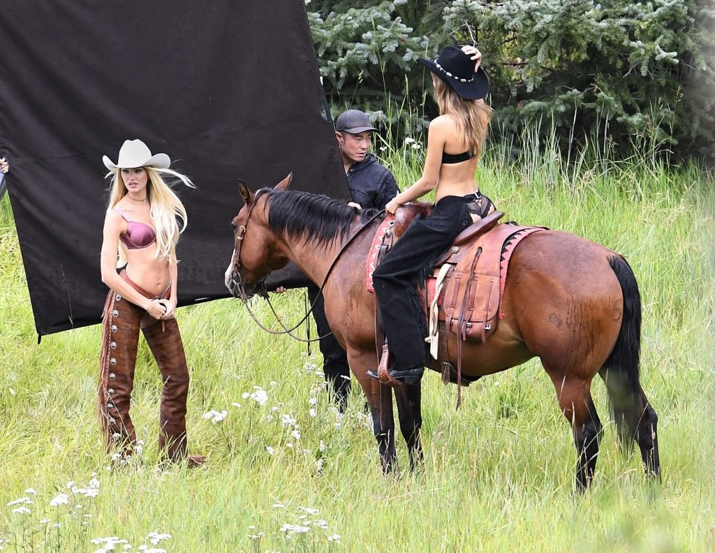 Supermodelos Candice Swanepoel e Josephine Skriver foram vistas usando roupas sexy de cowboy enquanto gravavam para o próximo catálogo de férias da Victoria’s Secret em Aspen, 15/08/2017.
