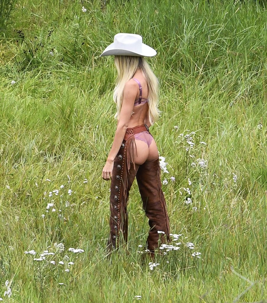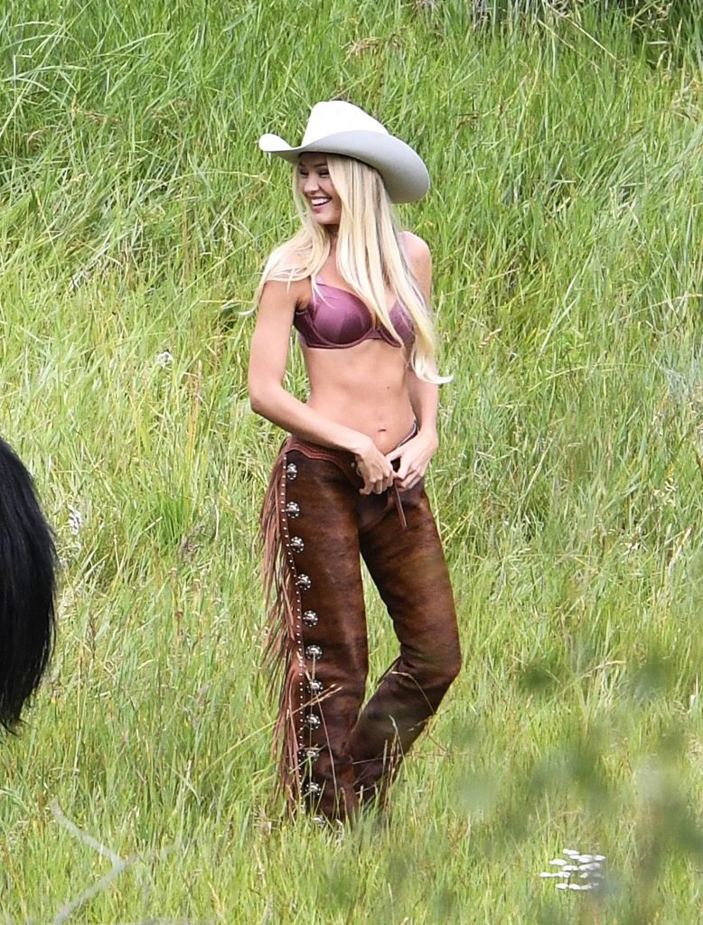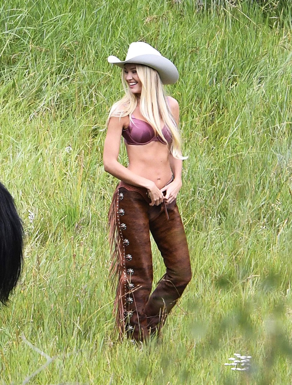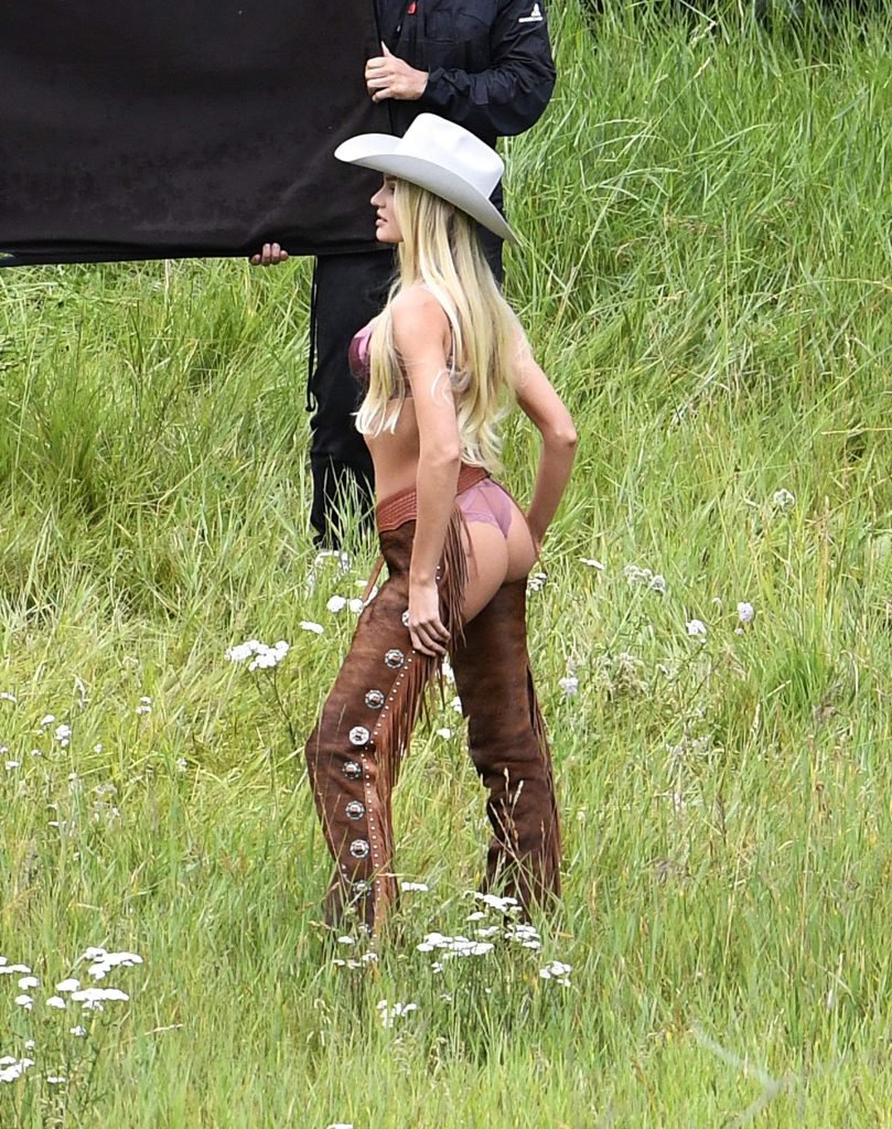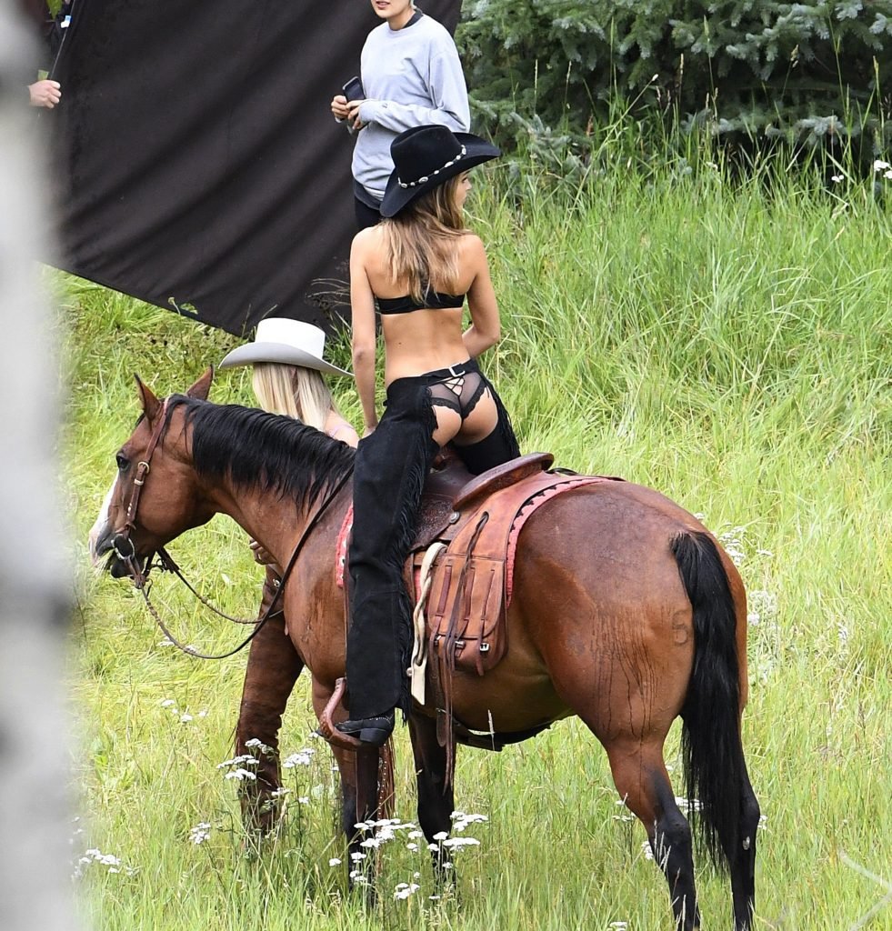 Supermodelos Candice Swanepoel e Josephine Skriver foram vistas usando roupas sexy de cowboy enquanto gravavam para o próximo catálogo de férias da Victoria’s Secret em Aspen, 15/08/2017.