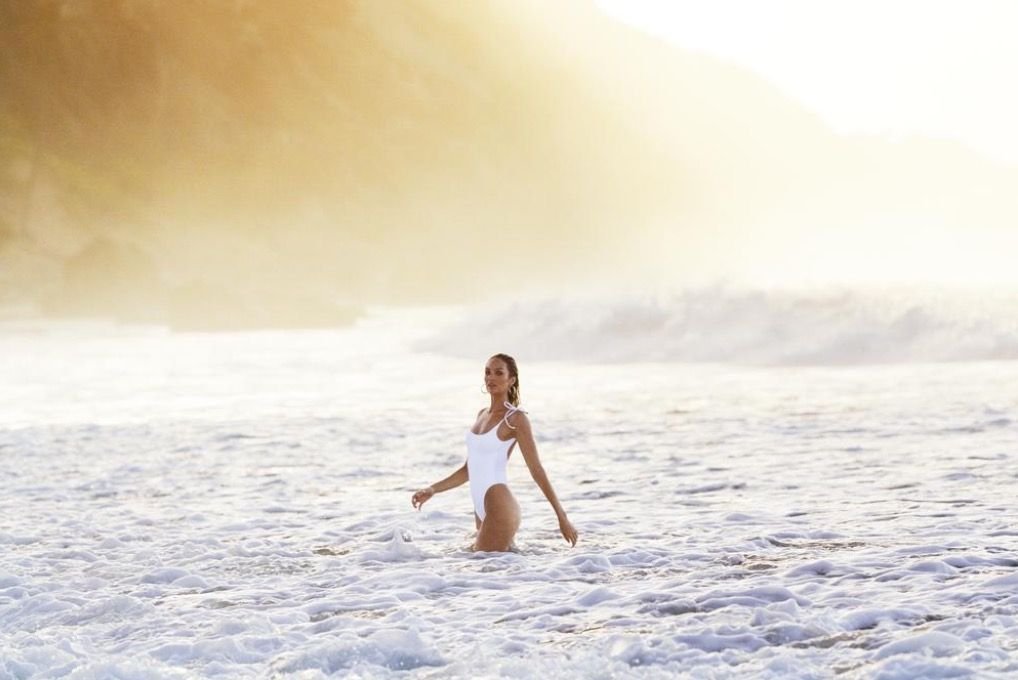 Model Candice Swanepoel, 29, promove sua nova coleção Tropic of C (2018).