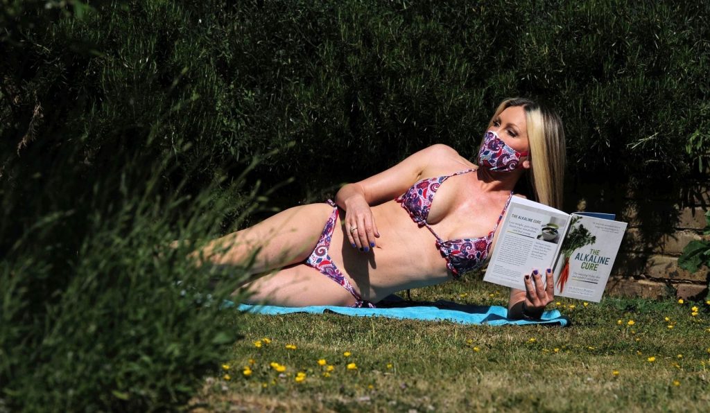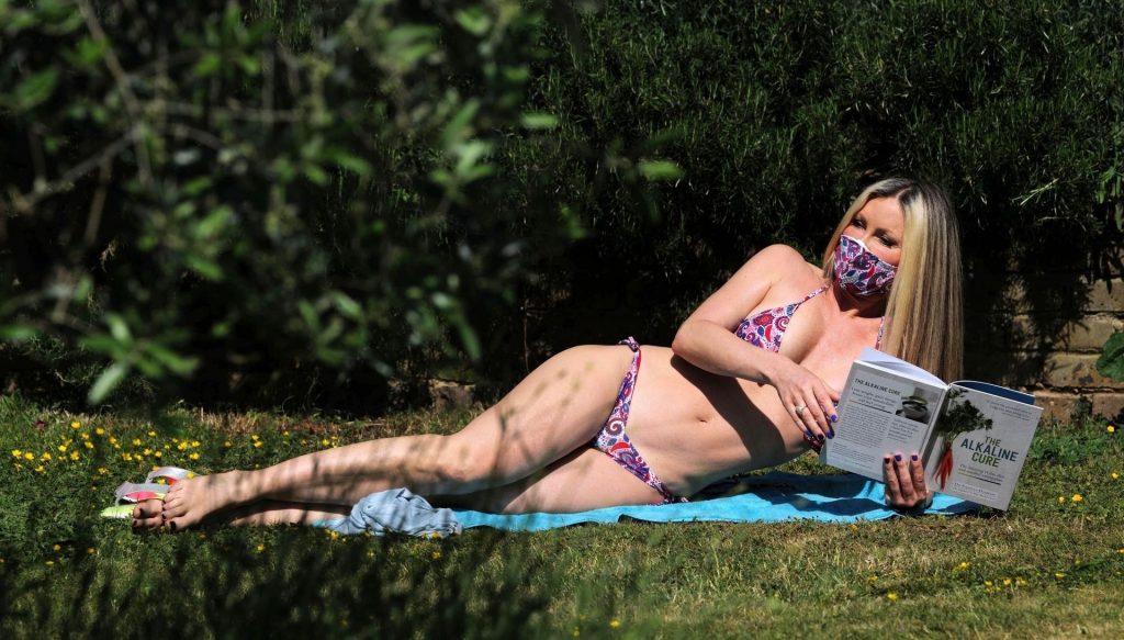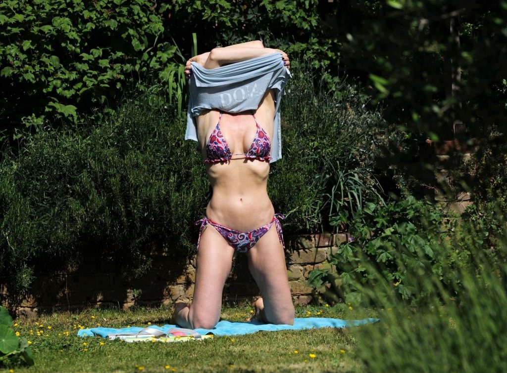 A modelo americana de 48 anos Caprice Bourret exibe seu físico tonificado enquanto toma sol usando um sexy trikini de três peças combinando em um parque de Londres, aproveitando o recente clima quente de verão, 31/05/2020.