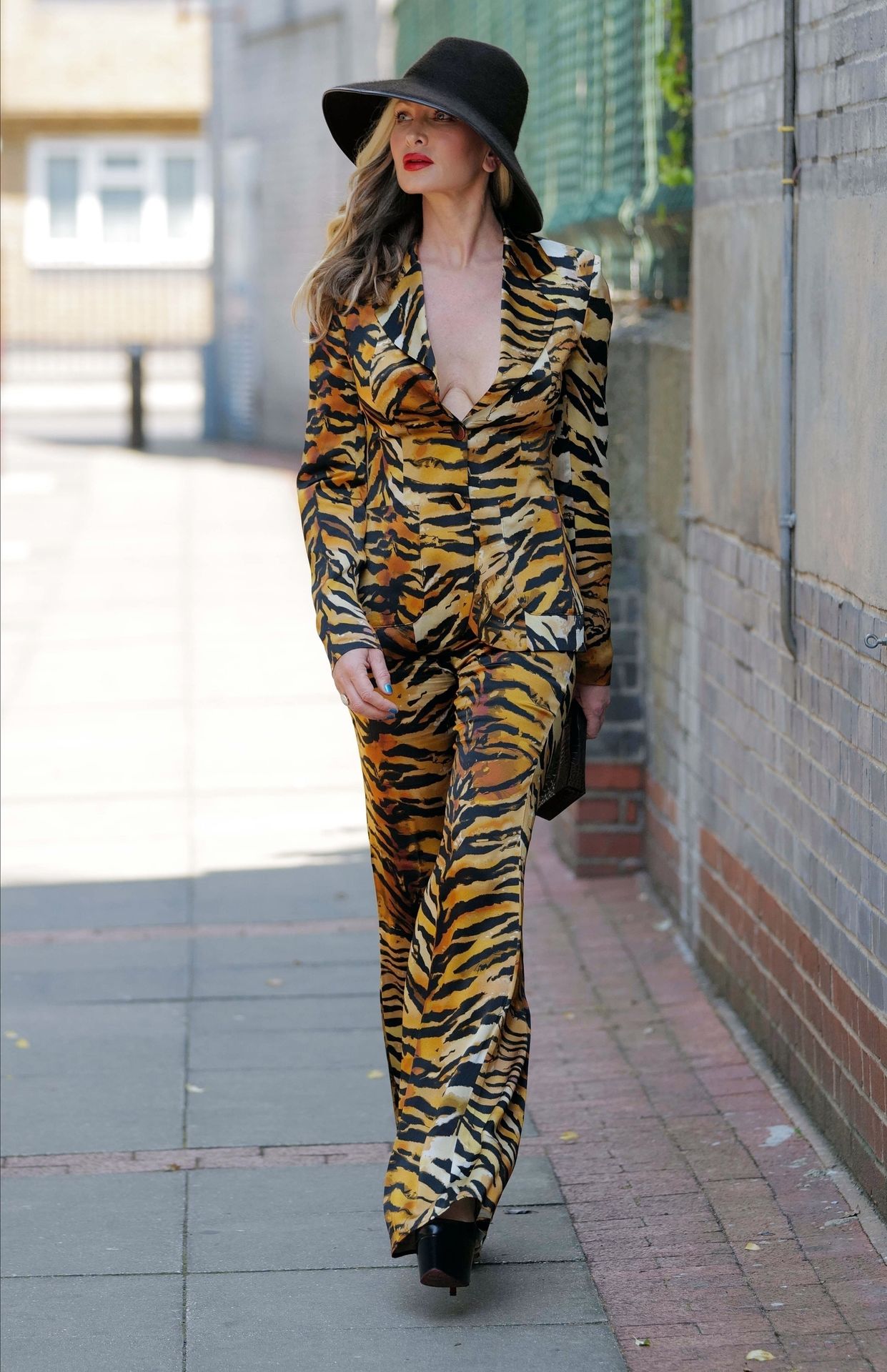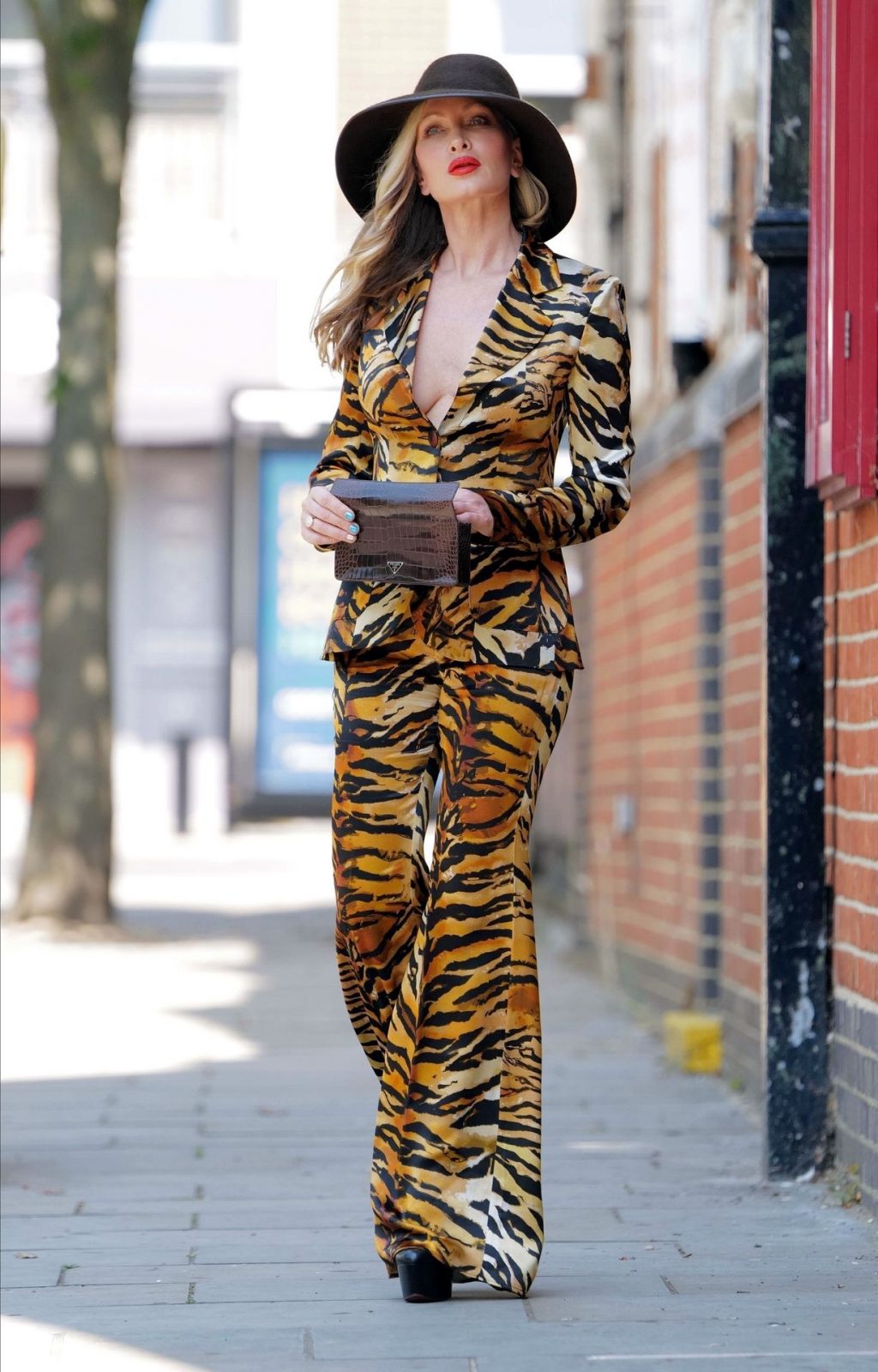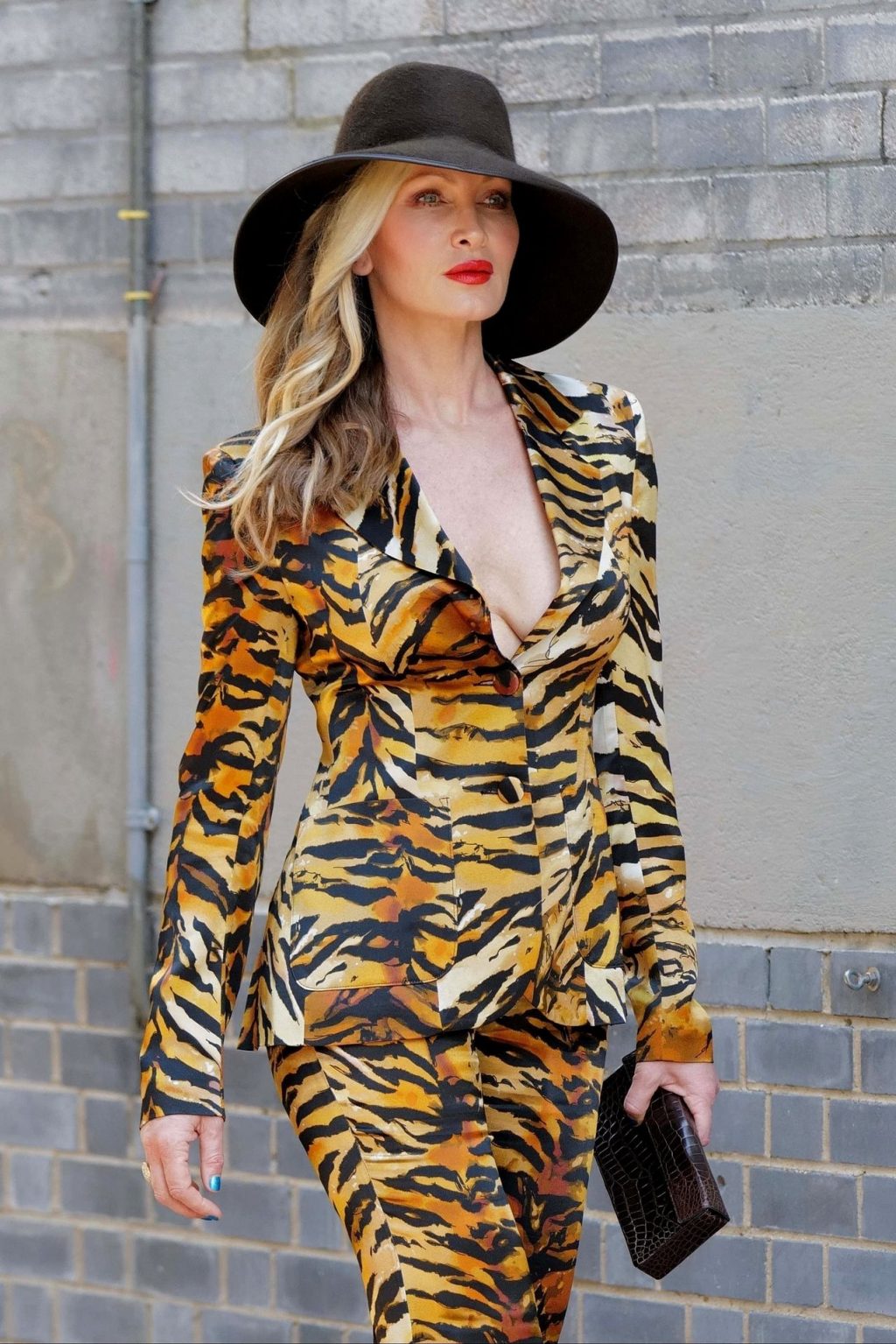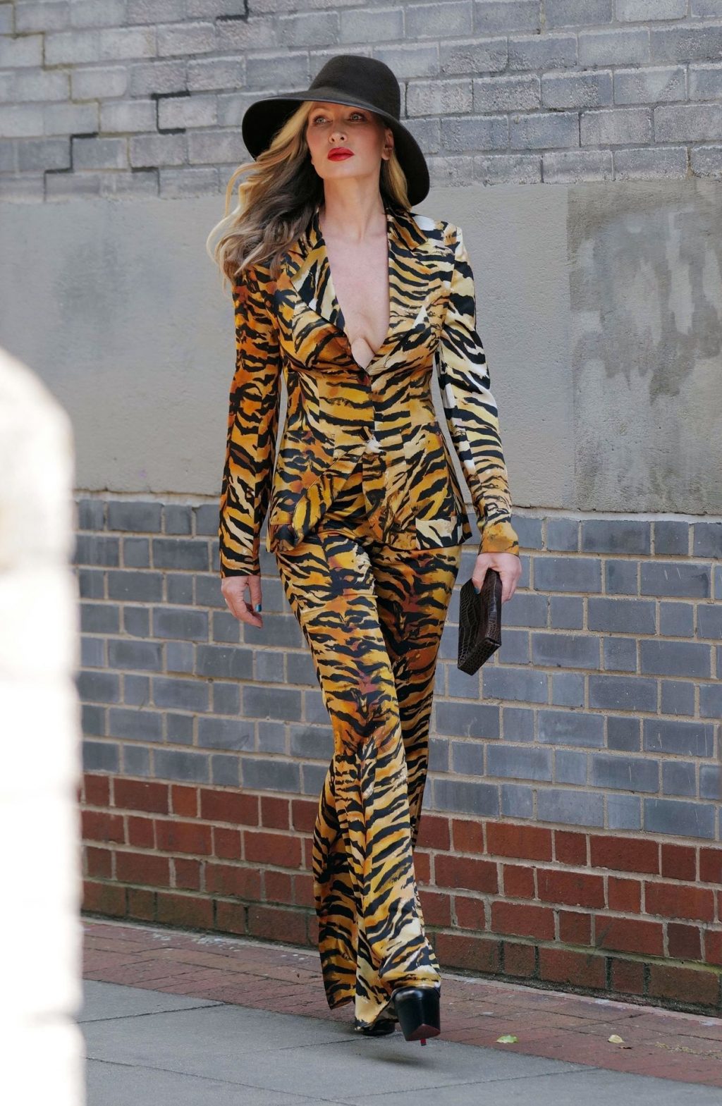 A modelo americana Caprice vai sem sutiã em um conjunto poderoso com estampa de tigre decotado enquanto caminha para uma reunião de negócios em Londres, 07/06/2020.
