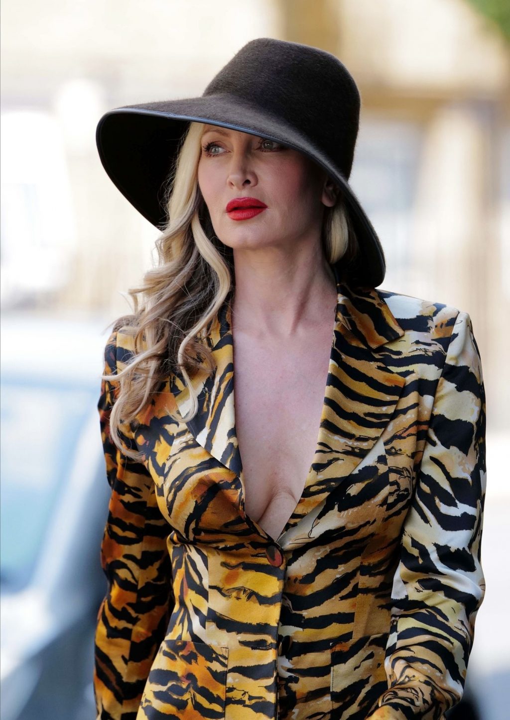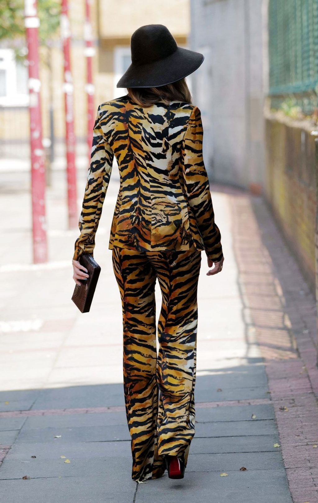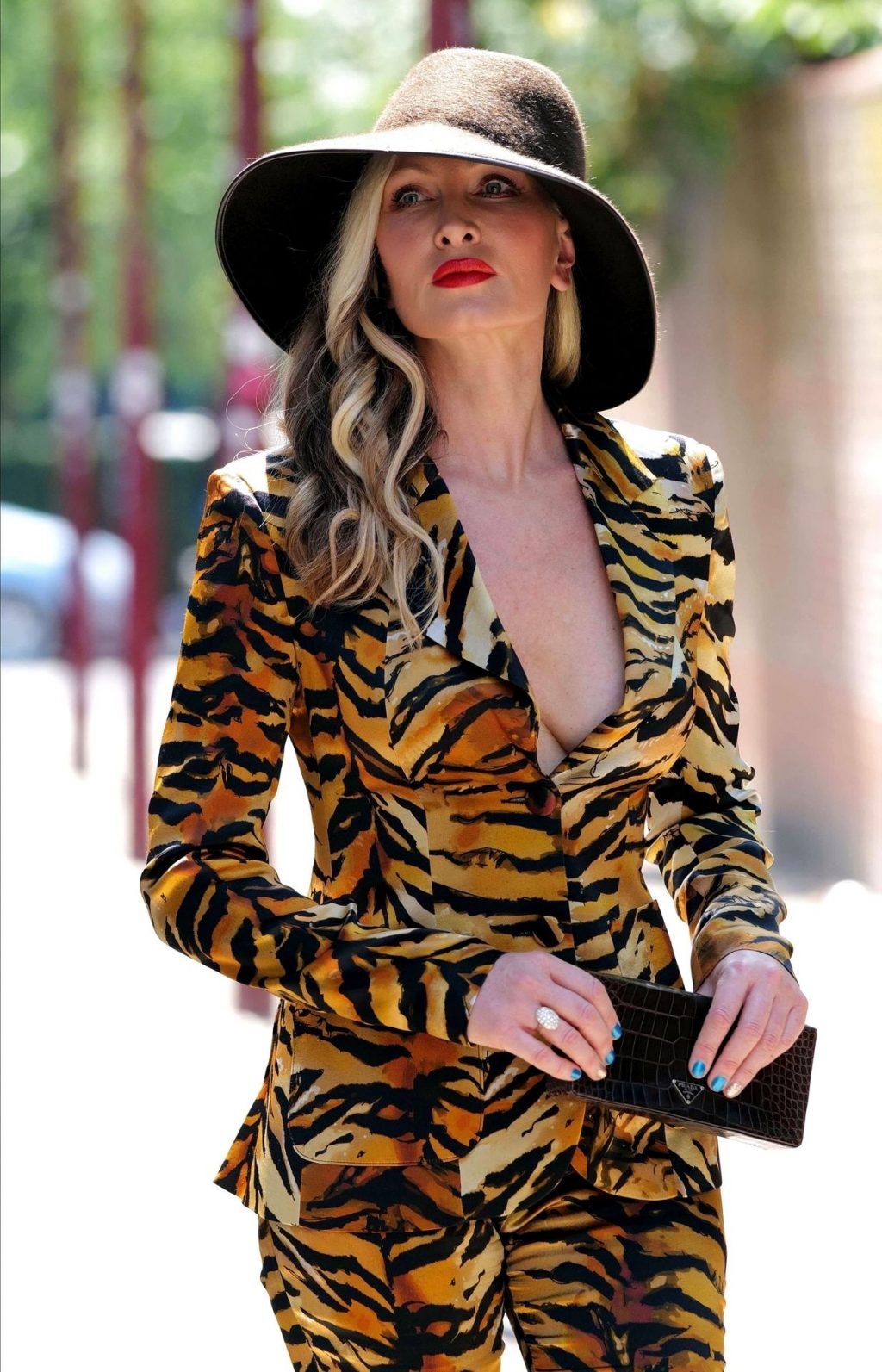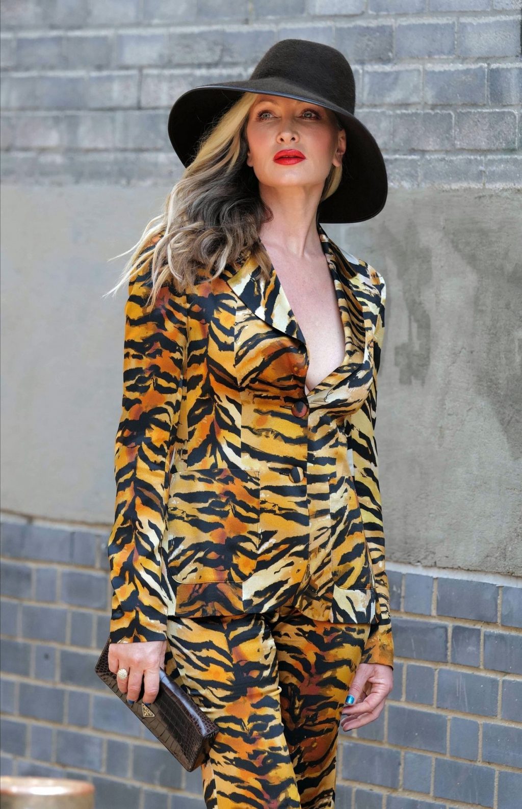 A modelo americana Caprice vai sem sutiã em um conjunto poderoso com estampa de tigre decotado enquanto caminha para uma reunião de negócios em Londres, 07/06/2020.