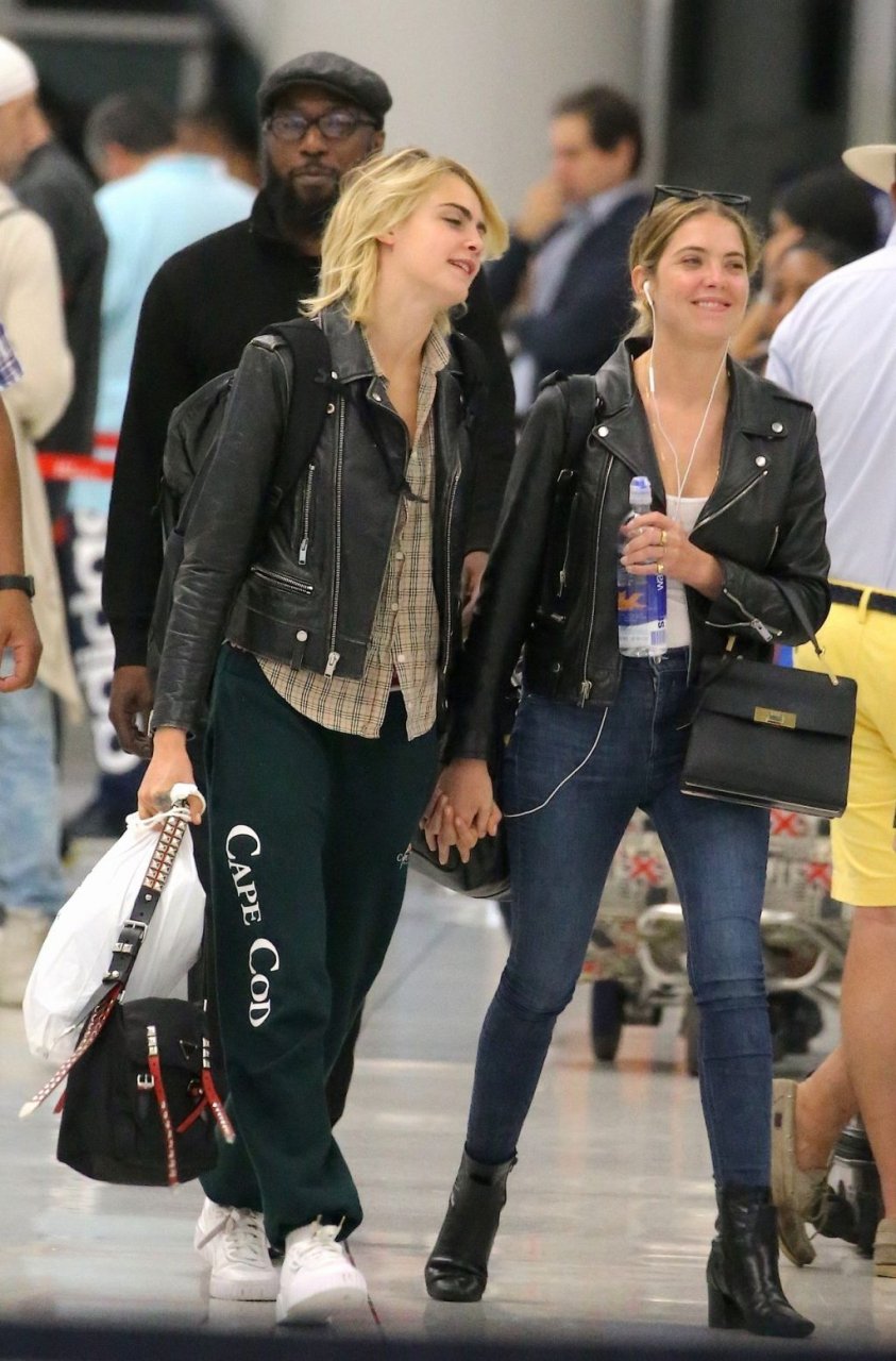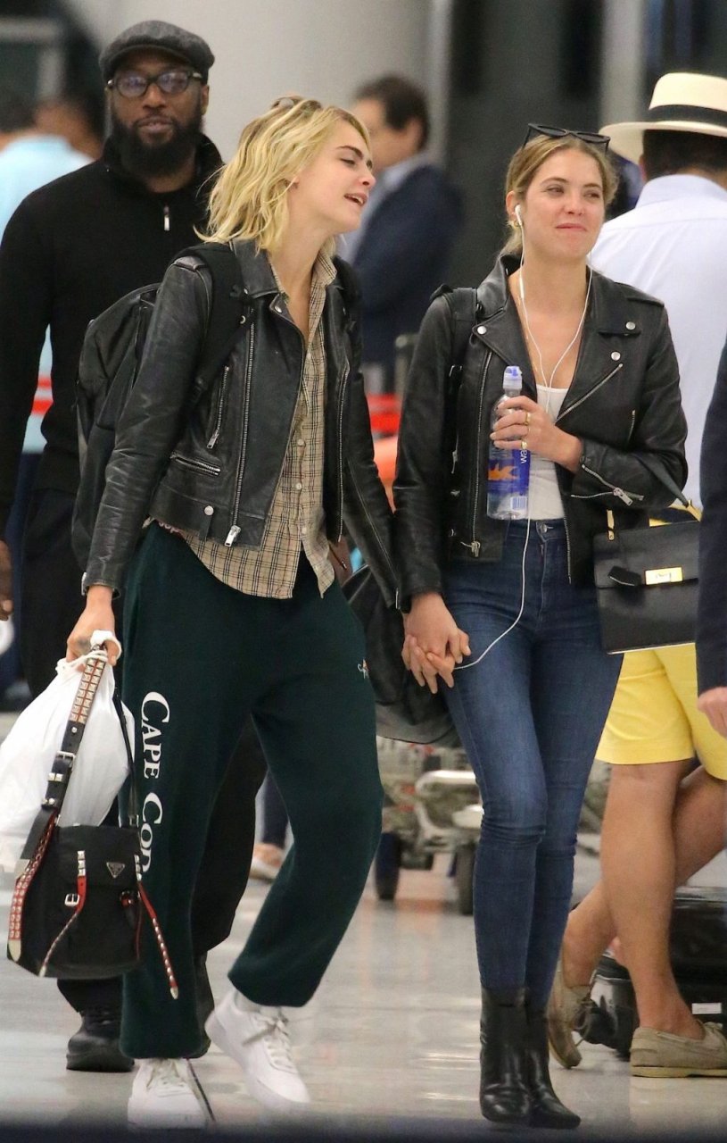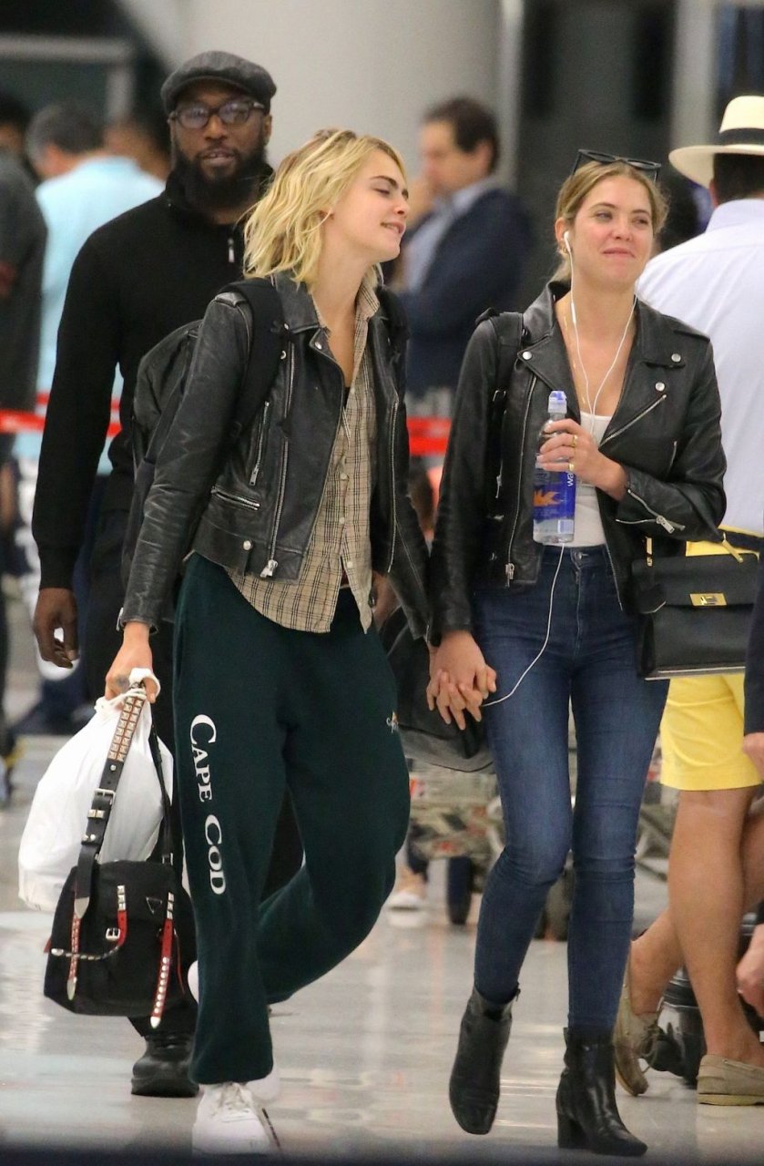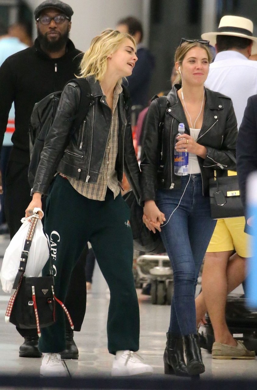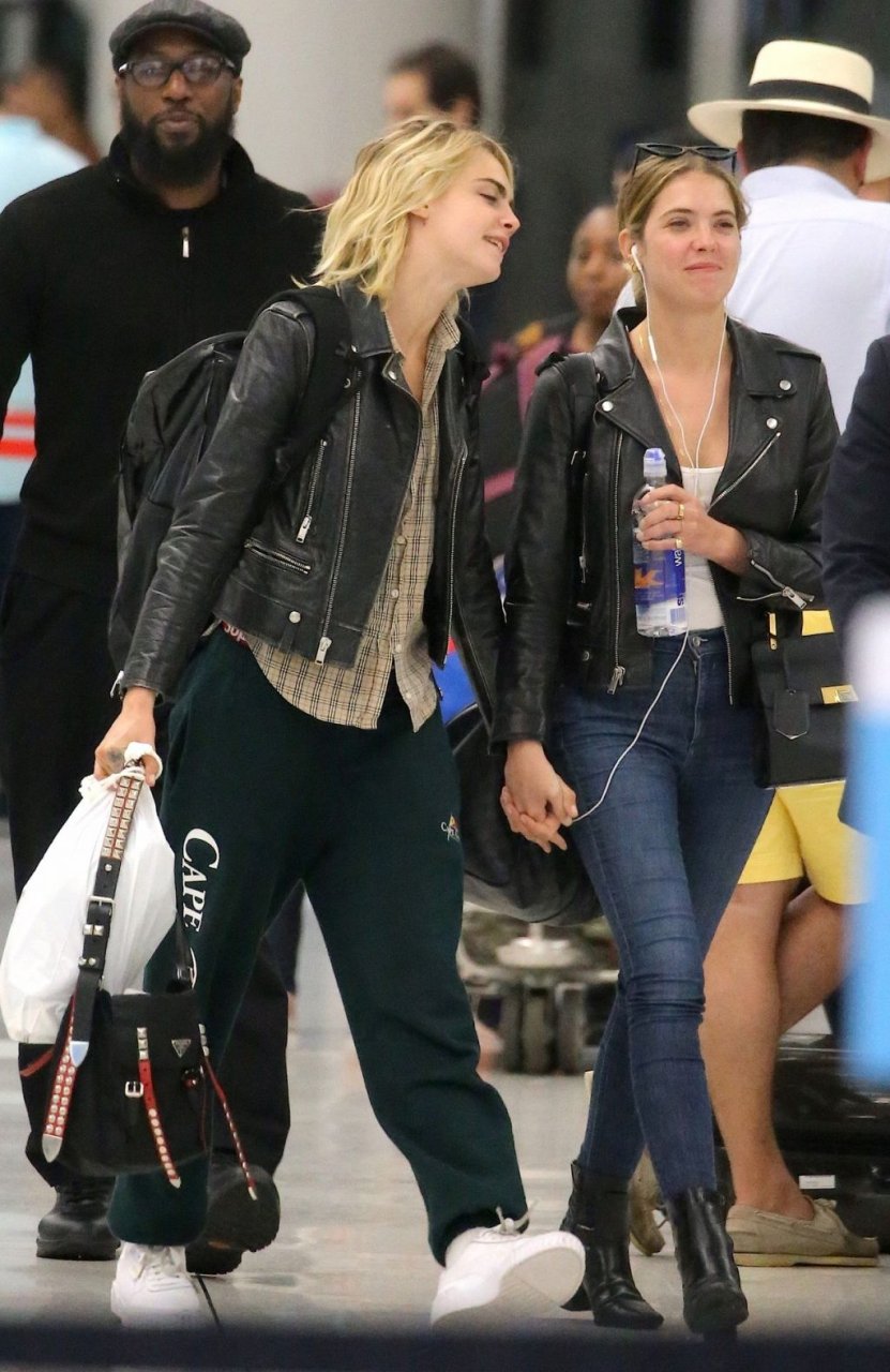 Confira novas fotos de paparazzi do famoso casal lésbico. Cara Delevingne e Ashley Benson foram vistas no aeroporto JFK em Nova York se beijando e se abraçando na fila de segurança, 18/06/2019.