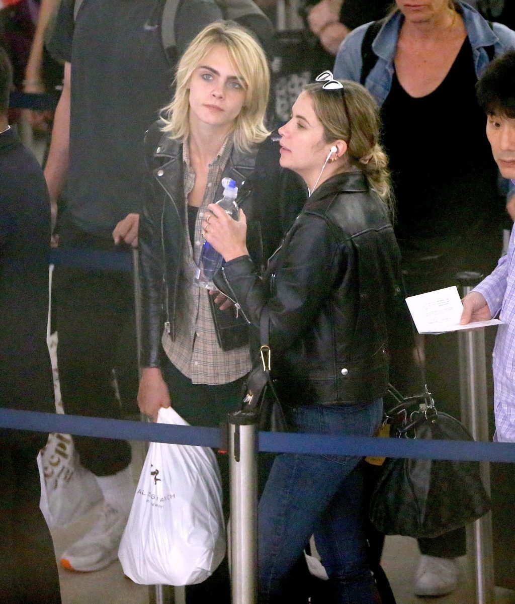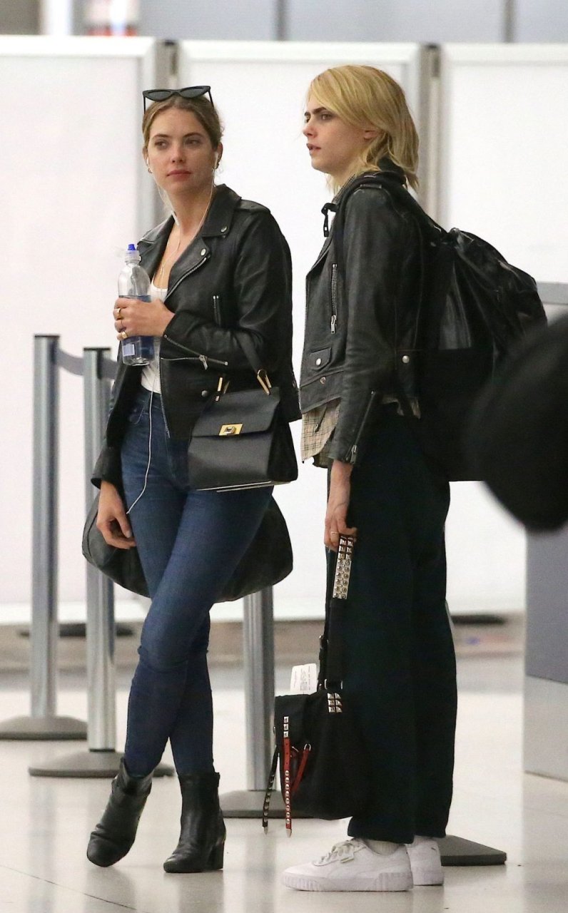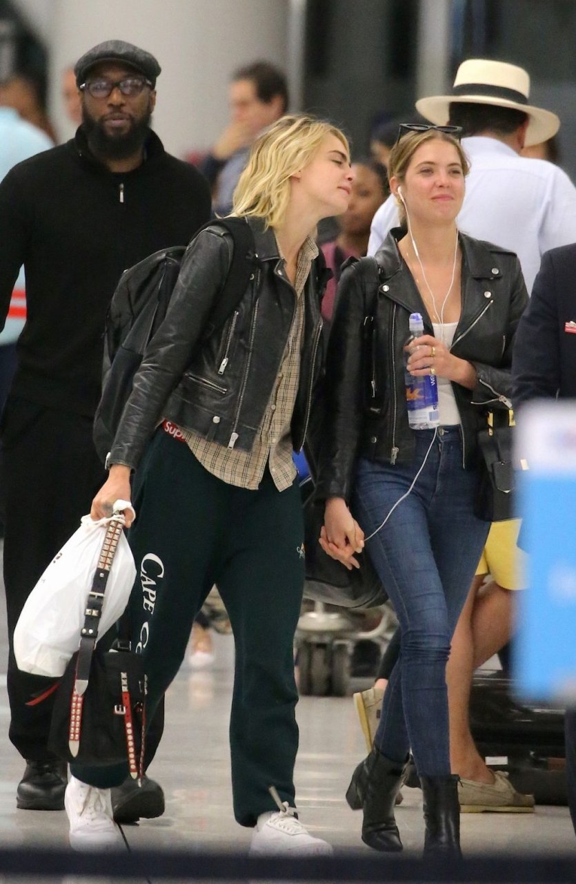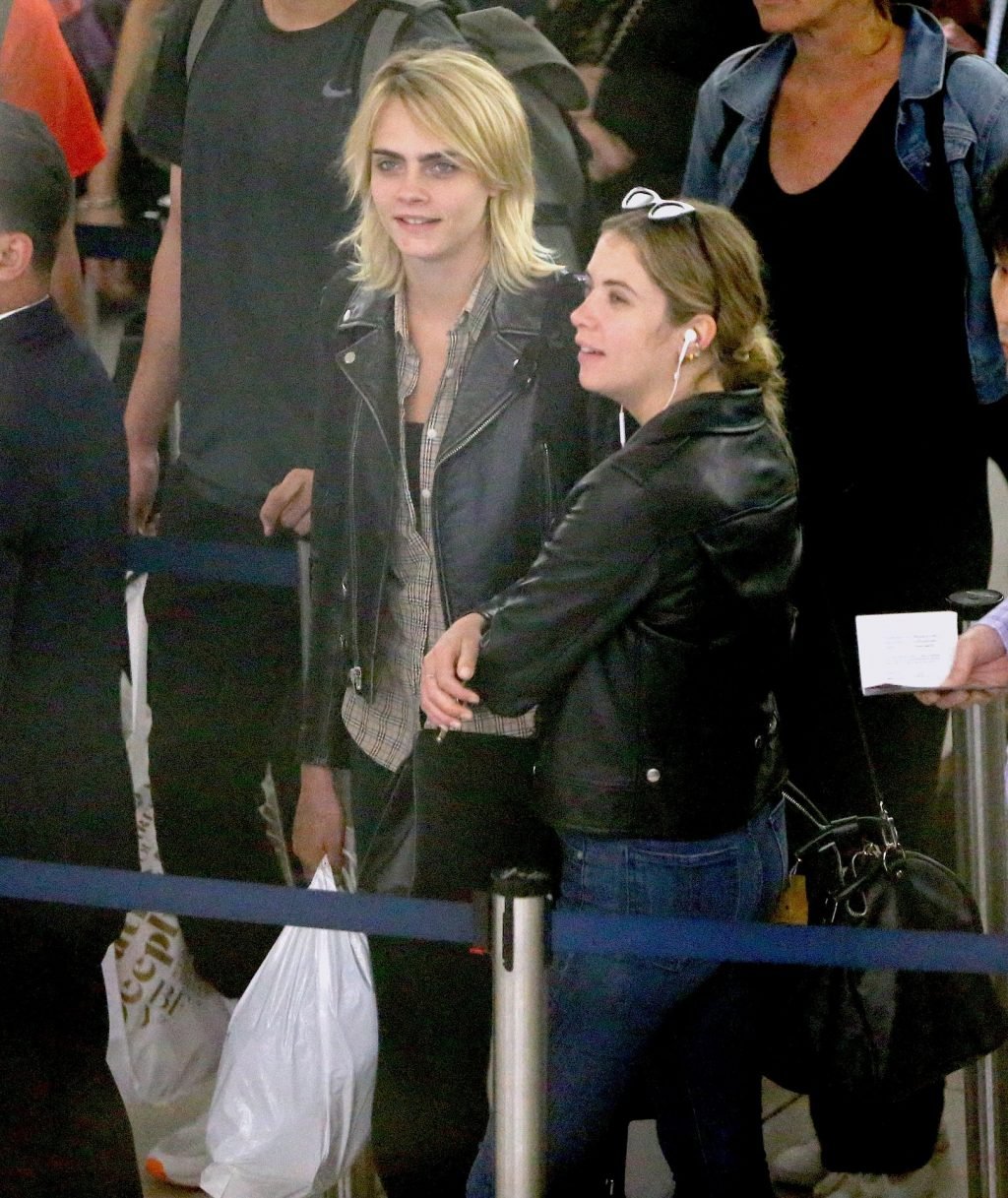 Confira novas fotos de paparazzi do famoso casal lésbico. Cara Delevingne e Ashley Benson foram vistas no aeroporto JFK em Nova York se beijando e se abraçando na fila de segurança, 18/06/2019.