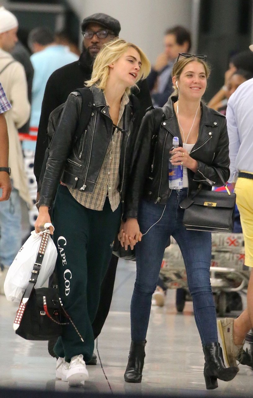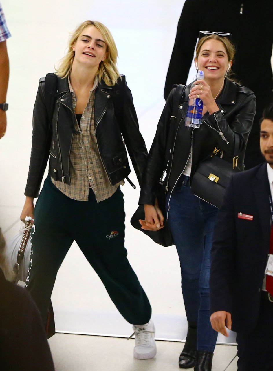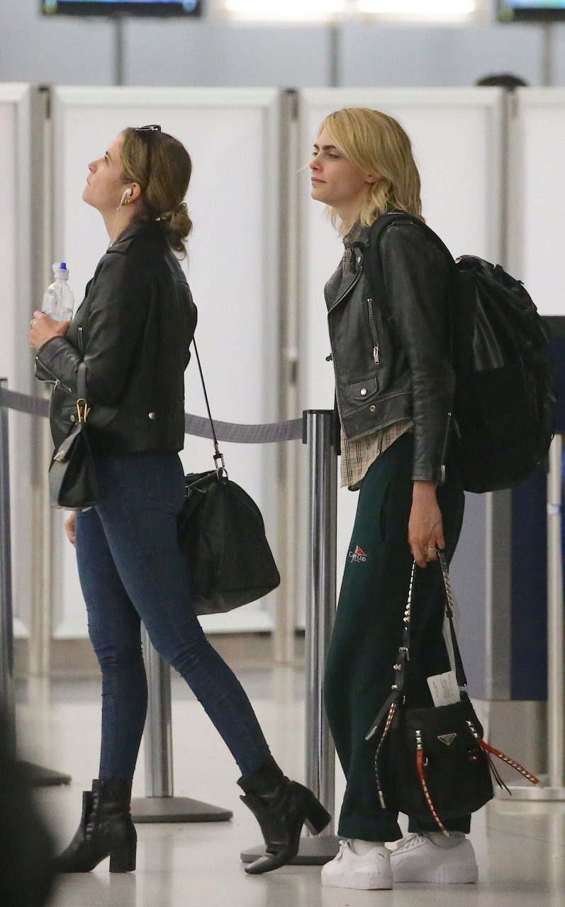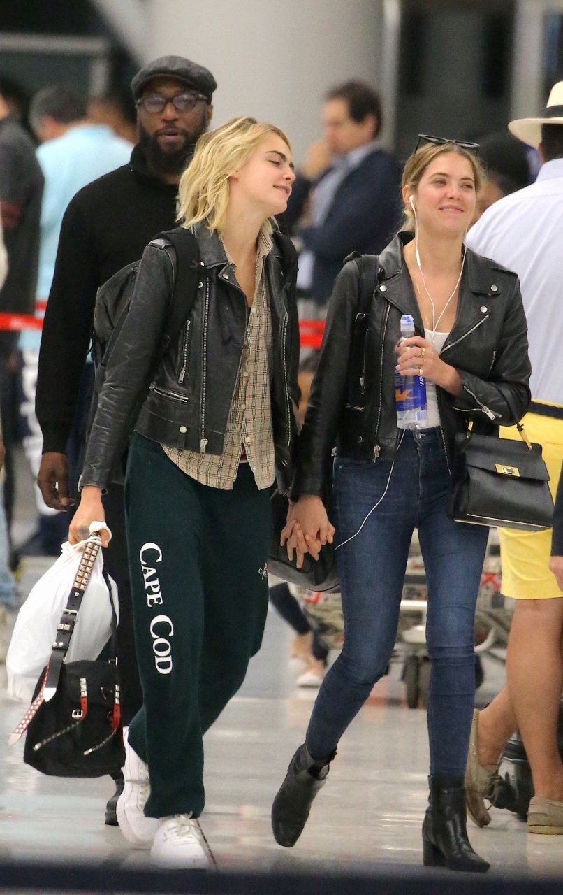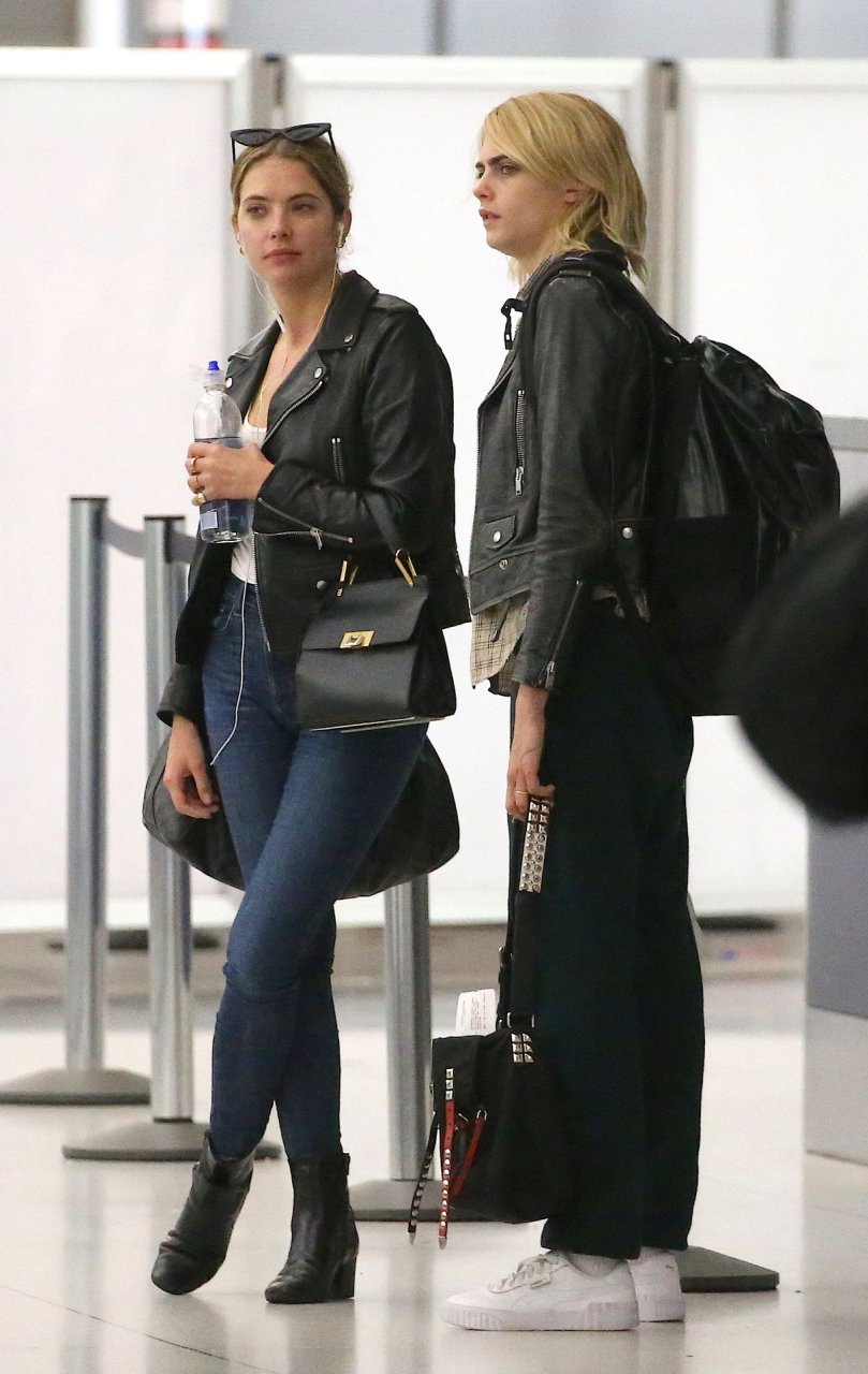 Confira novas fotos de paparazzi do famoso casal lésbico. Cara Delevingne e Ashley Benson foram vistas no aeroporto JFK em Nova York se beijando e se abraçando na fila de segurança, 18/06/2019.