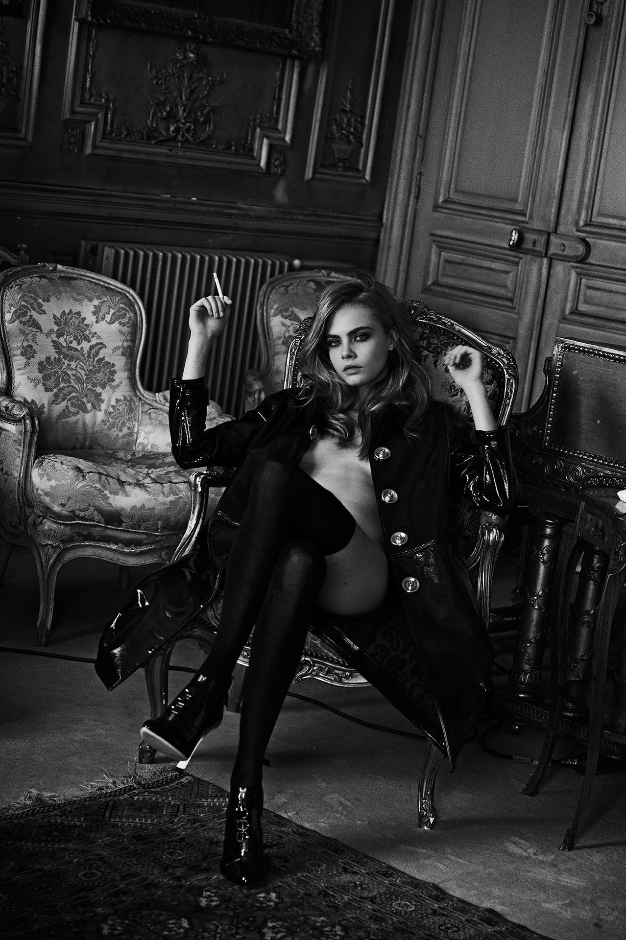 Confira as fotos nuas de Cara Delevingne por Peter Lindbergh para a revista Interview (2013). A modelo/atriz exibe seus seios pequenos, posando topless em Paris.