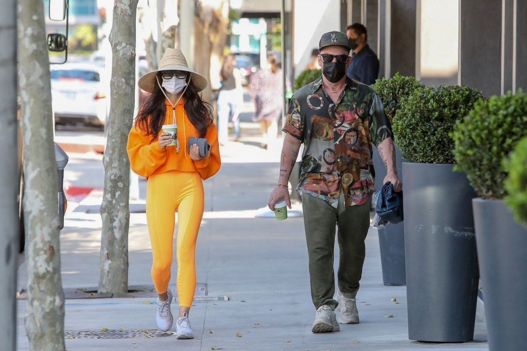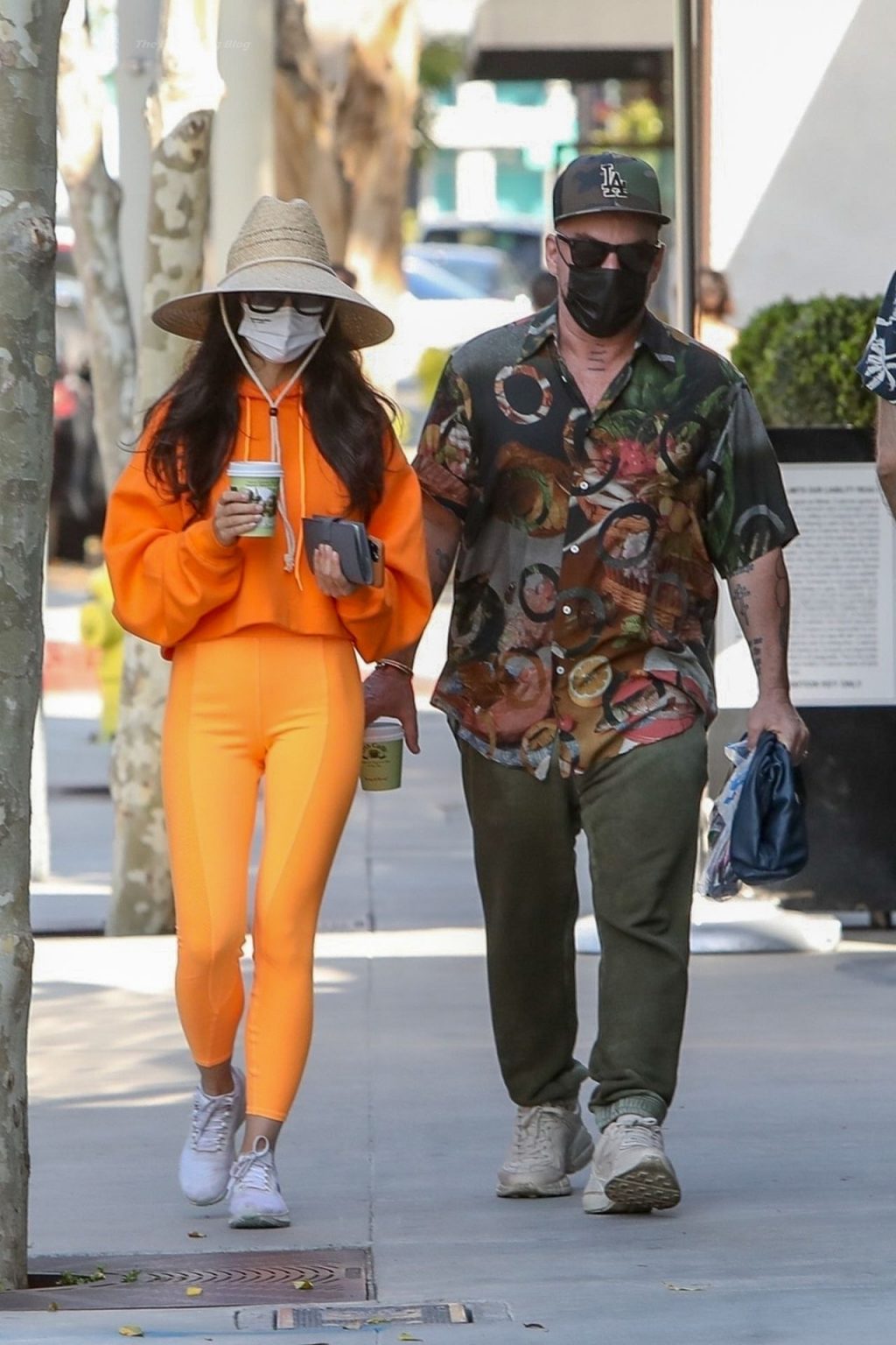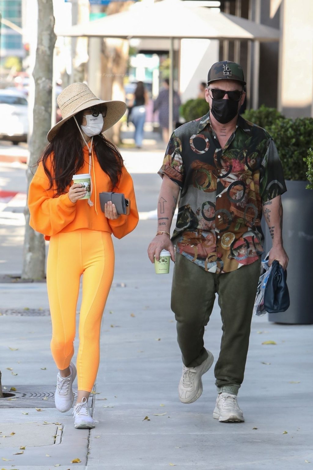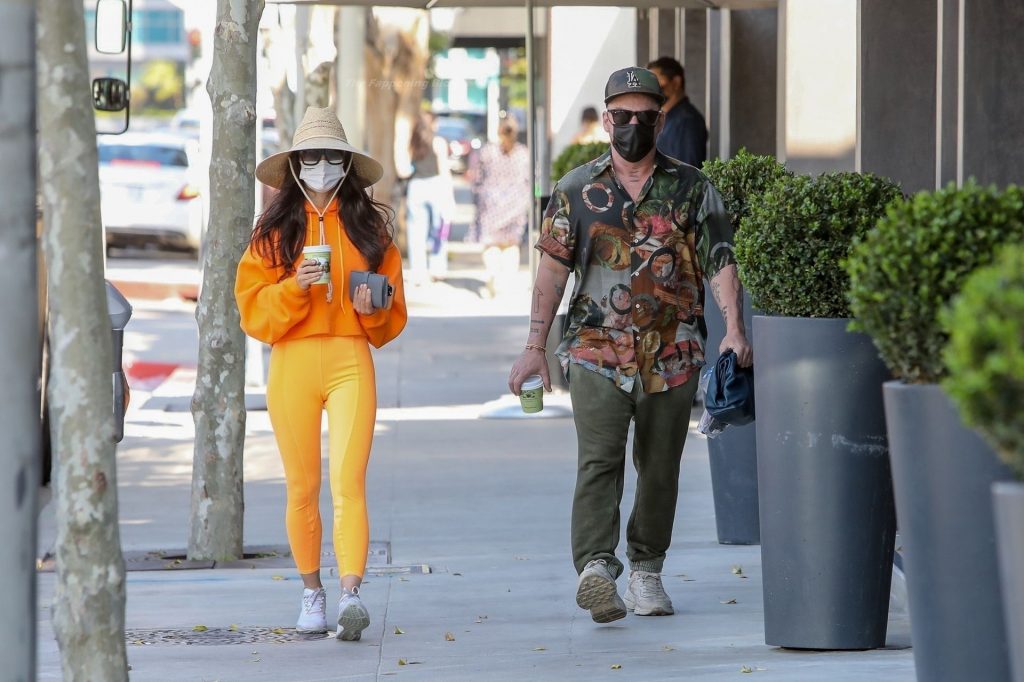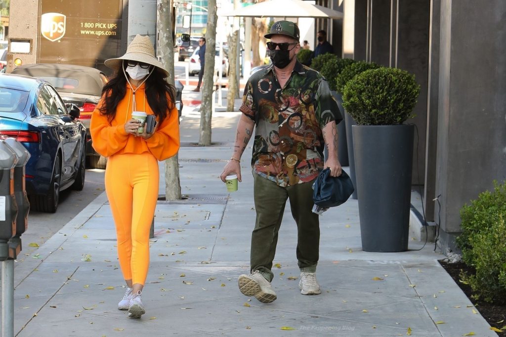 A atriz Cara Santana e seu namorado baterista do Thirty Seconds to Mars, Shannon Leto, tomam café juntos no Urth Caffé em West Hollywood, 02/04/2021. Cara mostra levemente seu cameltoe, usando leggings laranja.