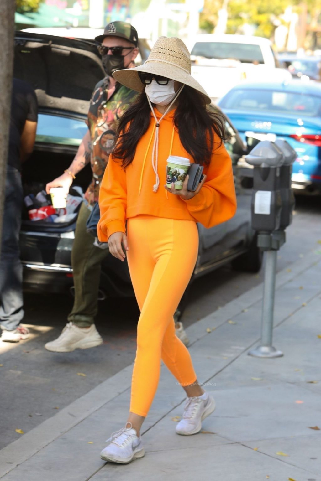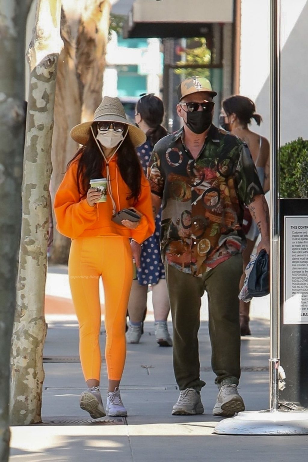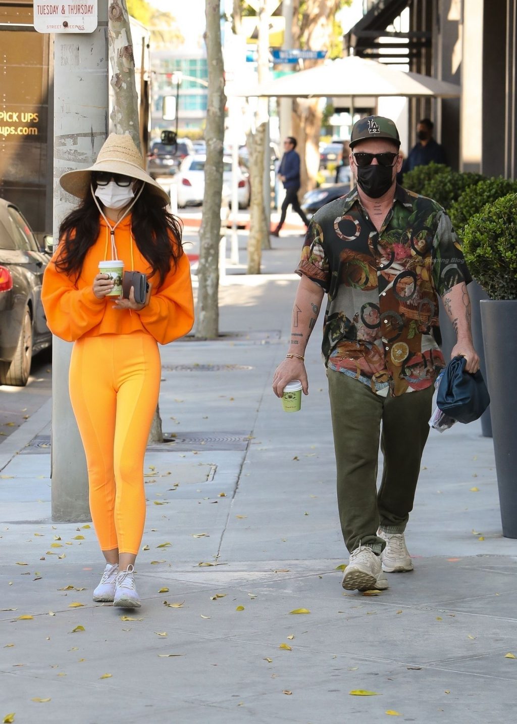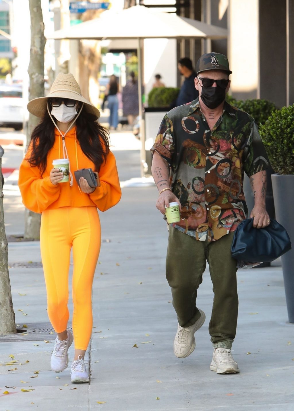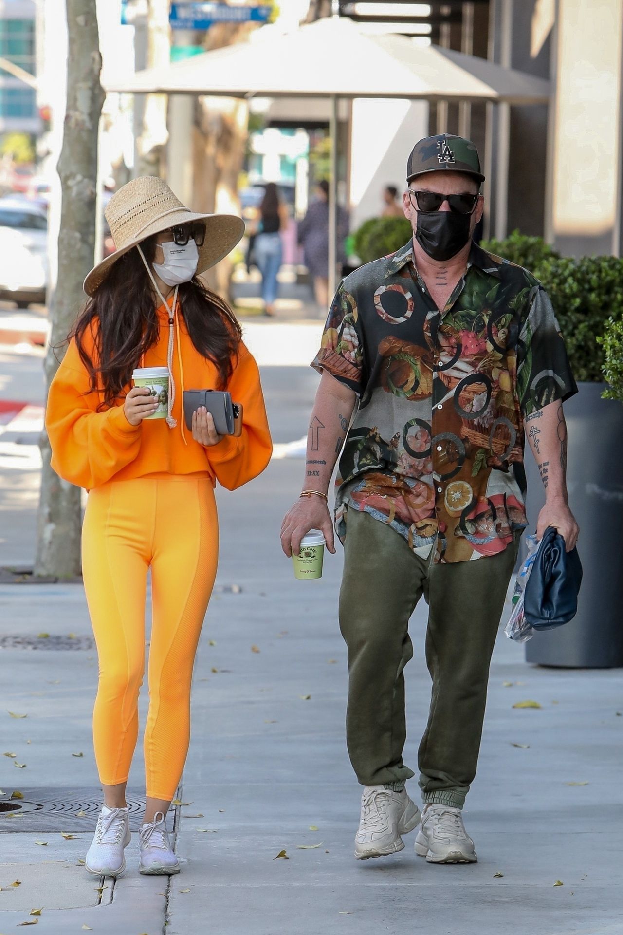A atriz Cara Santana e seu namorado baterista do Thirty Seconds to Mars, Shannon Leto, tomam café juntos no Urth Caffé em West Hollywood, 02/04/2021. Cara mostra levemente seu cameltoe, usando leggings laranja.