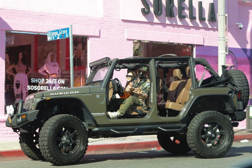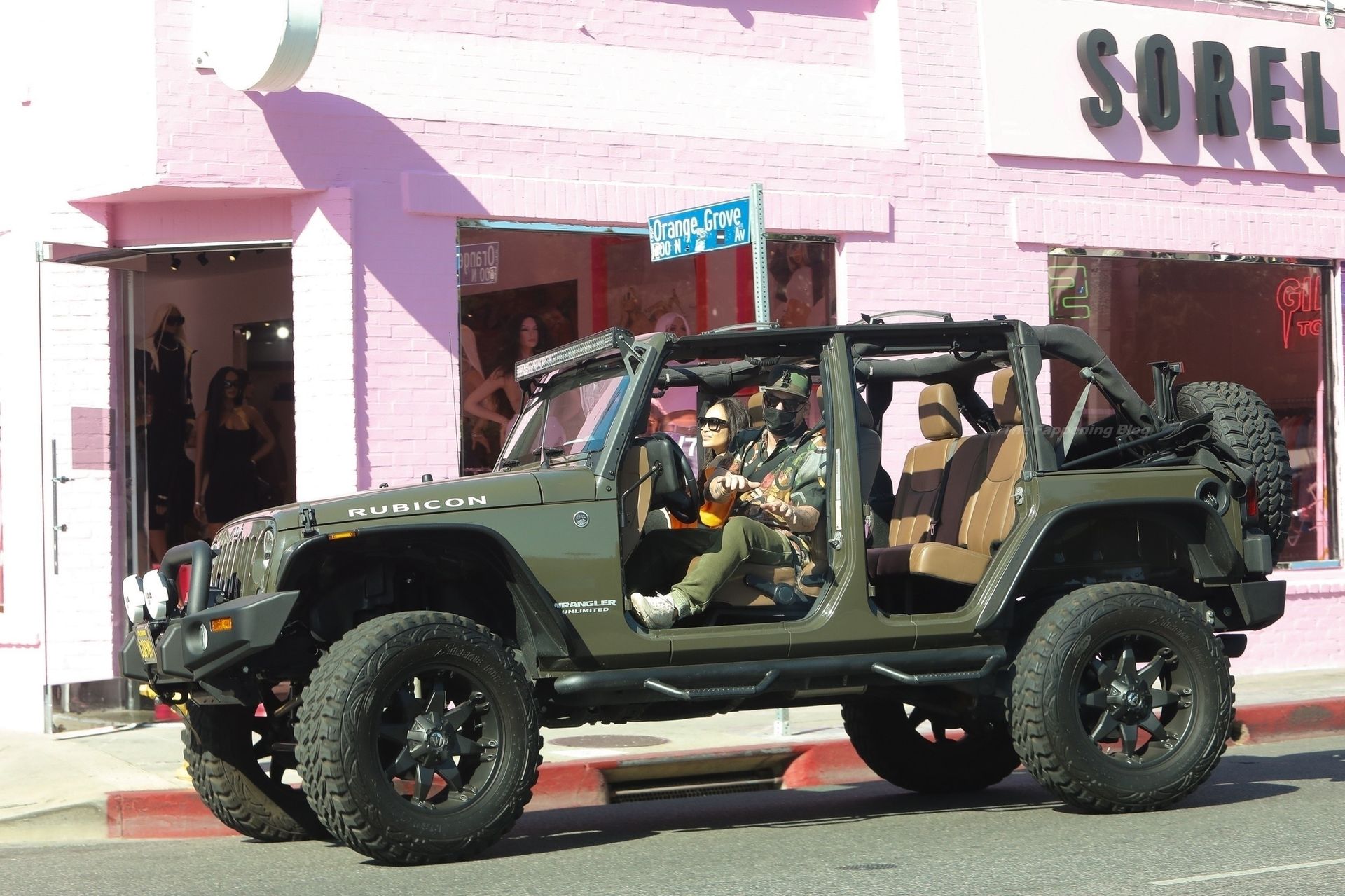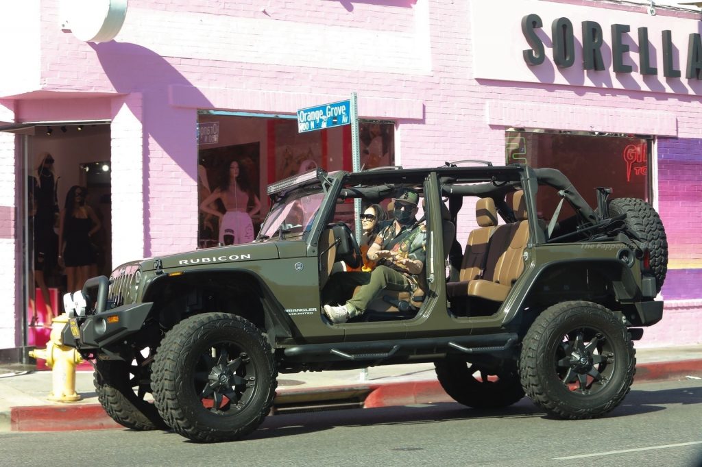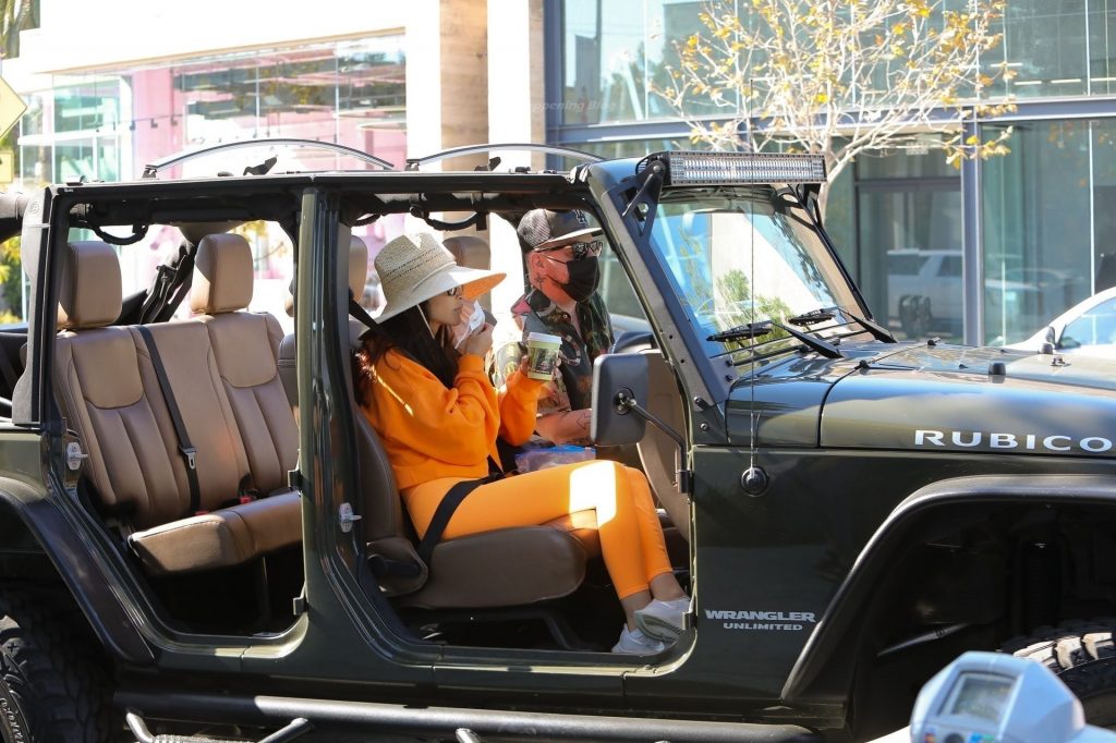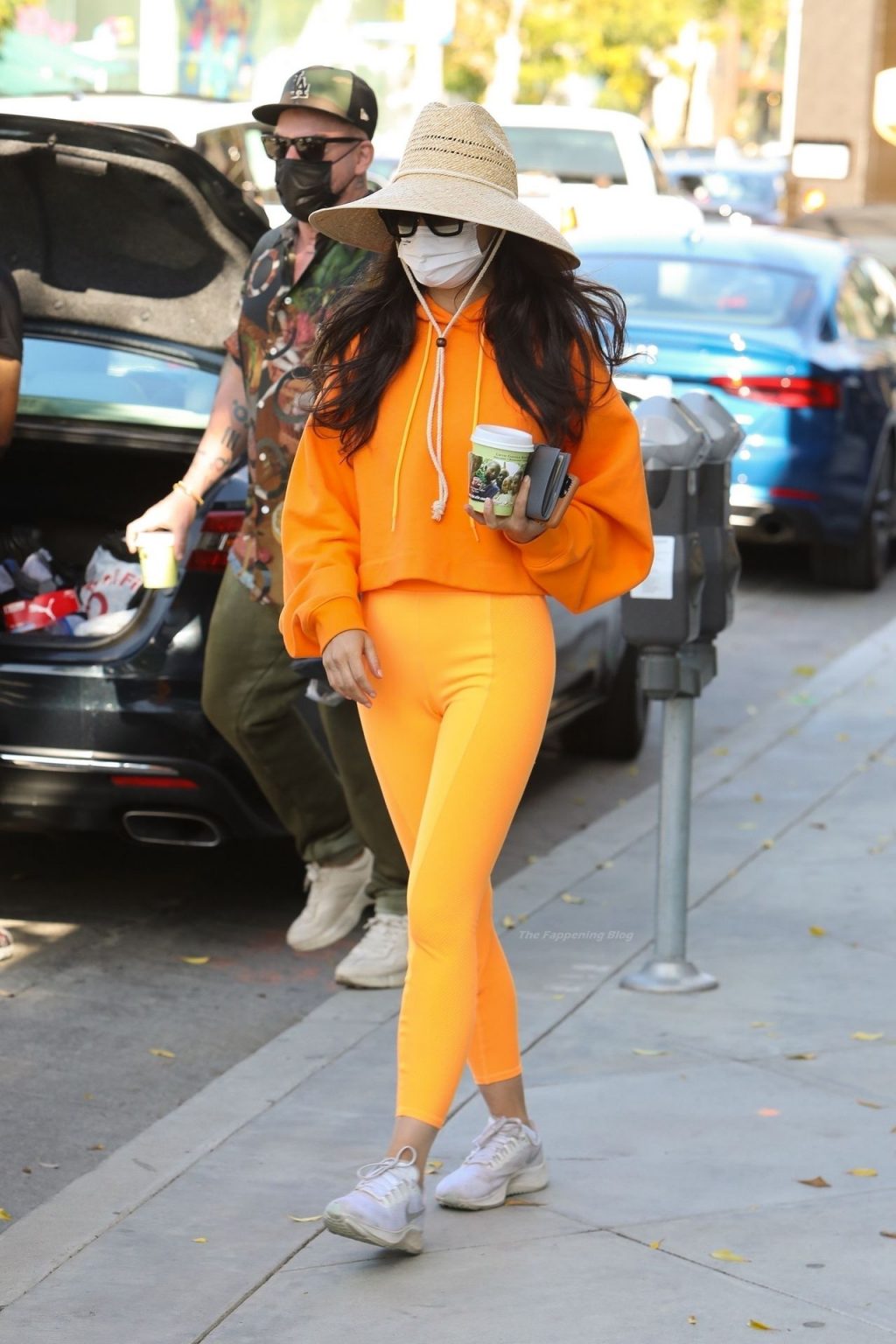 A atriz Cara Santana e seu namorado baterista do Thirty Seconds to Mars, Shannon Leto, tomam café juntos no Urth Caffé em West Hollywood, 02/04/2021. Cara mostra levemente seu cameltoe, usando leggings laranja.