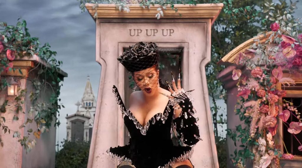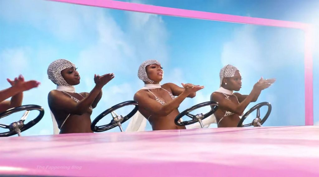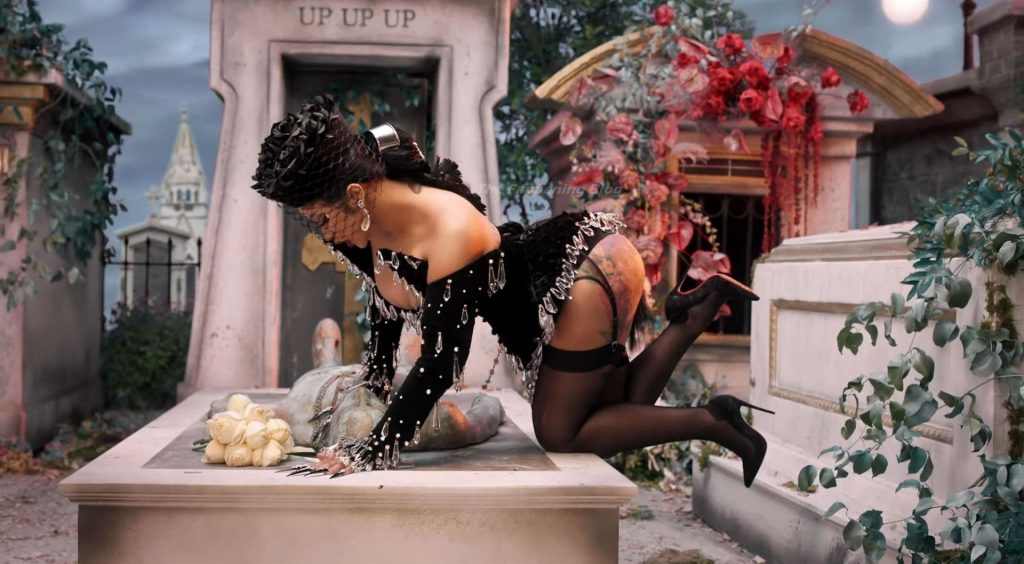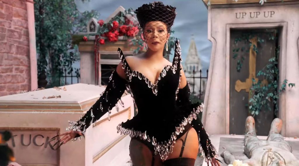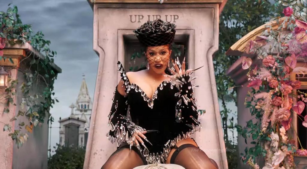 Mas talvez a homenagem de estilo mais marcante em Up venha perto do final do vídeo, quando a vencedora do Grammy homenageia a falecida rapper do TLC Lisa ‘Left Eye’ Lopes, que morreu em um acidente de carro em 2002, vestindo um body de couro preto com tachas e aquecedores de braço com franjas quase idênticos ao visual de Lopes no vídeo de No Scrubs de 1999.