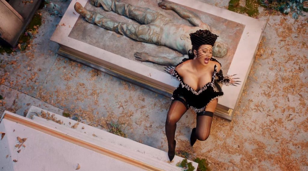 O vídeo começa com Cardi rebolando em um cemitério sobre uma cripta marcada com R.I.P. 2020, vestida com um traje funerário completo cravejado de cristais de lustre, incluindo um véu de rede e seus icônicos sapatos de sola vermelha. A partir daí, as imagens passam por uma montagem vertiginosa de sexo e glamour que inclui ela trocando beijos e se agarrando com várias outras mulheres vestidas de forma provocante.