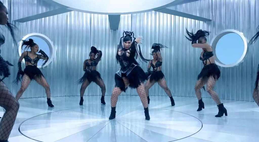 Mais tarde, ela exibe uma coreografia matadora com um sutiã cone de veludo azul personalizado e hot pants com cadarço combinando de Rey Ortiz: uma referência ao corpete acentuador de busto de Jean Paul Gaultier, famoso pela Rainha do Pop Madonna durante sua turnê Blond Ambition de 1990. Cardi até encarna totalmente O Nascimento de Vênus em uma cena, se contorcendo dentro de uma concha com um corpete de porcelana barroca, peças para quadril e pernas e saltos de stripper por Joyce Spakman.