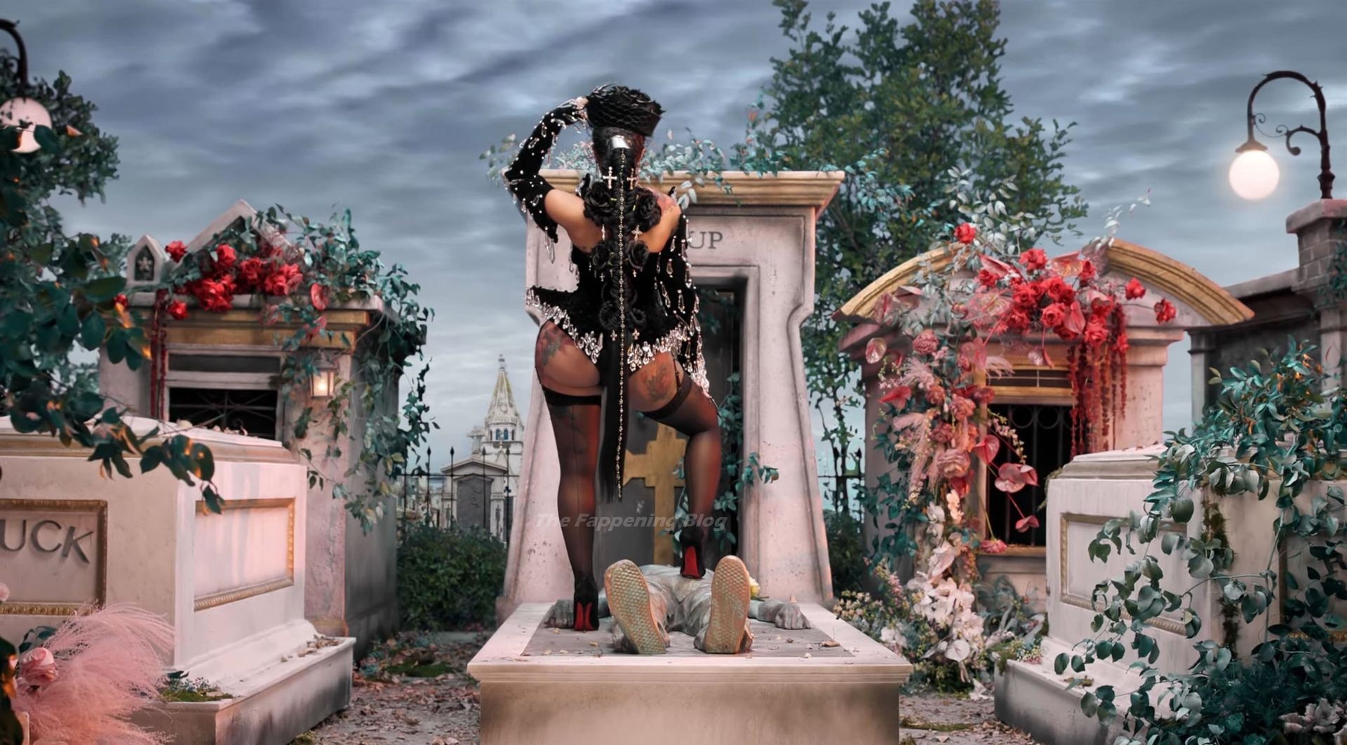 O vídeo começa com Cardi rebolando em um cemitério sobre uma cripta marcada com R.I.P. 2020, vestida com um traje funerário completo cravejado de cristais de lustre, incluindo um véu de rede e seus icônicos sapatos de sola vermelha. A partir daí, as imagens passam por uma montagem vertiginosa de sexo e glamour que inclui ela trocando beijos e se agarrando com várias outras mulheres vestidas de forma provocante.