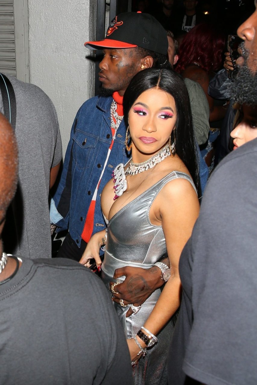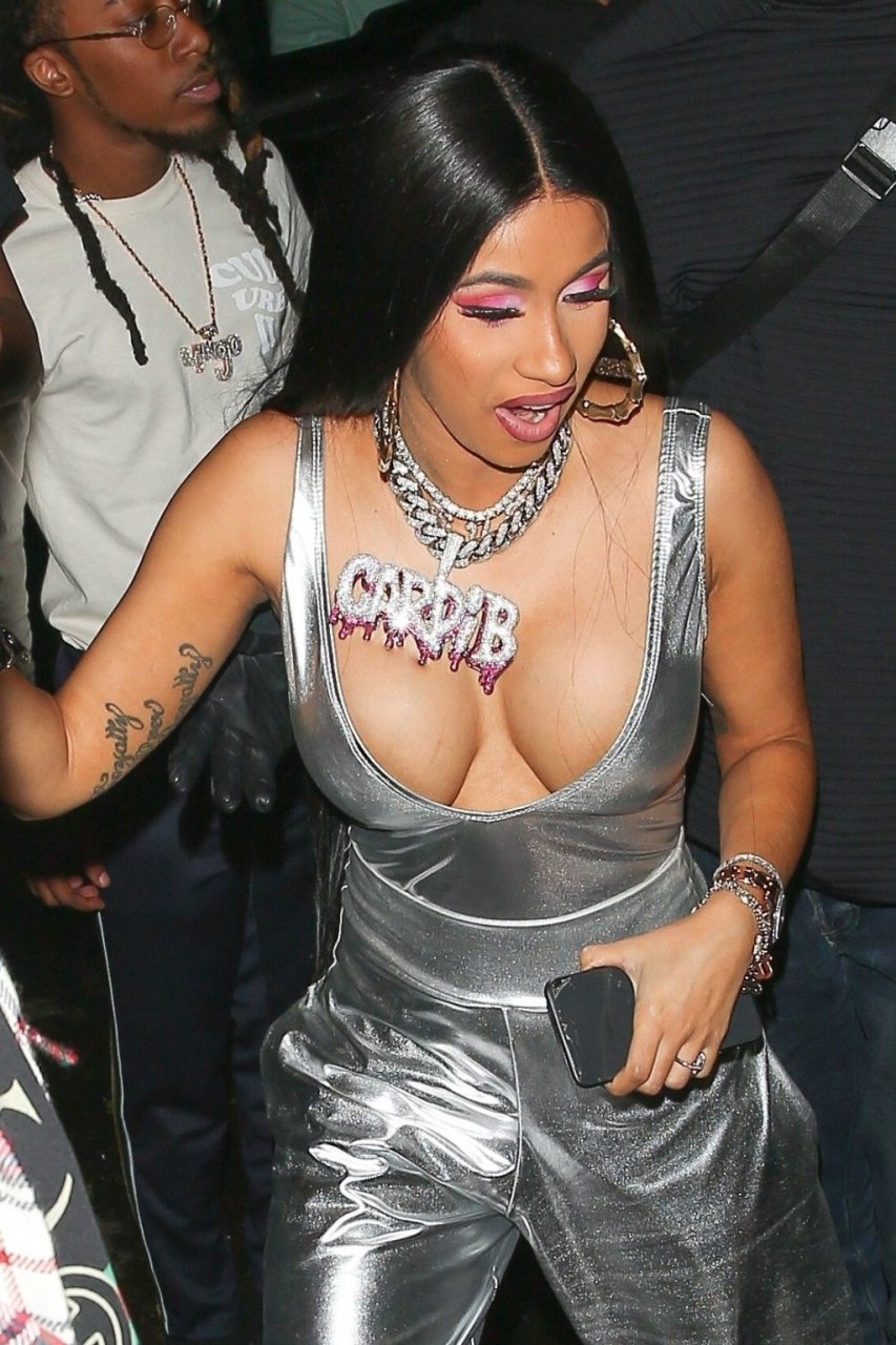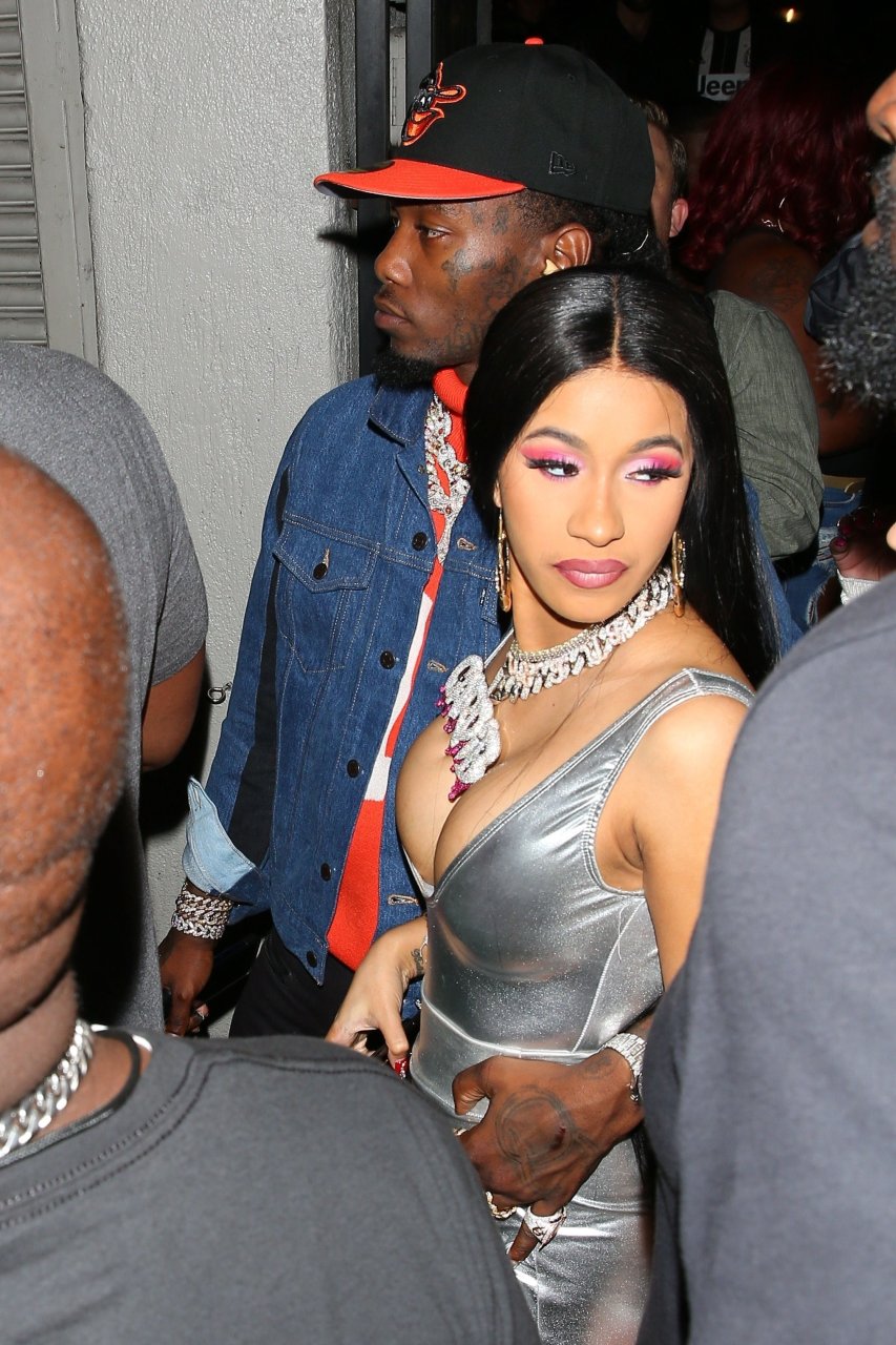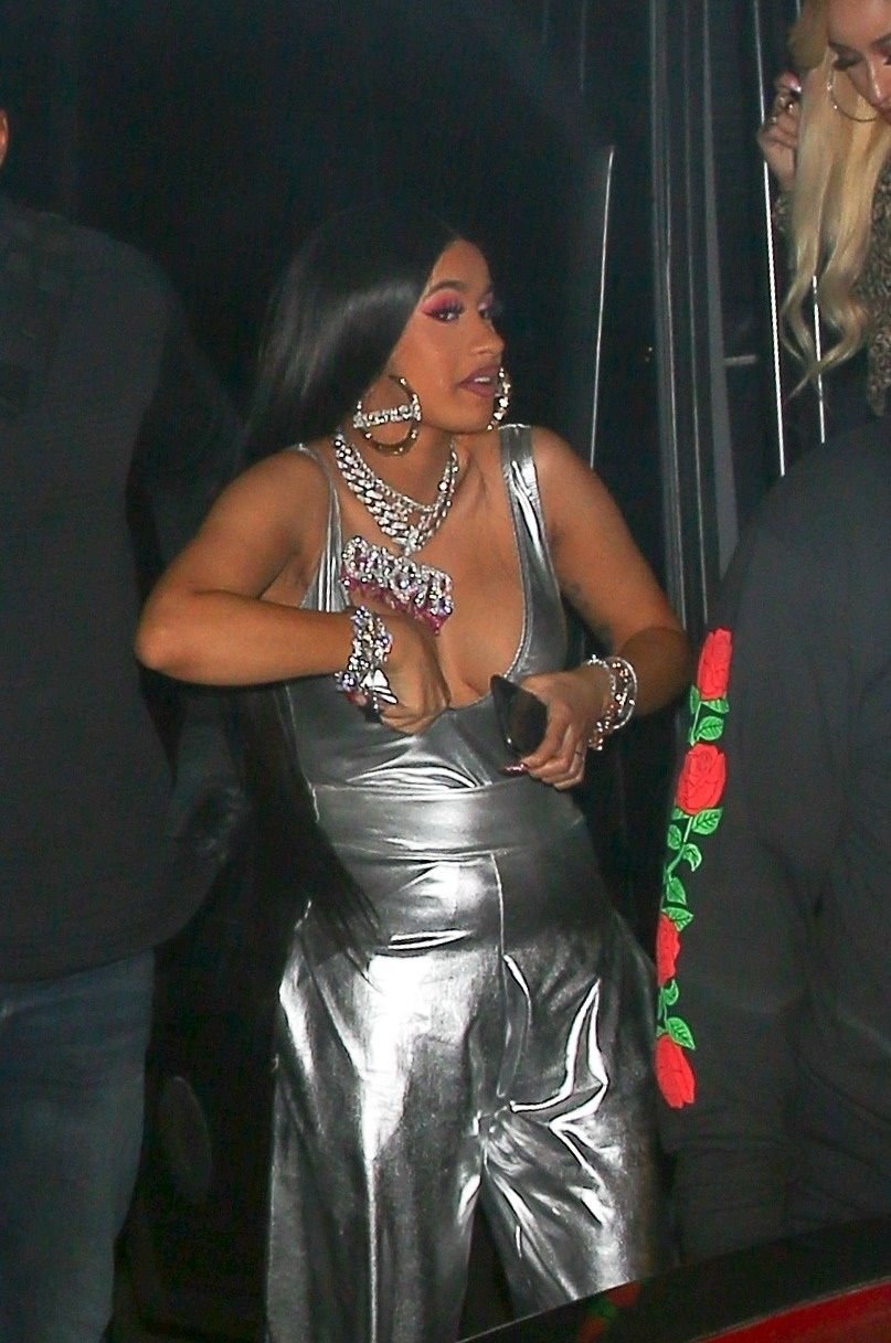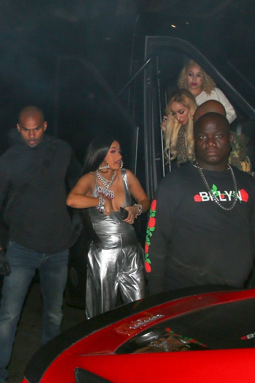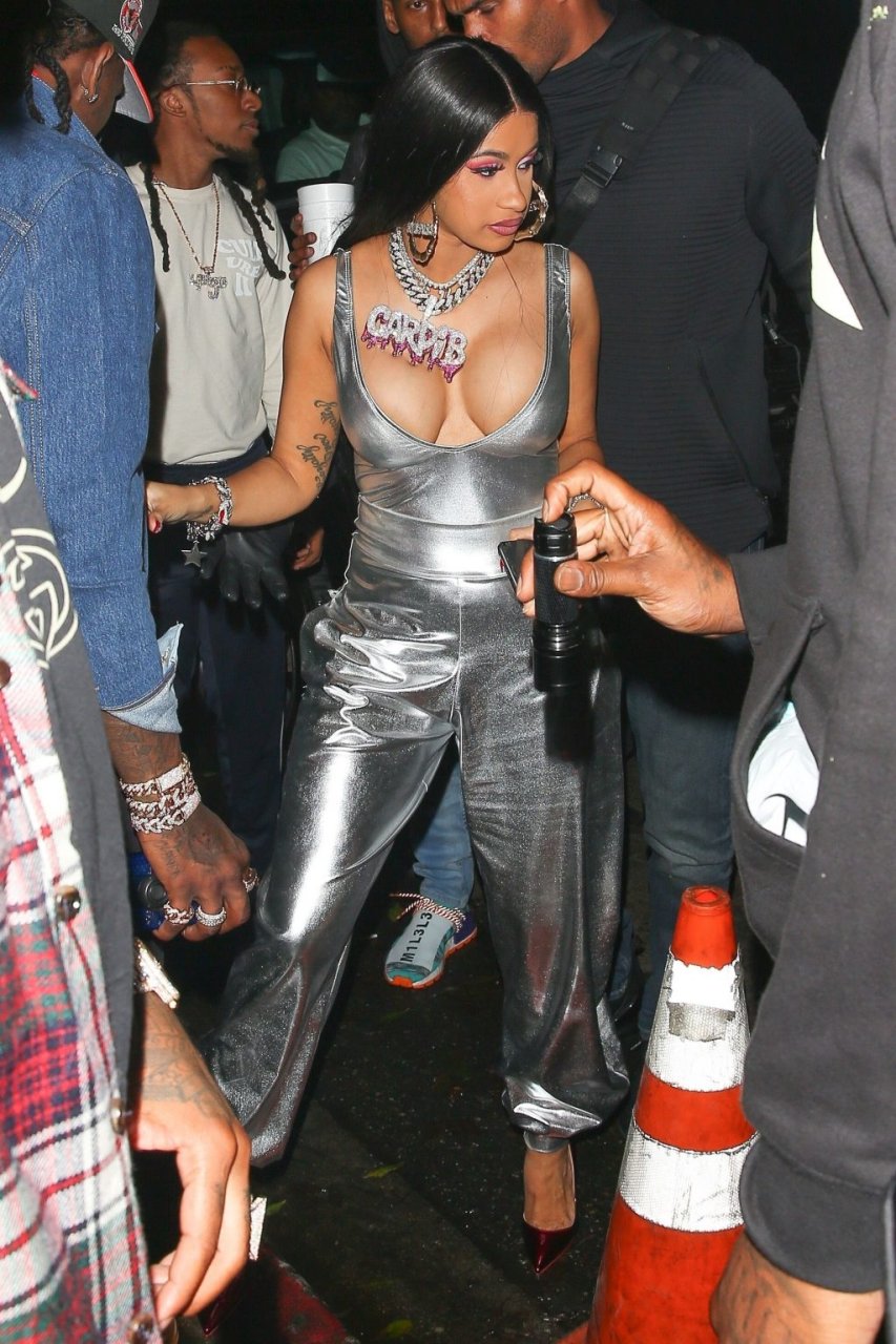 Cardi B e Offset continuam as celebrações de aniversário dela no clube noturno Argyle após o show do Drake no Staple Center em Los Angeles, 14/10/2018. Cardi exibe um brilho sério com seu nome no colar e ostentou suas curvas com um top prateado decotado.