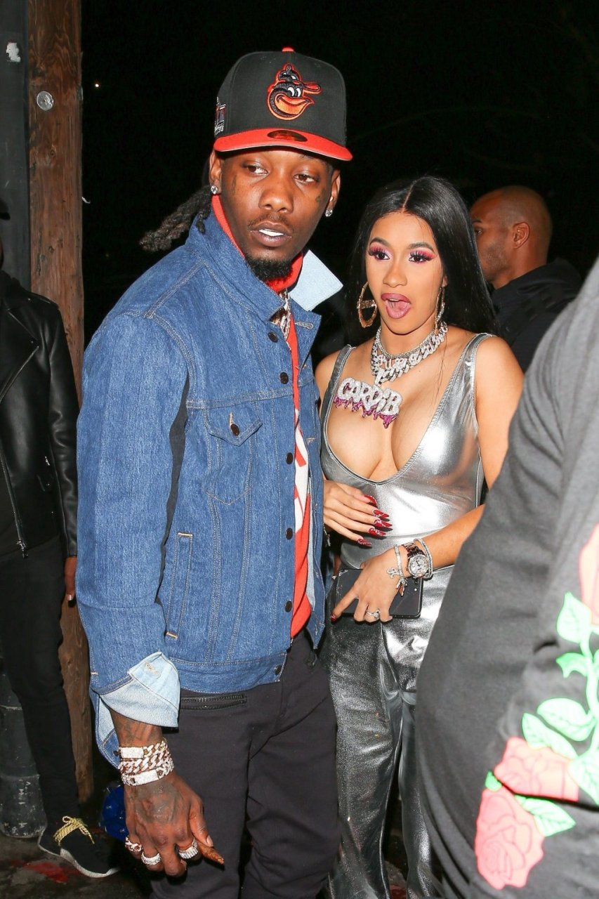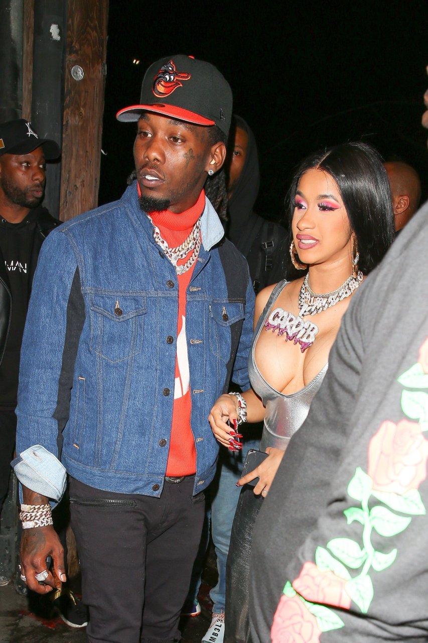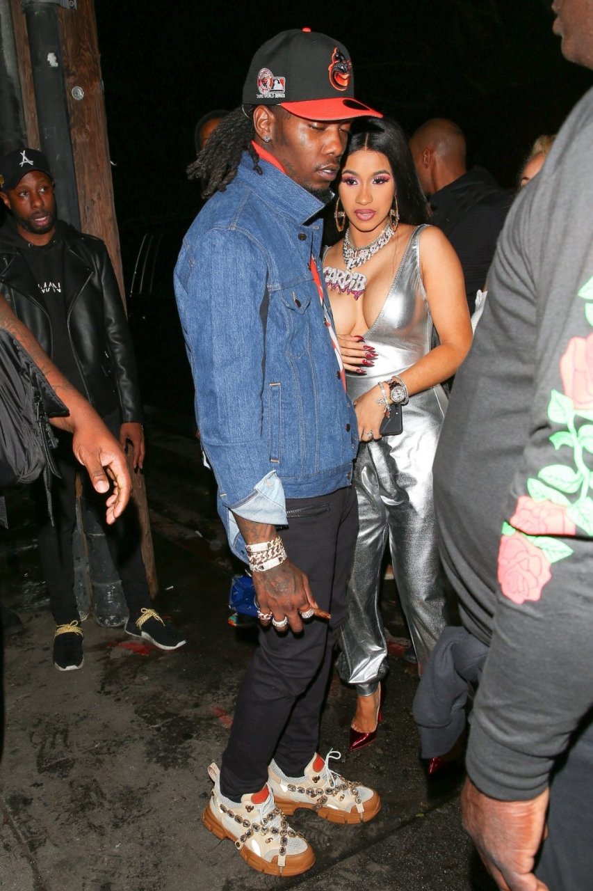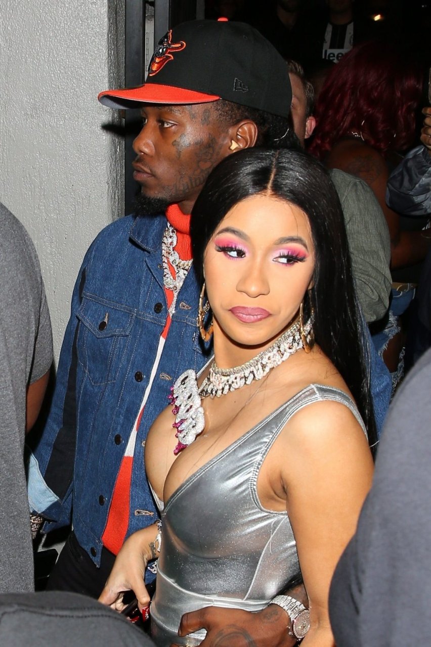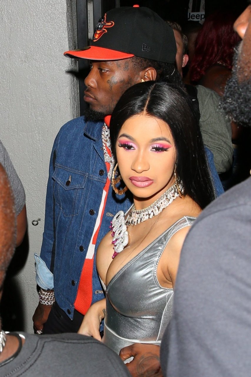 Cardi B e Offset continuam as celebrações de aniversário dela no clube noturno Argyle após o show do Drake no Staple Center em Los Angeles, 14/10/2018. Cardi exibe um brilho sério com seu nome no colar e ostentou suas curvas com um top prateado decotado.