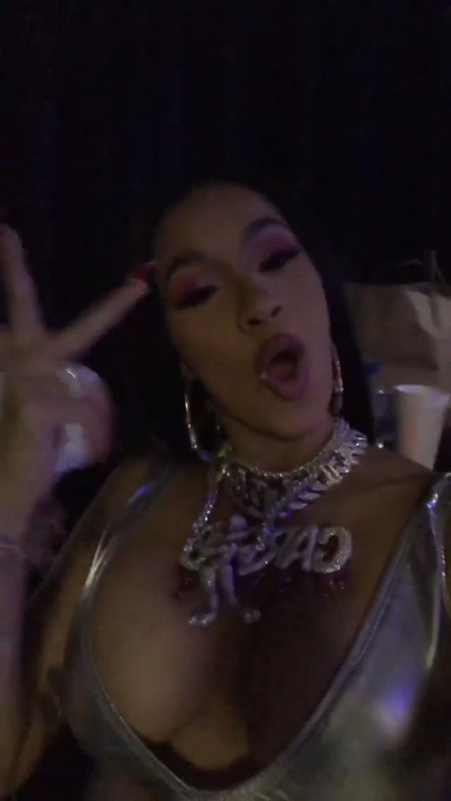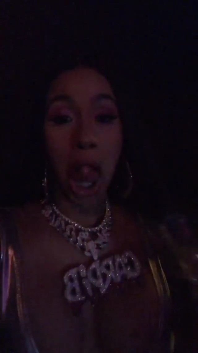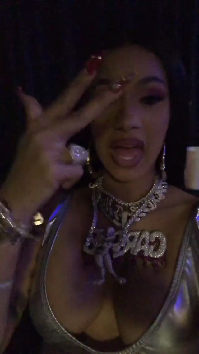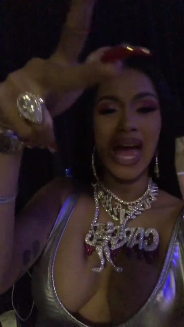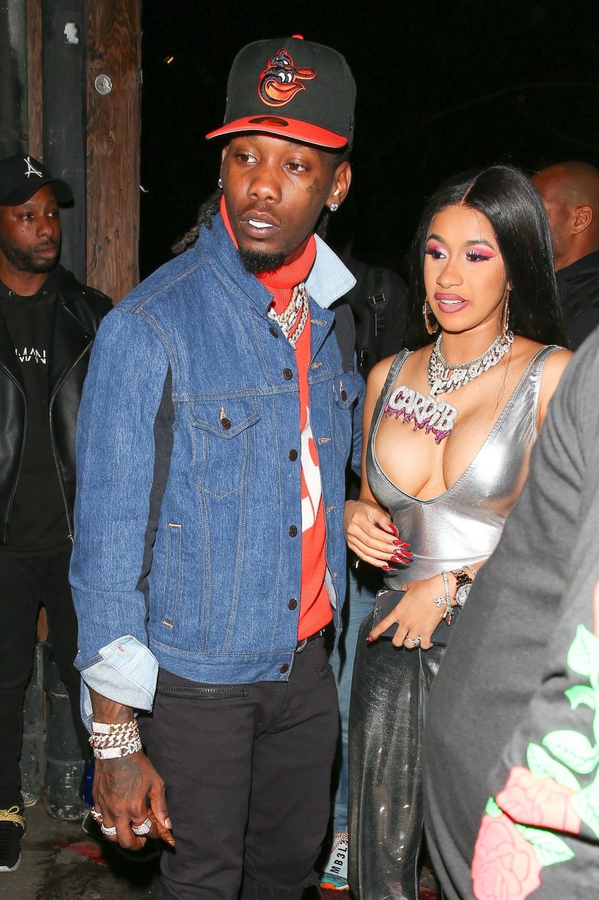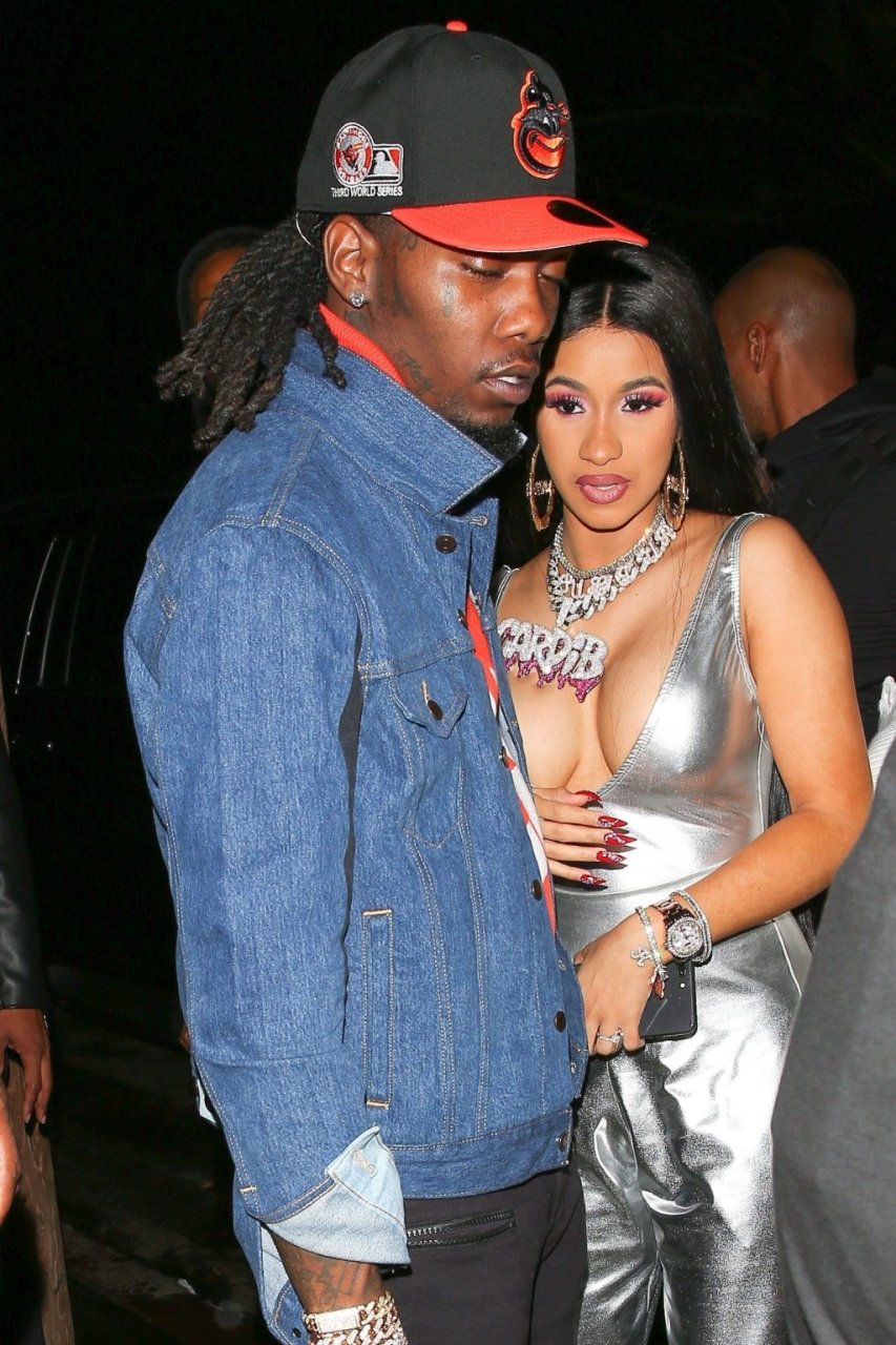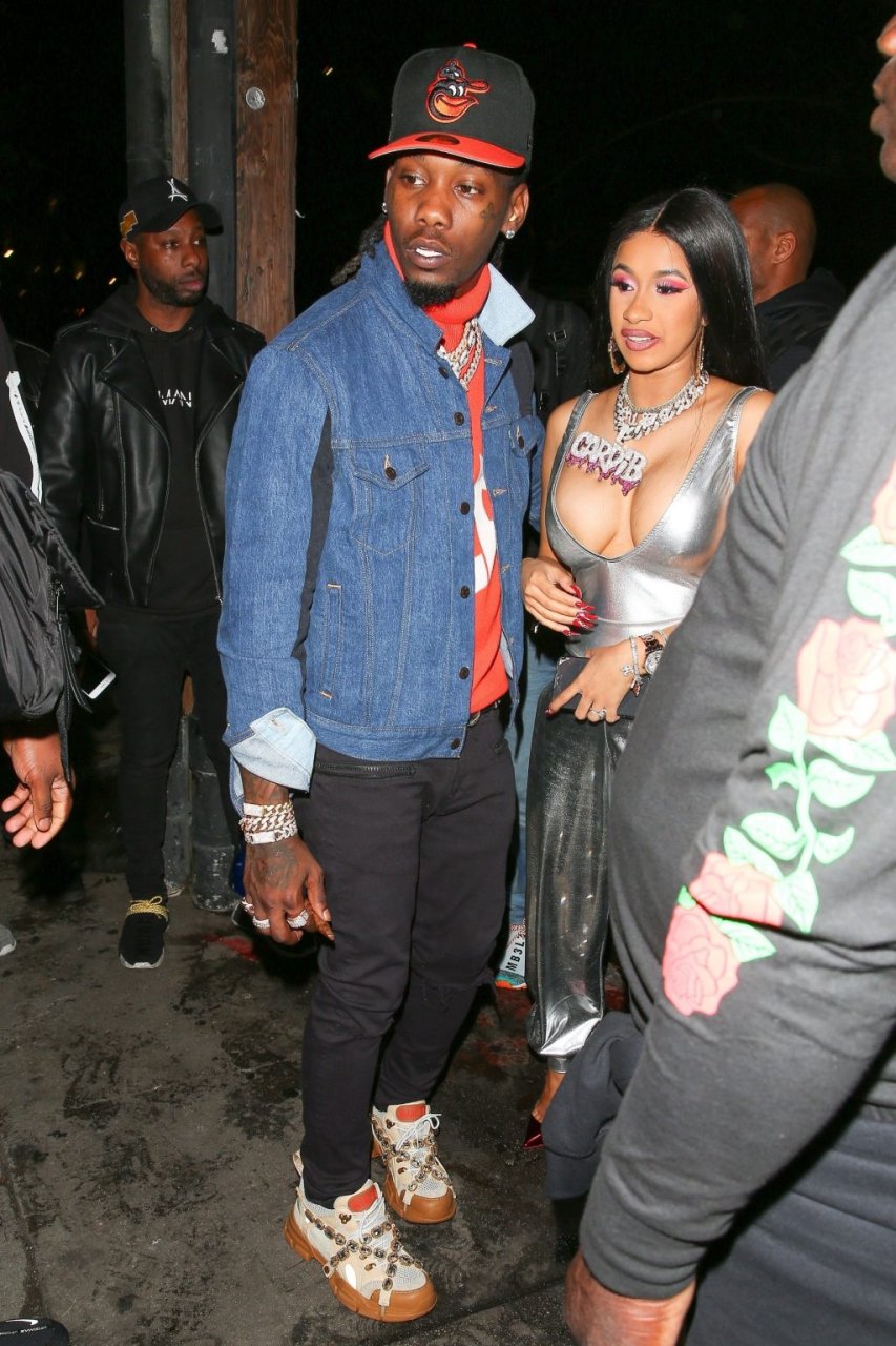 Cardi B e Offset continuam as celebrações de aniversário dela no clube noturno Argyle após o show do Drake no Staple Center em Los Angeles, 14/10/2018. Cardi exibe um brilho sério com seu nome no colar e ostentou suas curvas com um top prateado decotado.