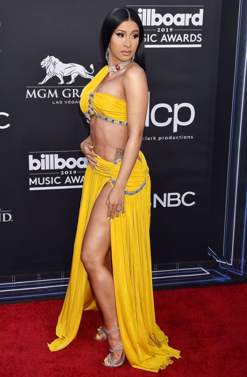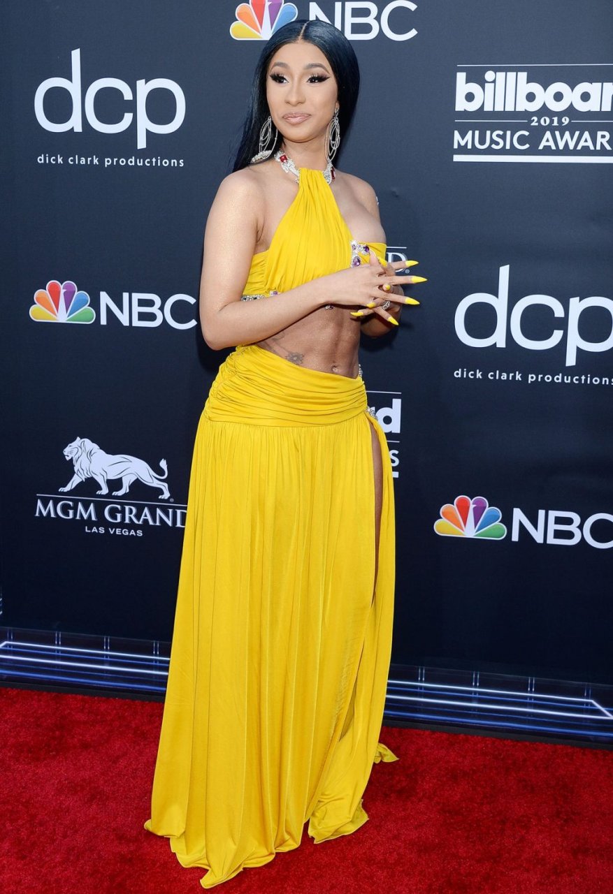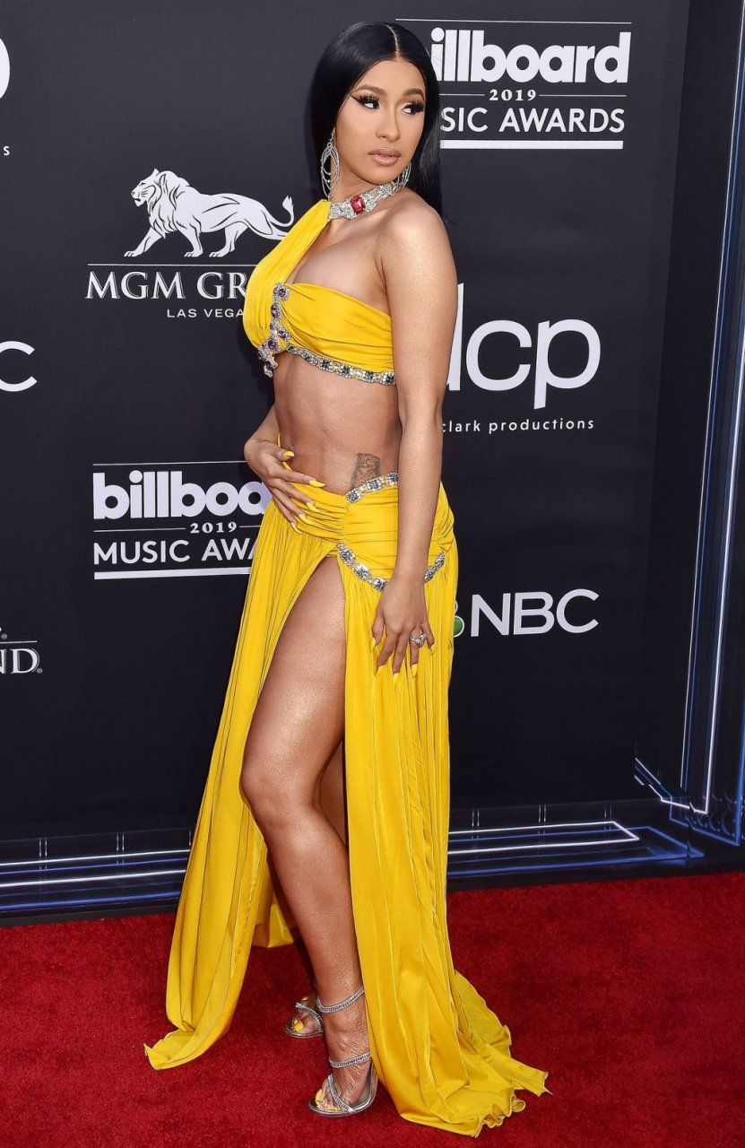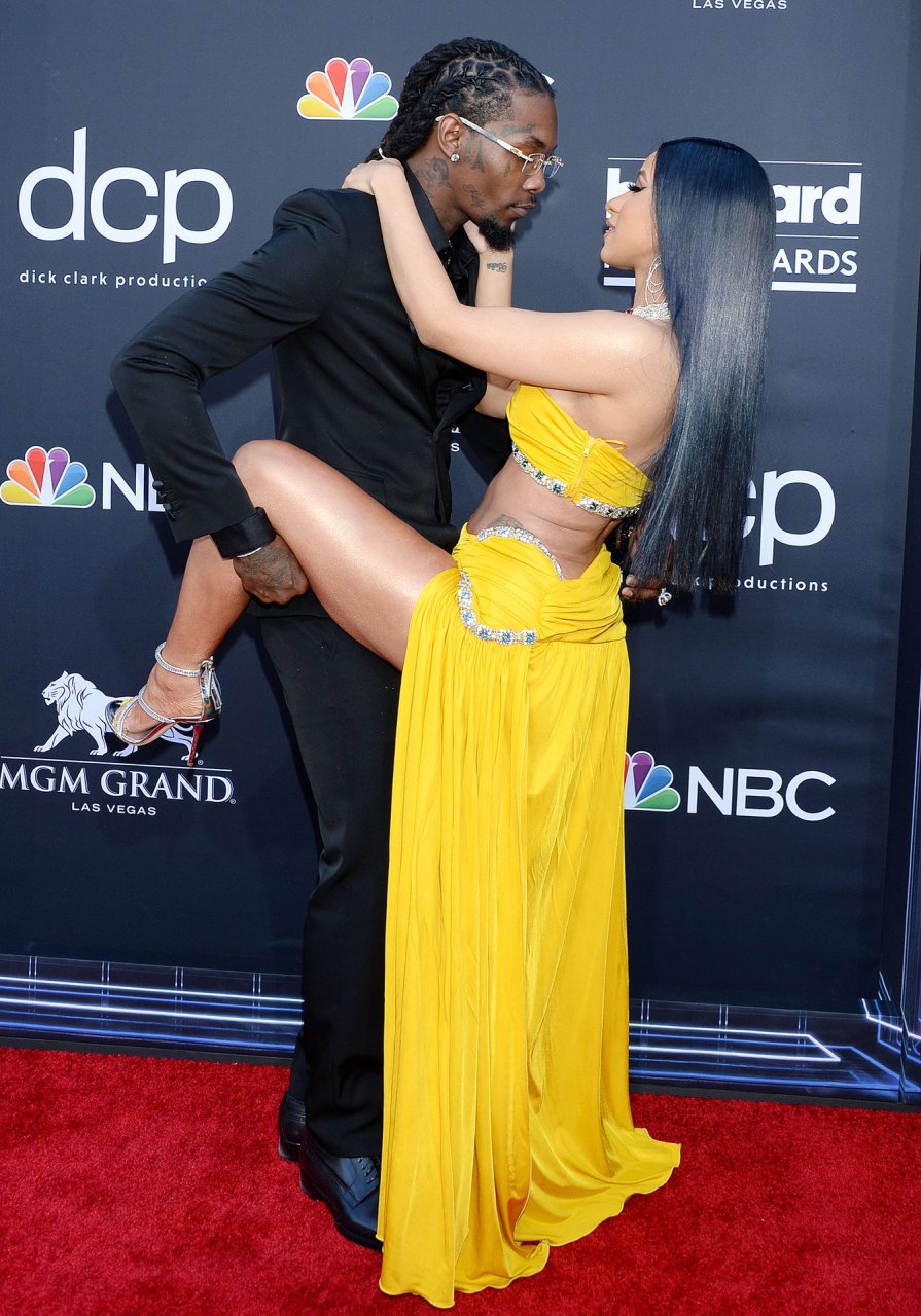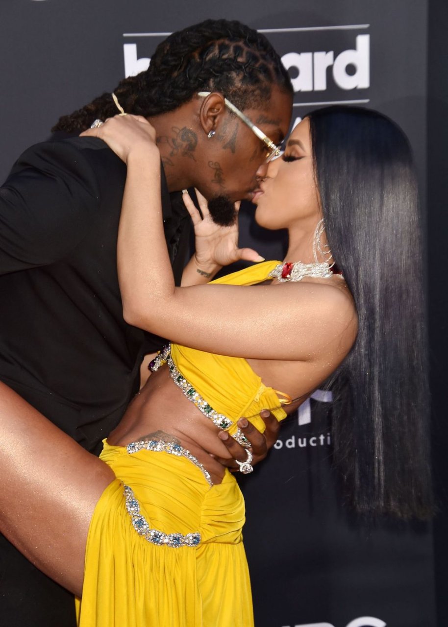 Cardi B impressiona com um vestido amarelo no tapete vermelho beijando Offset no Billboard Music Awards 2019 na MGM Grand Garden Arena em Las Vegas, 01/05/2019.