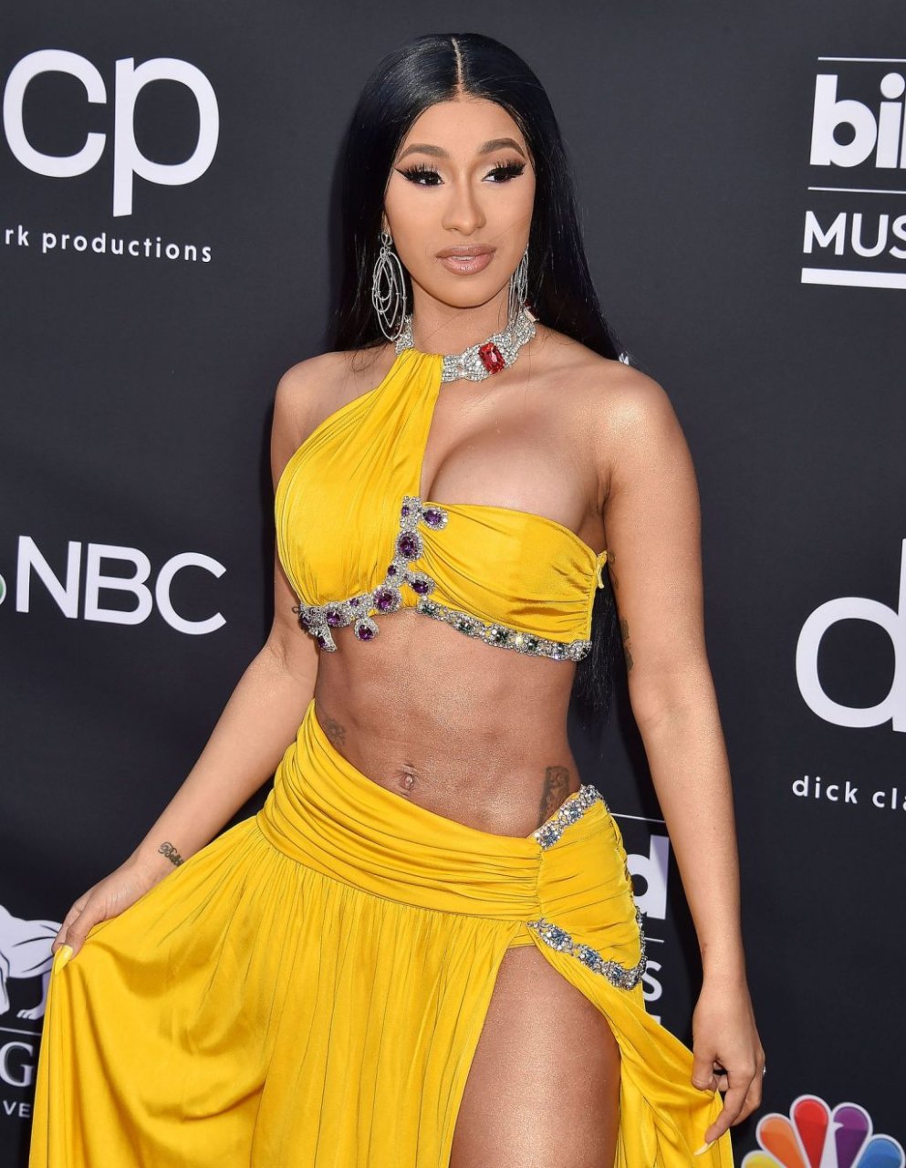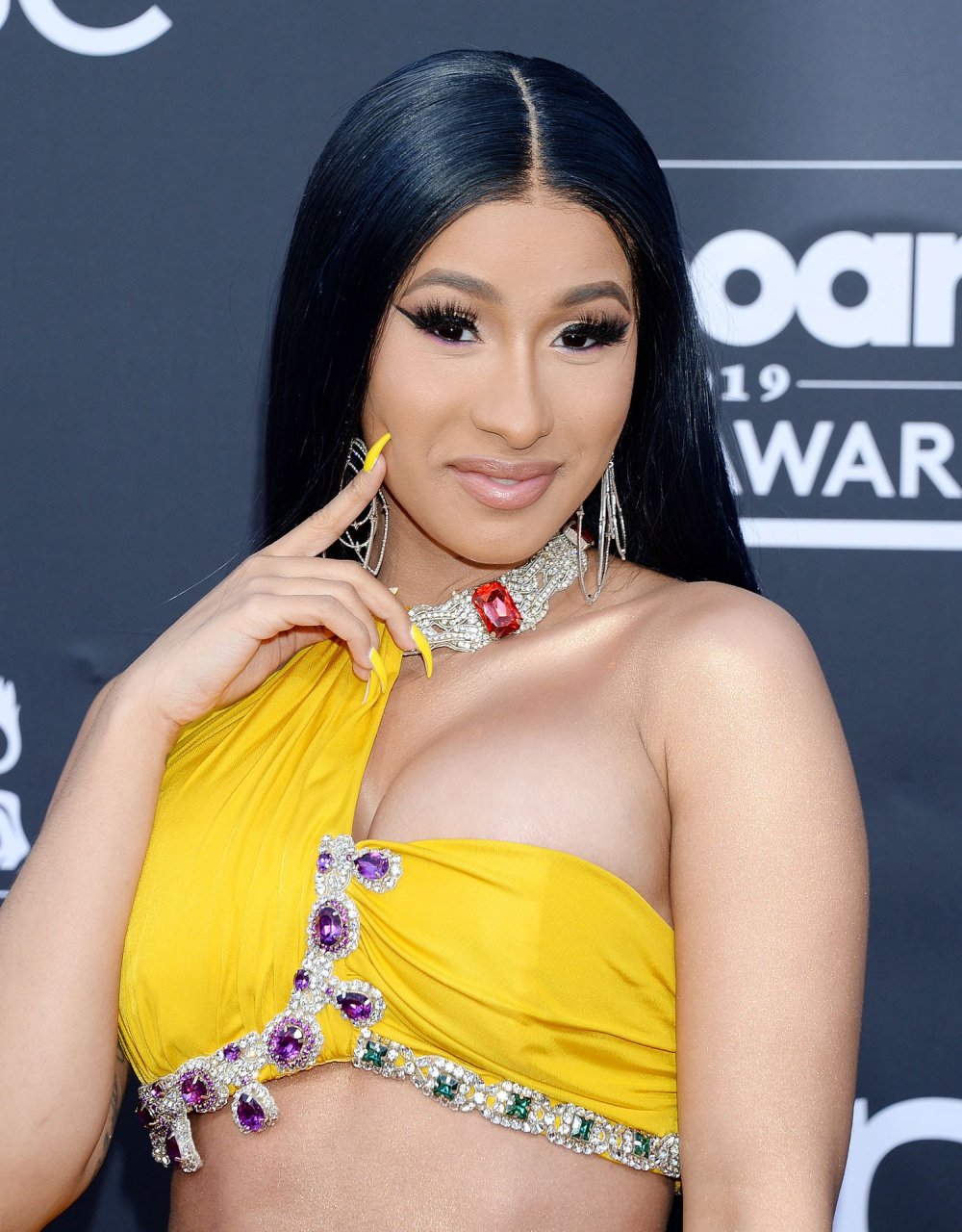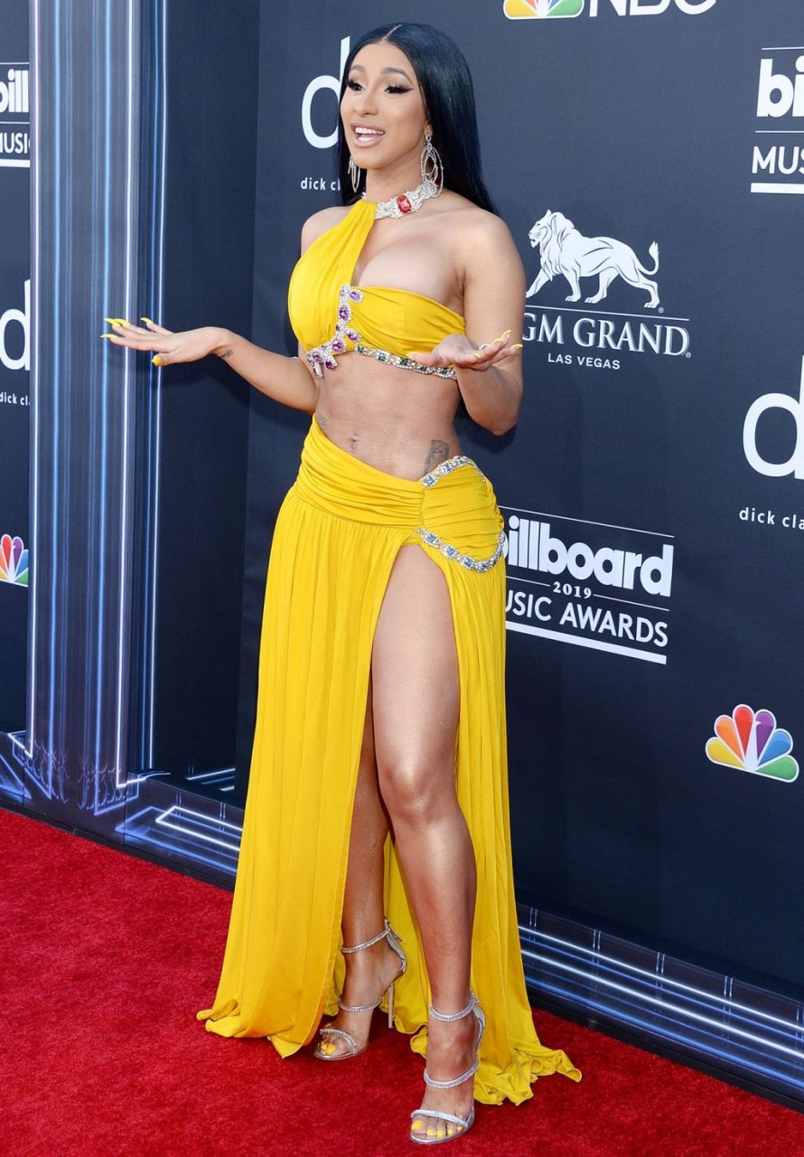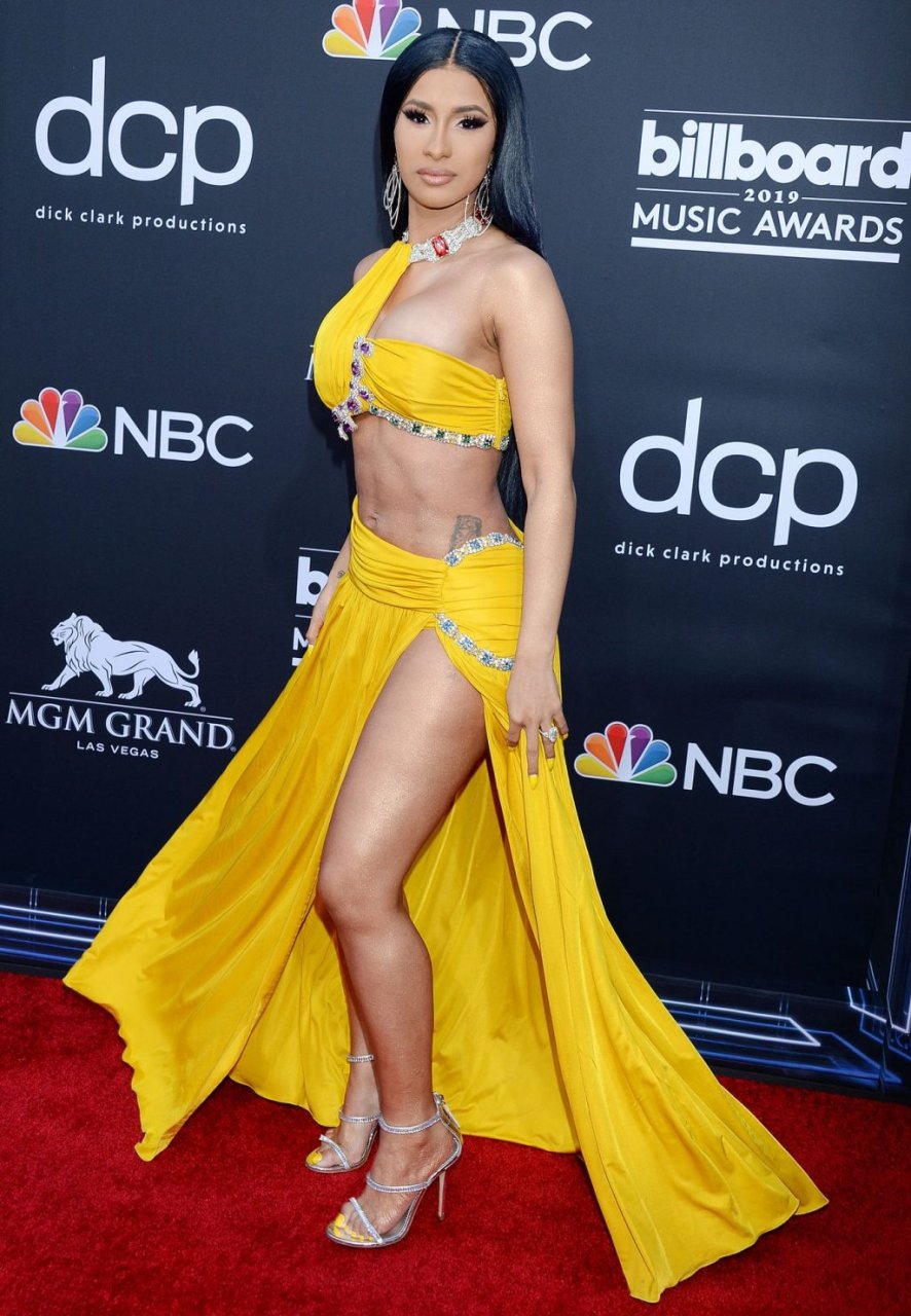 Cardi B impressiona com um vestido amarelo no tapete vermelho beijando Offset no Billboard Music Awards 2019 na MGM Grand Garden Arena em Las Vegas, 01/05/2019.