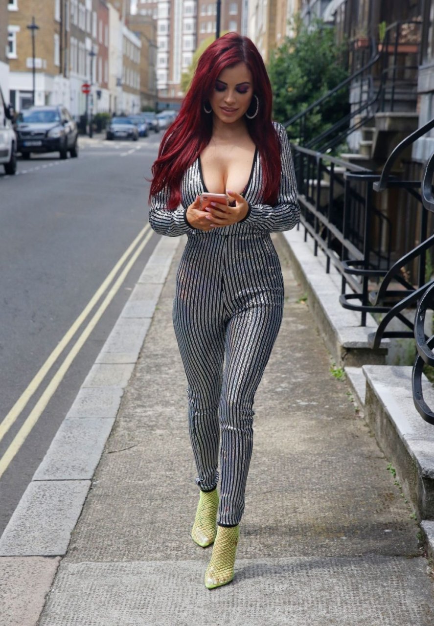 A modelo da Playboy Carla Howe foi vista em Londres usando um macacão listrado bicolor que mostrava seu amplo decote, 18/07/2019.