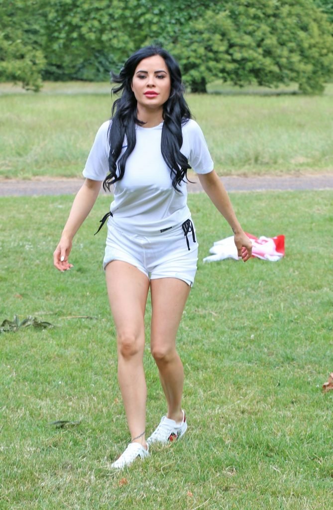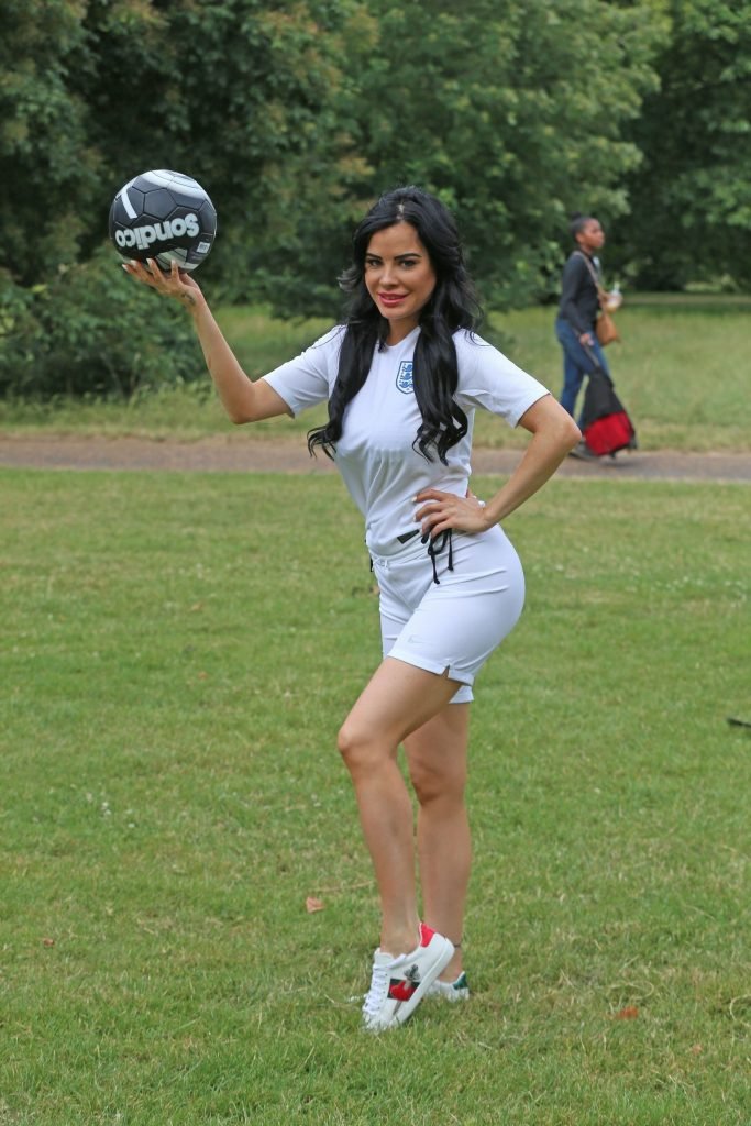 Modelo da Playboy, Carla Howe (28) exibe seus seios enquanto segura uma bandeira da Inglaterra mostrando seu apoio à equipe na Copa do Mundo de 2018 na Rússia, Londres, 18/06/2018.