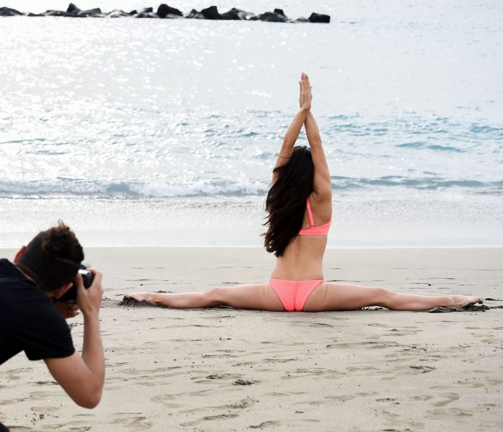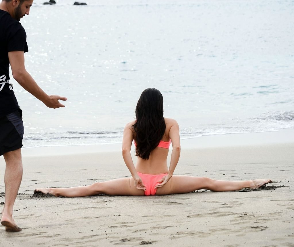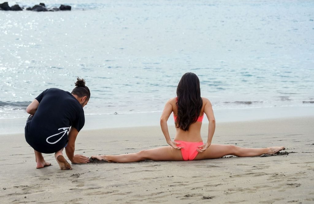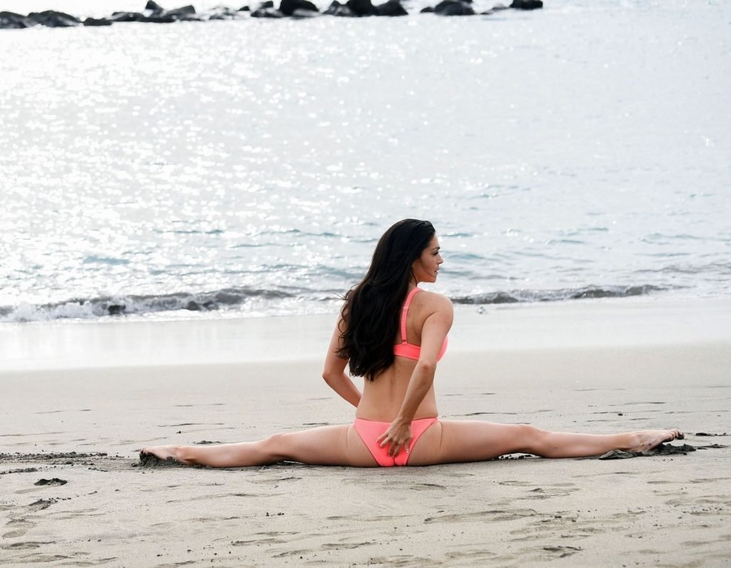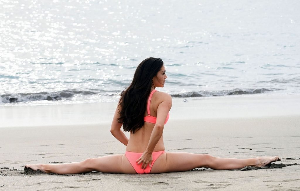 A estrela do reality mostra sua incrível perda de peso de 4 pedras em um biquíni laranja. Casey, que é professora qualificada de yoga, exibe sua flexibilidade fazendo a divisão na praia.