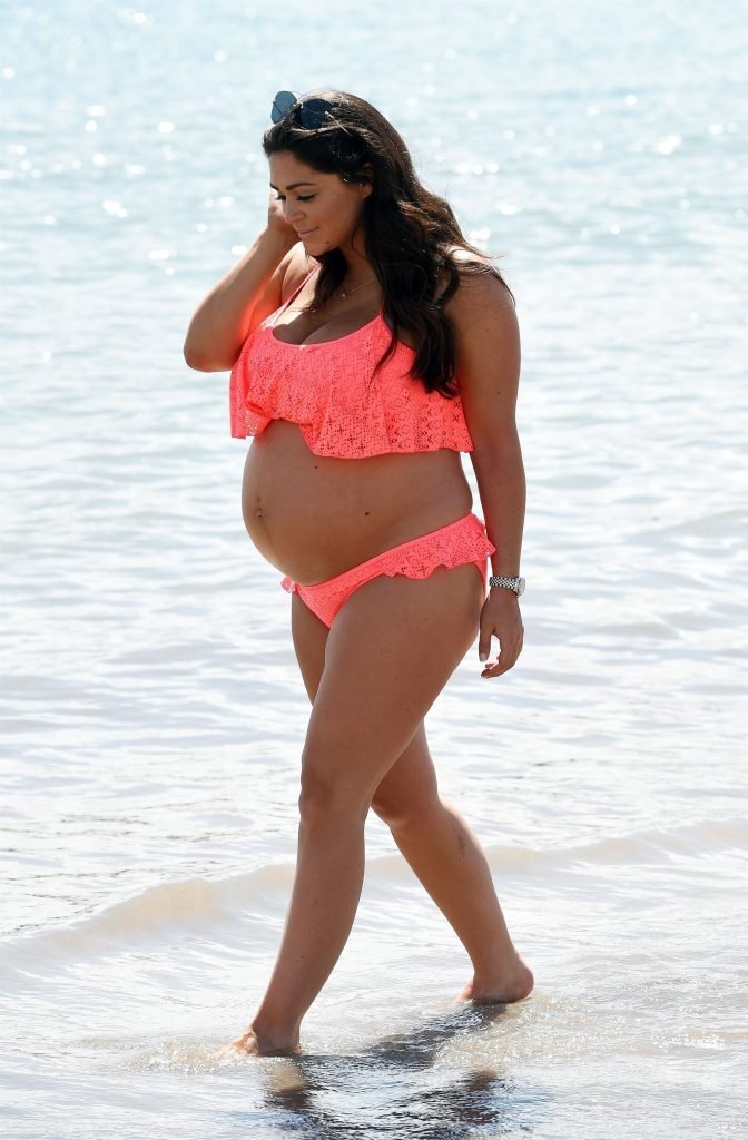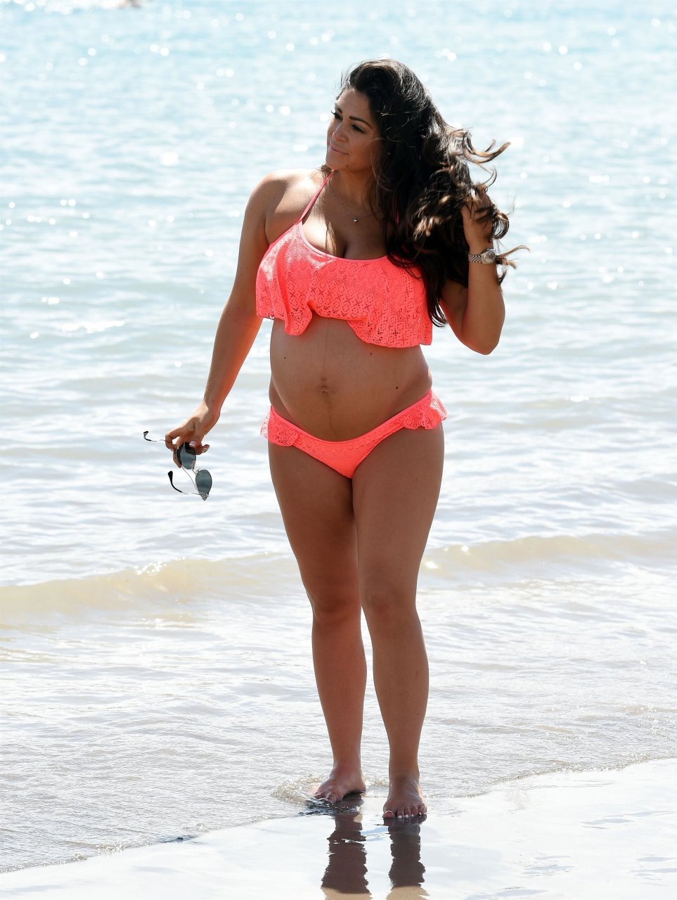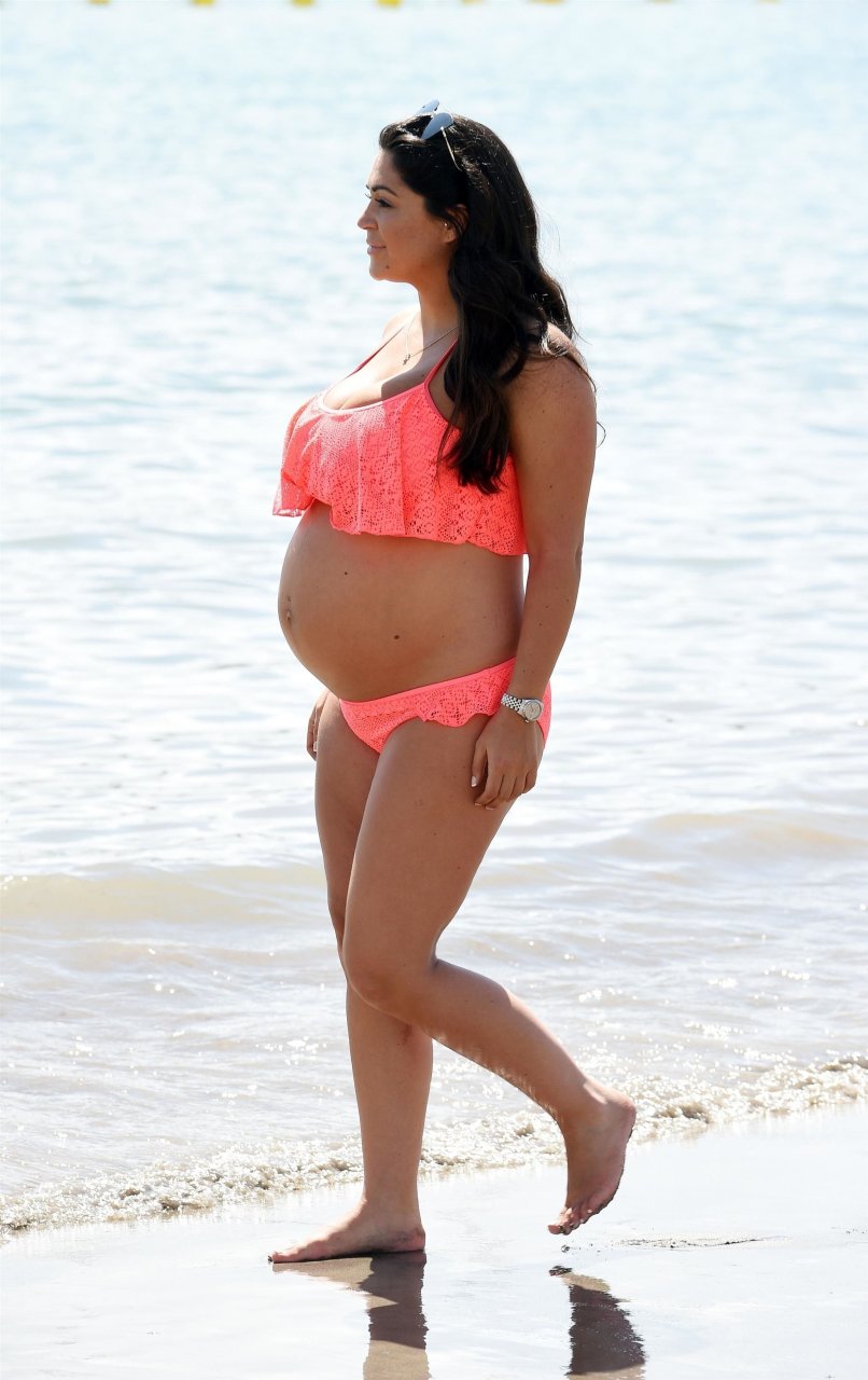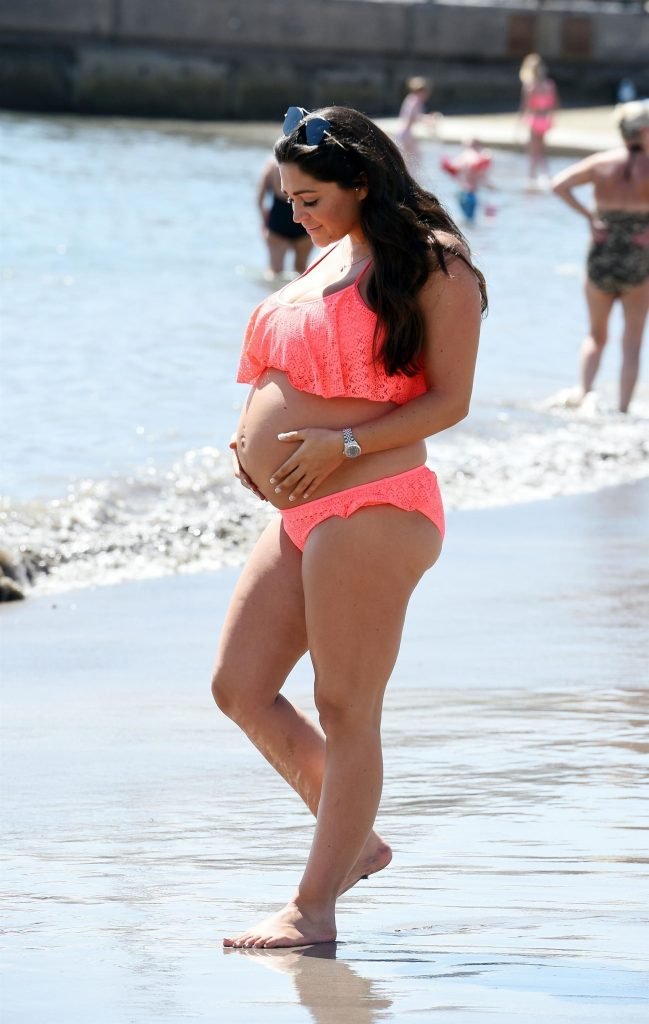 Casey Batchelor, fortemente grávida, é vista na praia em Lanzarote, Espanha, 11/04/2018. A estrela de 33 anos do Celebrity Big Brother exibe orgulhosamente suas curvas em um biquíni laranja na praia.