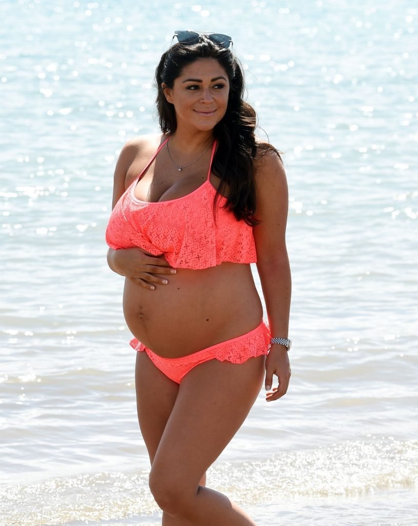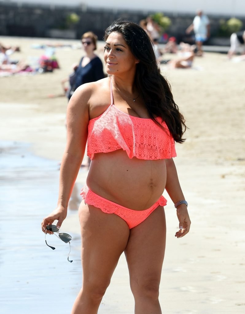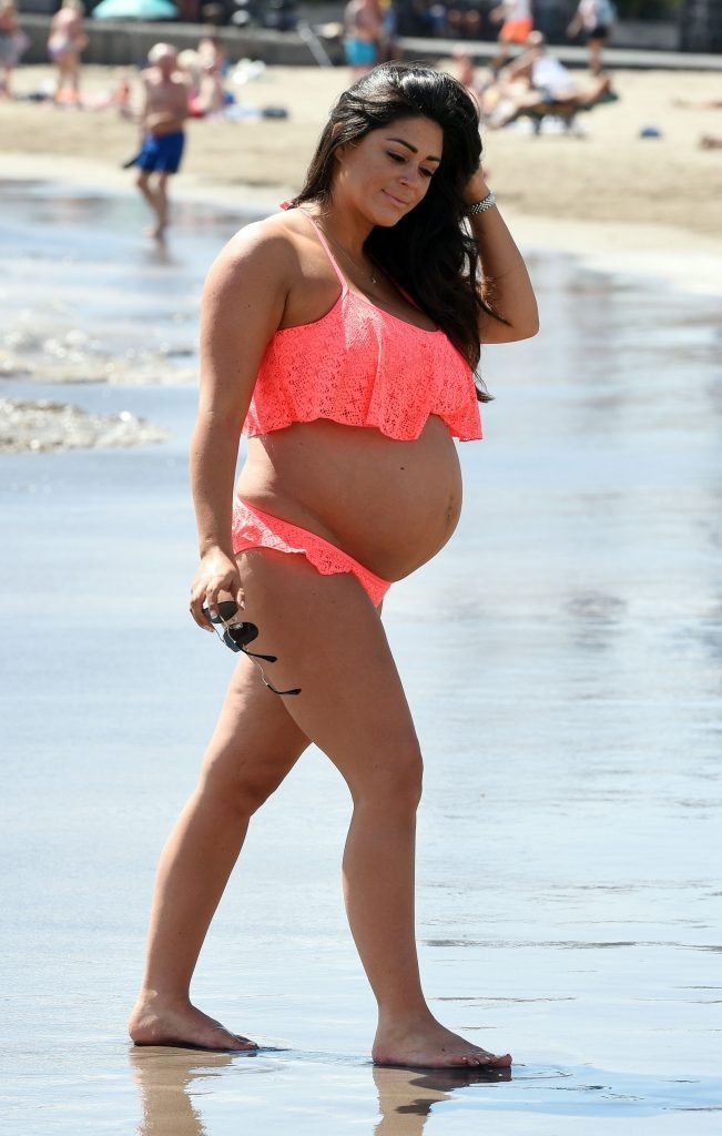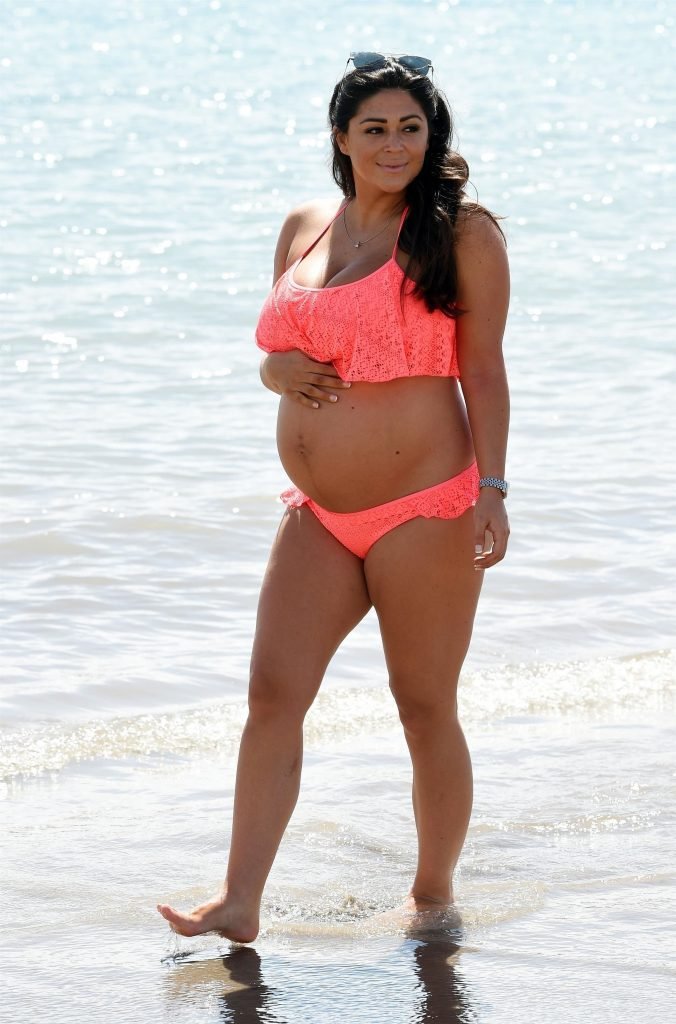Casey Batchelor, fortemente grávida, é vista na praia em Lanzarote, Espanha, 11/04/2018. A estrela de 33 anos do Celebrity Big Brother exibe orgulhosamente suas curvas em um biquíni laranja na praia.