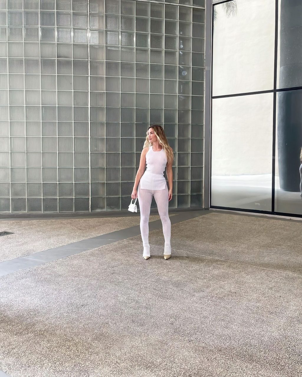 Cassandre ‘Casi’ Davis posa sem sutiã com uma blusa branca transparente de manga longa dupla, mostrando seus seios e bumbum nus – Instagram (maio de 2021).