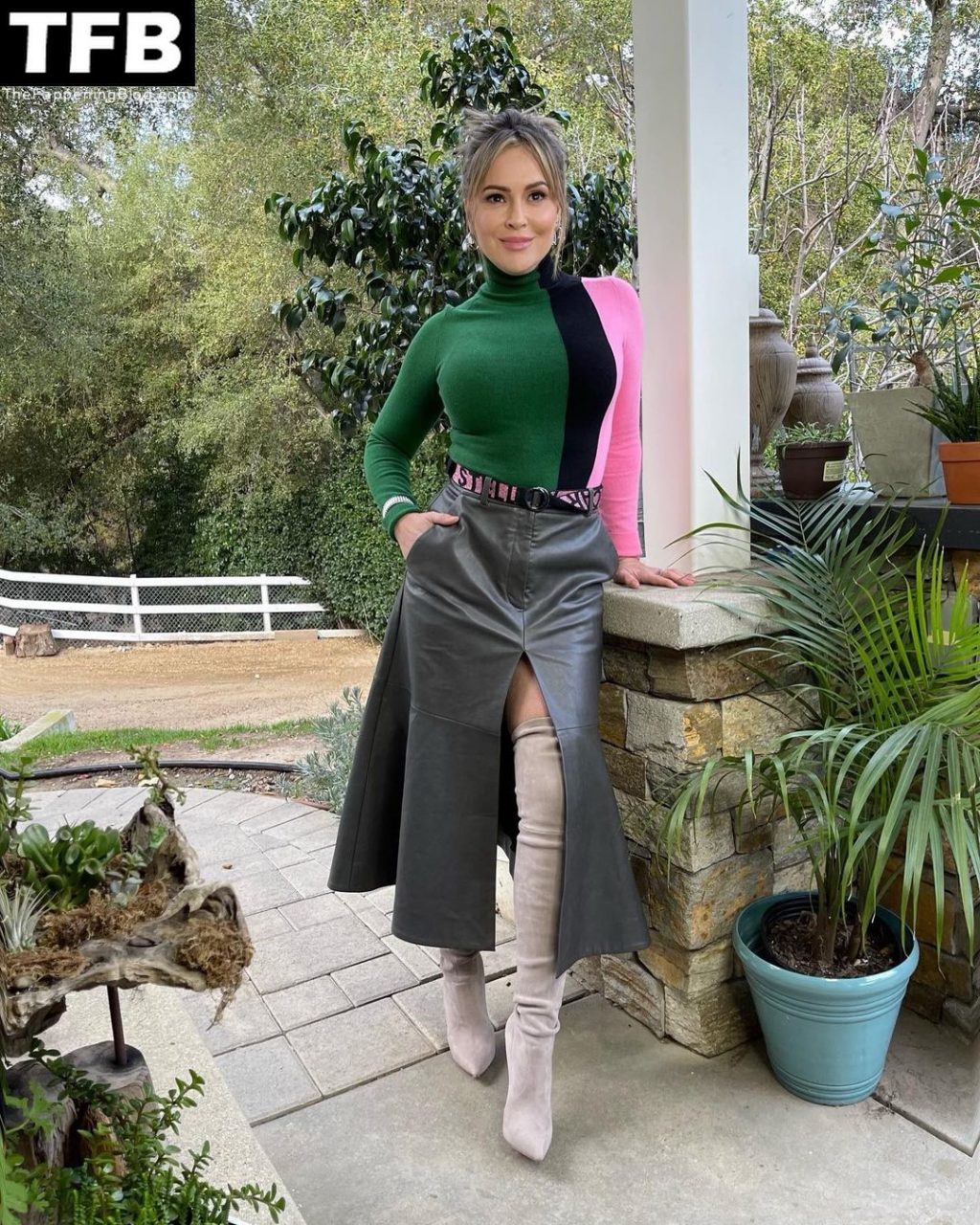 Atriz Alyssa Milano provoca os fãs com seus grandes seios sexy em um novo ensaio de moda nas redes sociais para “The View” (janeiro de 2021).