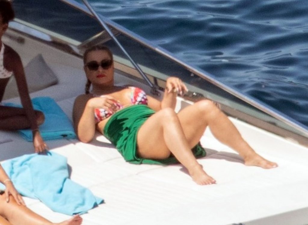 Anastacia e alguns amigos próximos chegam a Positano antes de um dia divertido sob o sol, 07/09/2018. A cantora loira de 49 anos usava um biquíni colorido com uma saída de praia verde por cima.