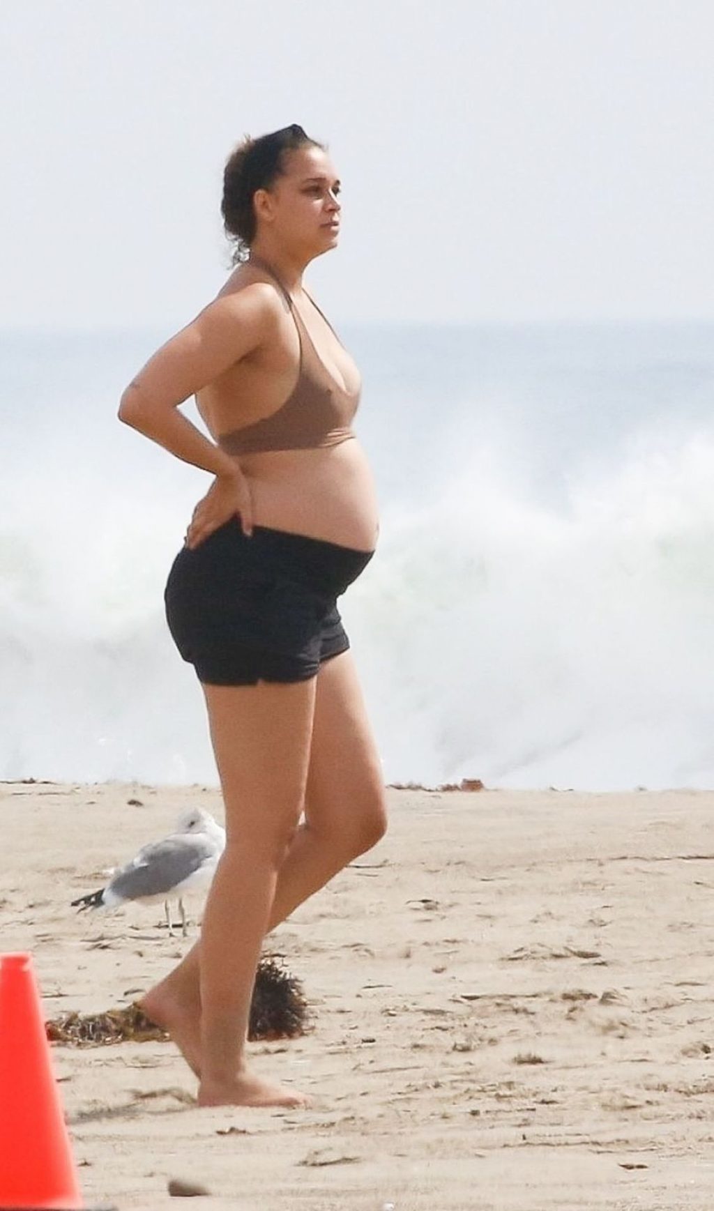 A grávida April Love Geary exibe sua barriga de bebê crescente enquanto aproveita um dia na praia com seu marido Robin Thicke em Malibu, 05/10/2020.