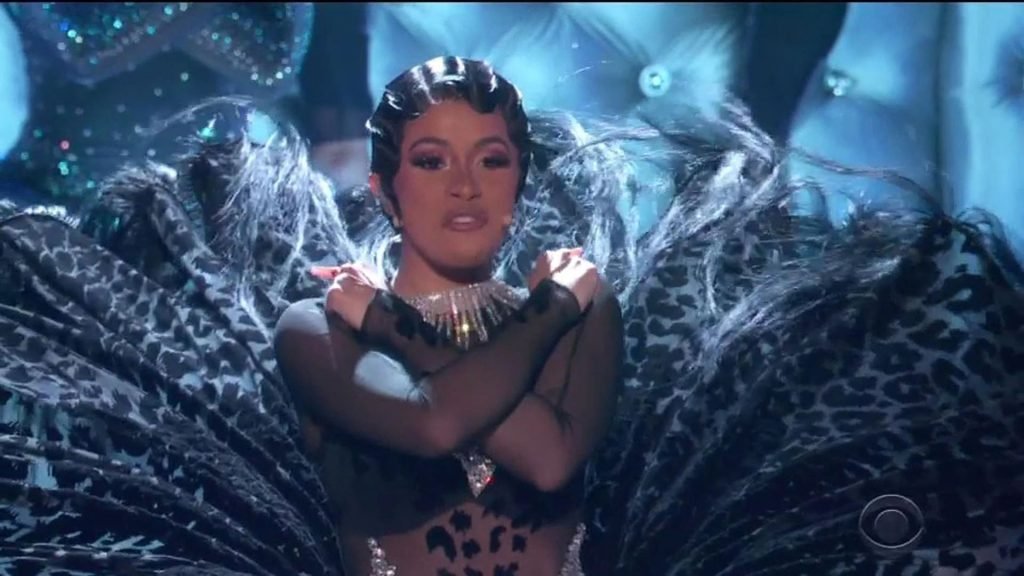 Cardi B supera um problema no figurino envolvendo um colar de diamantes enquanto se apresentava no Grammy Awards, 10/02/2019.